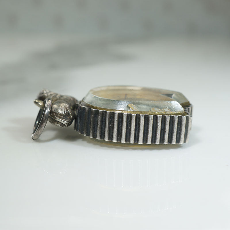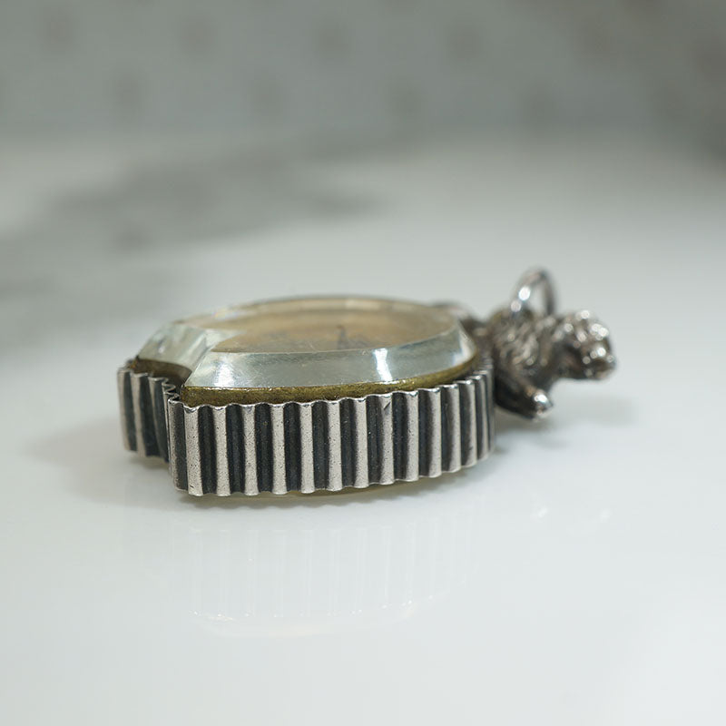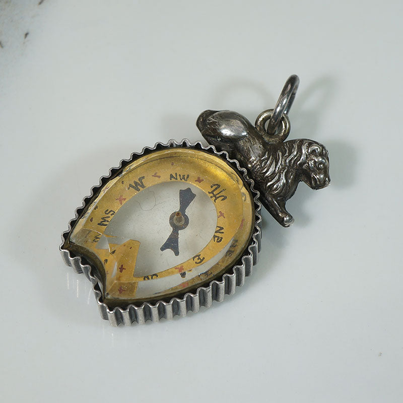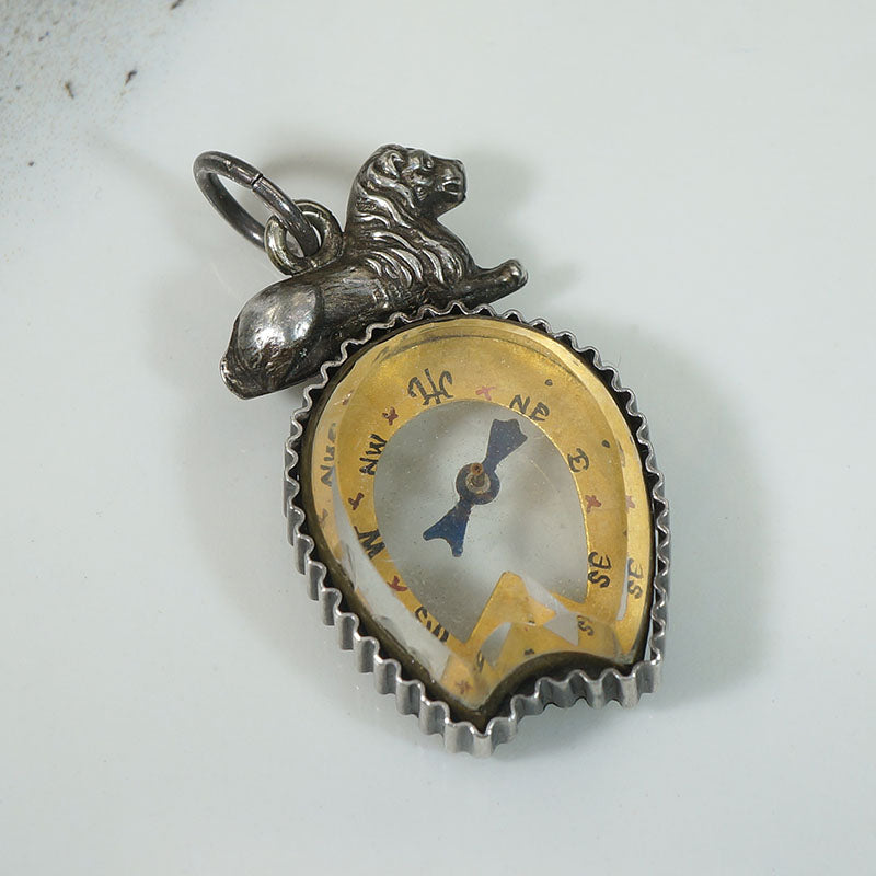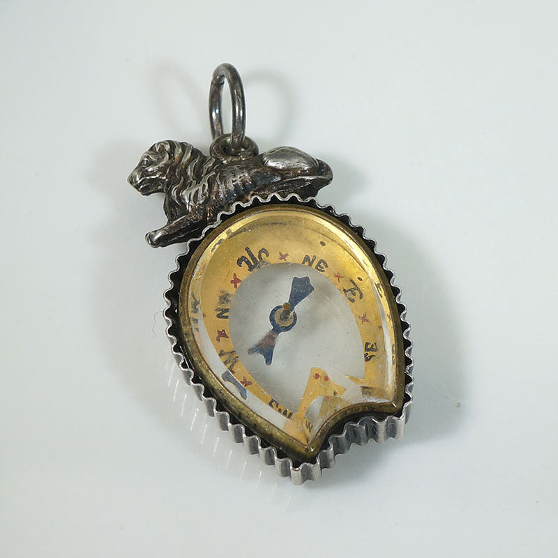 An unusual combination of motifs gives this Victorian compass fob a unique charm. The compass is horseshoe-shaped, and its hand-painted dial is visible from both sides, displayed under the beveled crystal. A corrugated silver band frames the crystal. A small silver lion, sculpted in three dimensions, reclines across the top of the fob. A jump ring has been attached so you can hang this interesting piece from the watch hook on your favorite Ancient Influences married chain. Circa 1880.