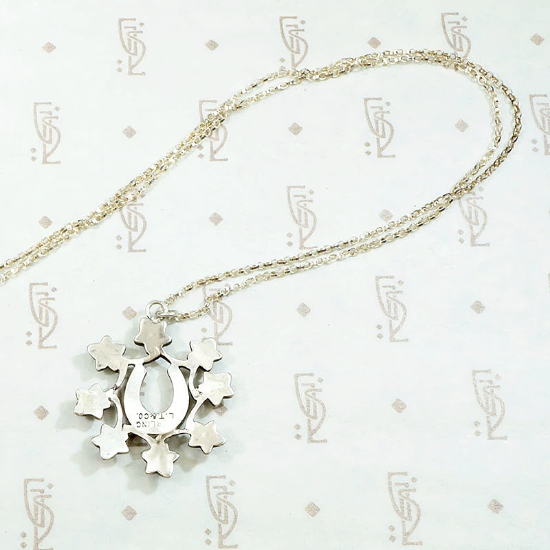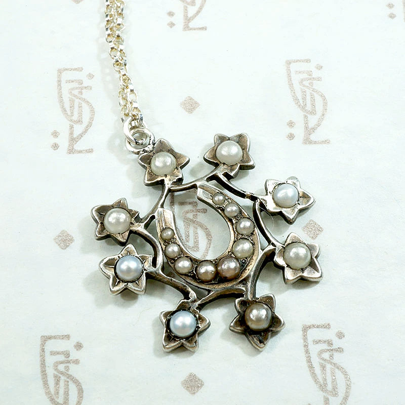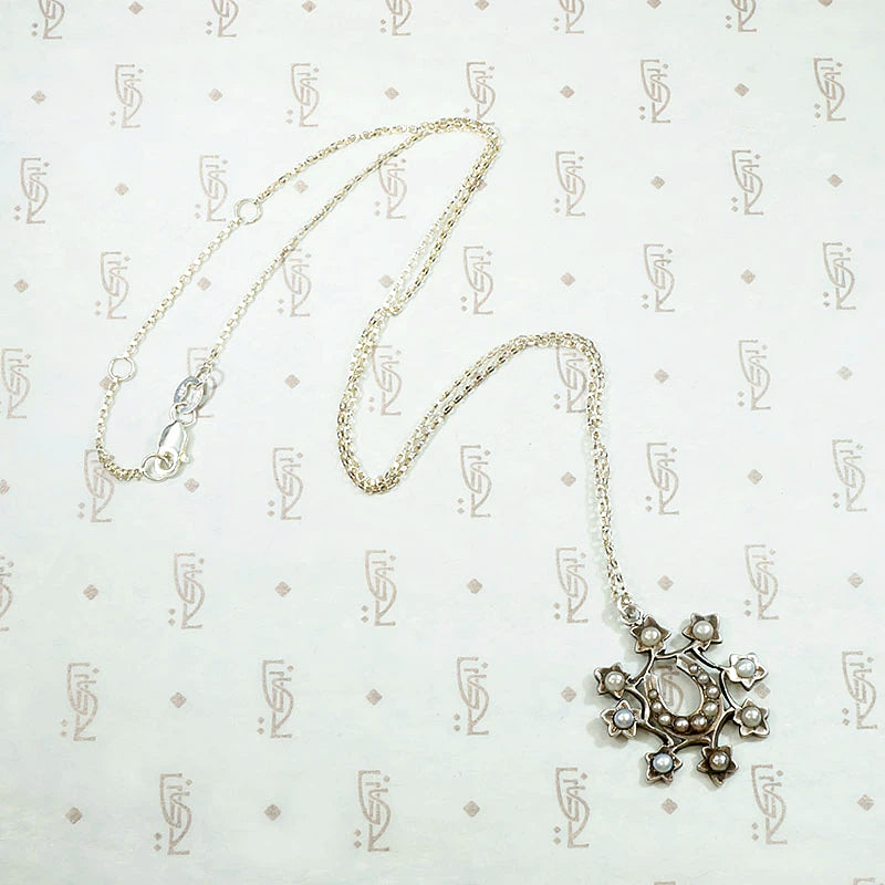 A charming necklace in the form of a horseshoe at the center of a wreath of flowers. The pendant is sterling silver set with half pearls. The back of the pendant is marked "sterling" and "L.T. & Co." Originally an antique brooch circa 1890, it was converted into a pendant by our metalsmith. The recycled sterling silver chain is a modern addition with a lobster claw clasp.