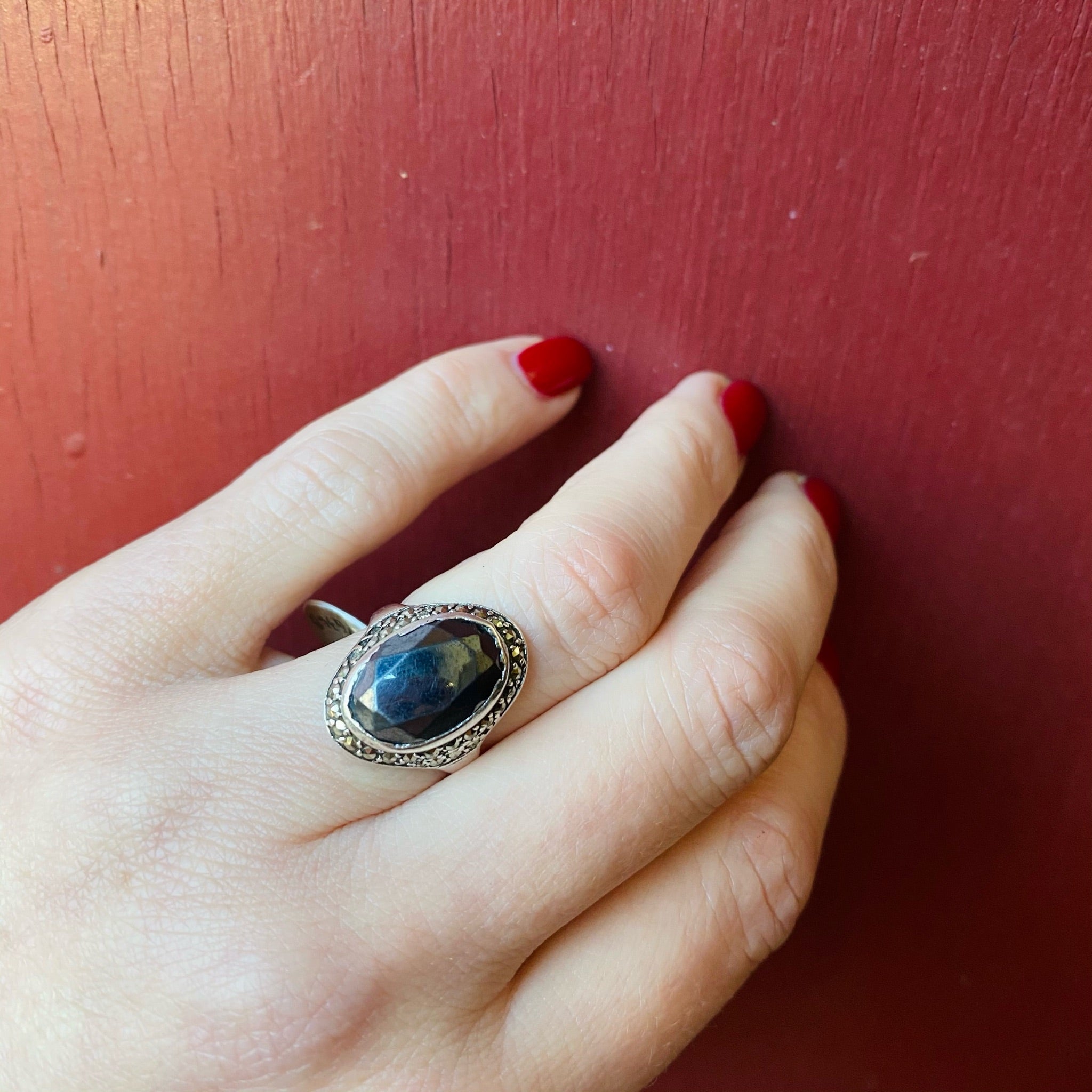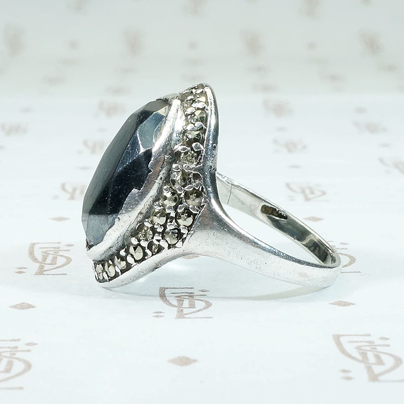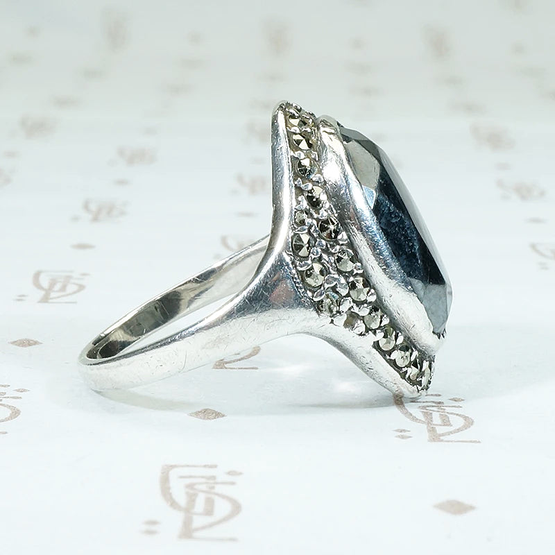 An icy grey hematite gem is bezel set in sterling silver and surrounded by a halo of glittering marcasites. This glamorous vintage ring has that Dark Sparkle we love so much. This ring is As Is, there is some wear to the sterling bezel. Circa 1940.