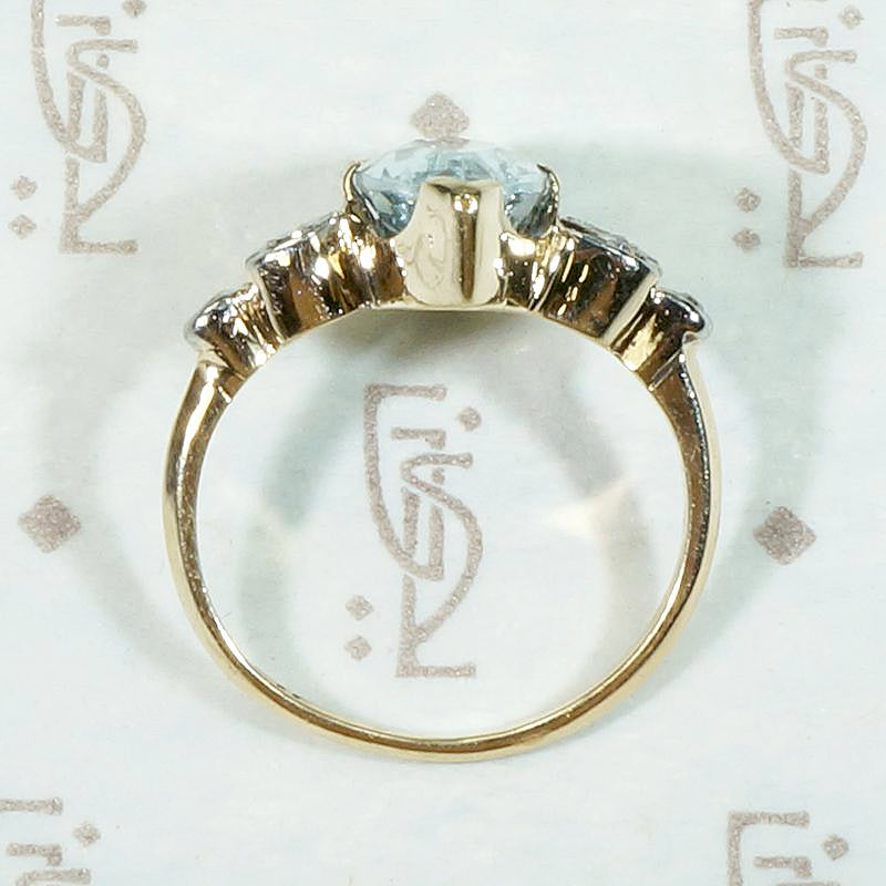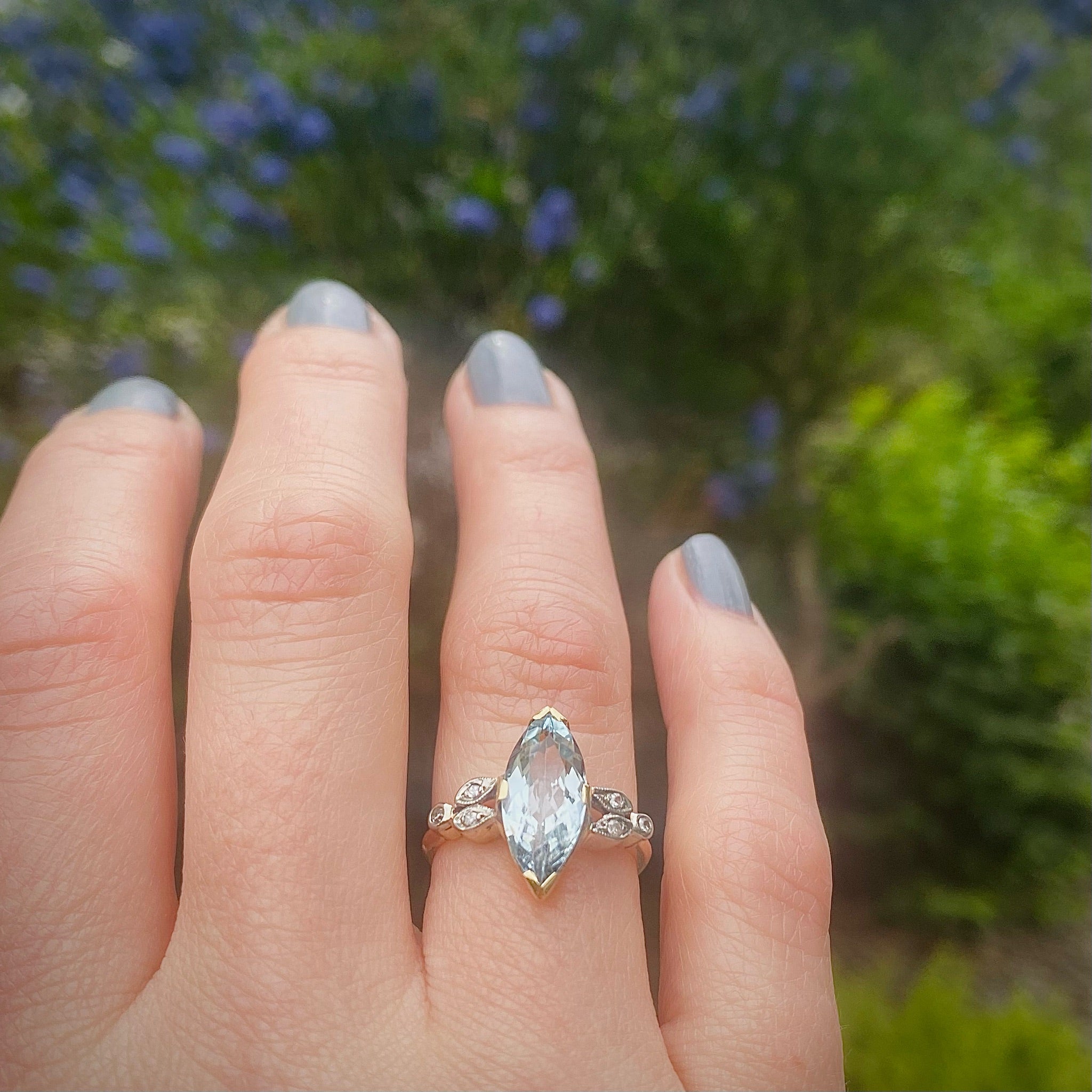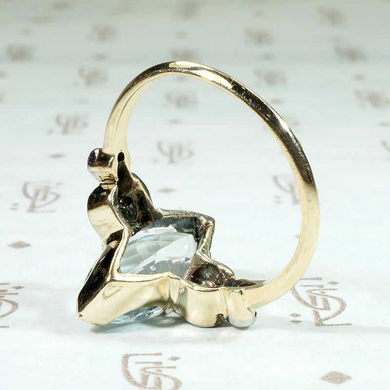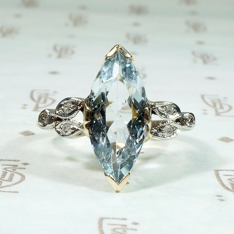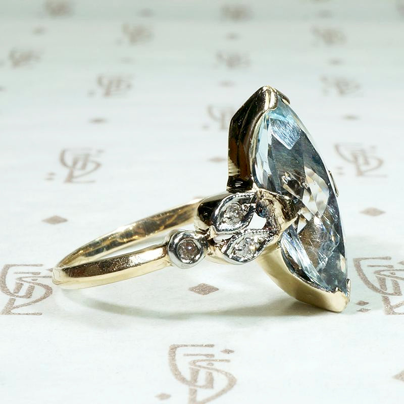 An exquisite marquis cut aquamarine dazzles in this vintage cocktail ring. The aquamarine has an icy glitter that is enhanced by the dramatic marquis cut. It is securely set in yellow gold "V" prongs that protect the gem's tips. The body of the ring is 10k yellow gold, accented by six tiny diamonds set in little white gold navettes and bezels. The openwork sides are embellished with milgrain detail creating a lacy effect that contrasts with the stark beauty of the center stone. Circa 1940.
