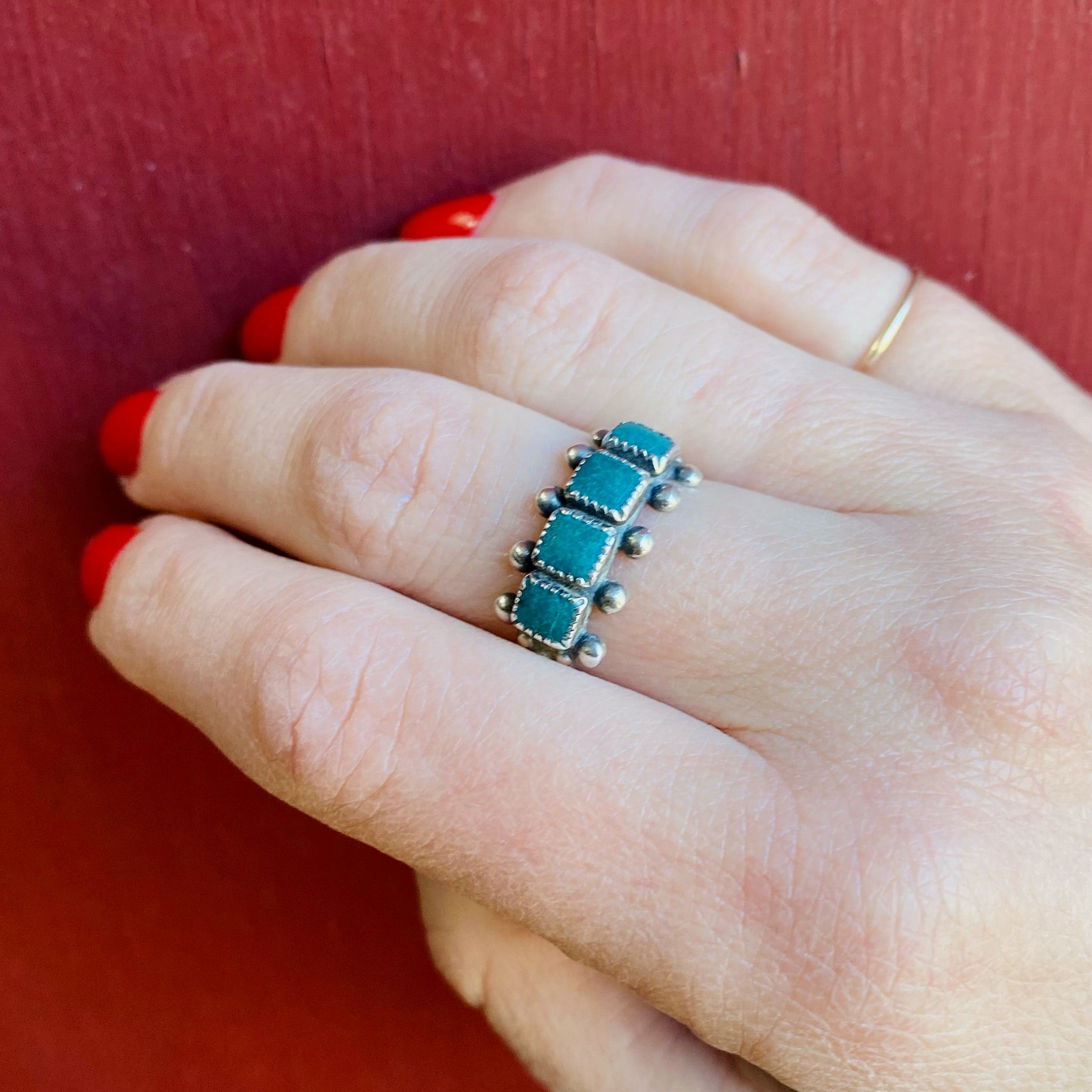 This vintage Zuni ring is set with the most incredible turquoise, a saturated dark green with deep blue overtones. Four small, square gems are set in a sterling silver band of saw tooth bezels that curve gently over the top of your finger. Silver balls edge the band, top and bottom, and decorate the shoulders of the ring. The interior of the band is marked "STERLING." Circa 1960.