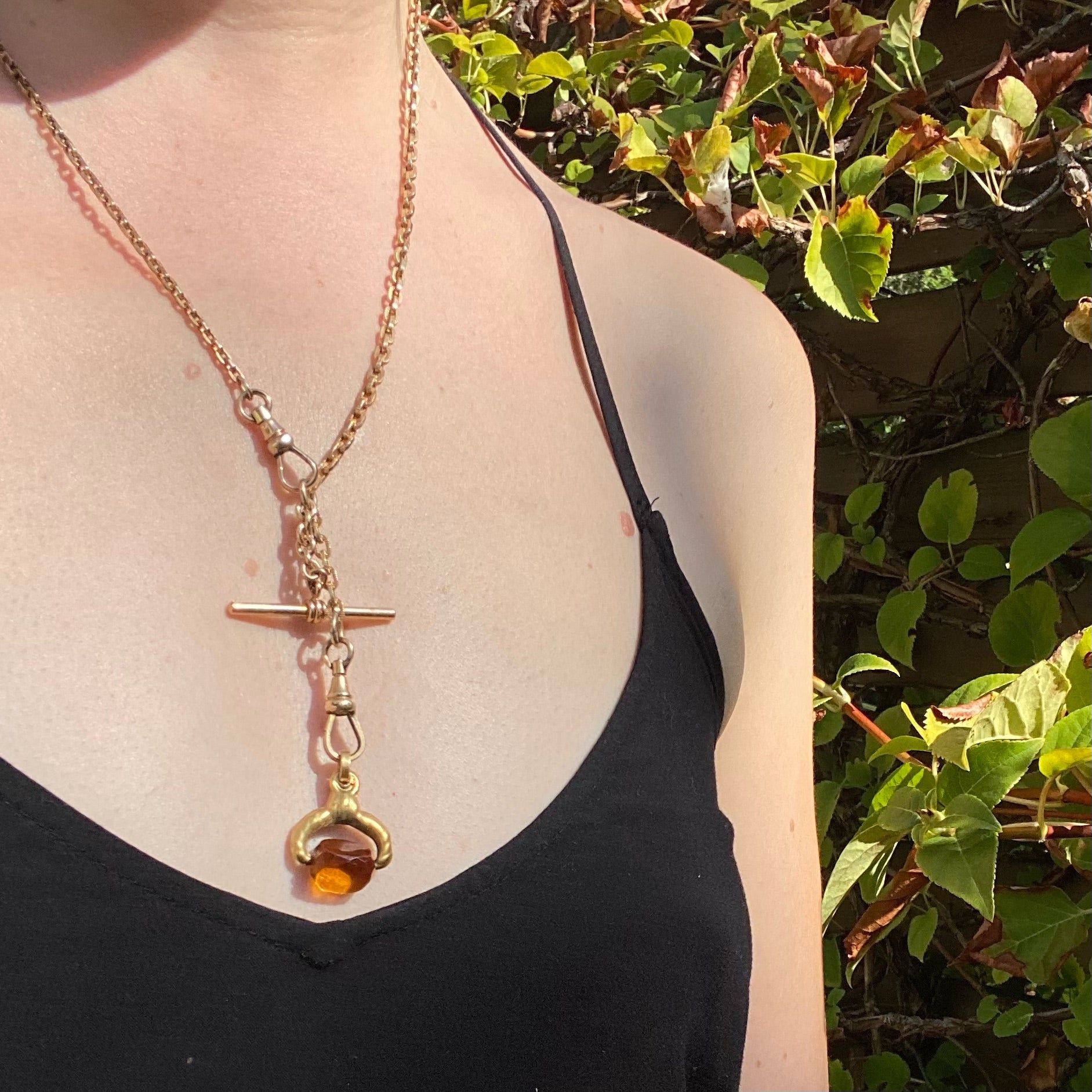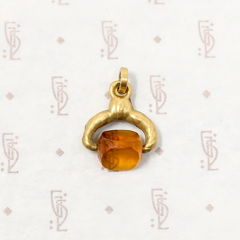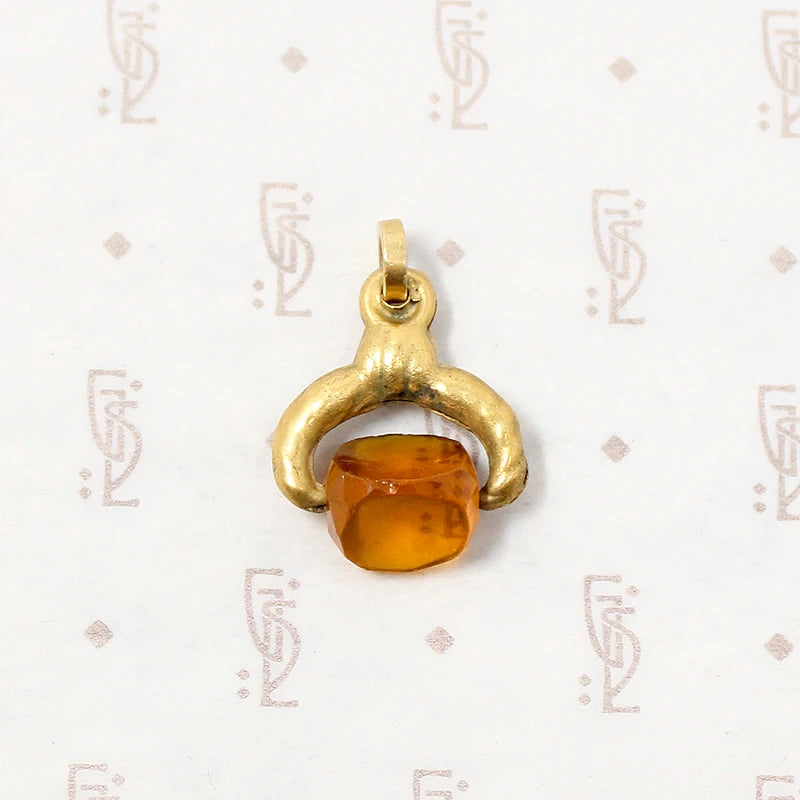 This pretty Victorian spinner fob is set with amber-colored glass. The glass has three flat sides. It spins in a gold filled frame, perfect for fidgeting with. The integrated bale and jump ring makes this interesting little antique fob easy to wear on any chain you like. Circa 1870.