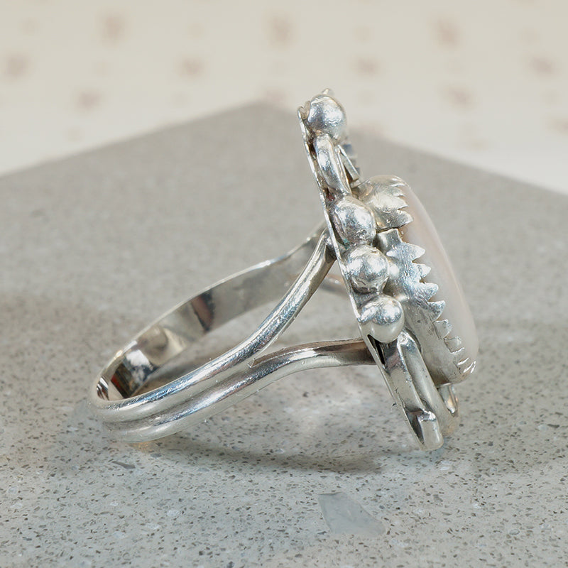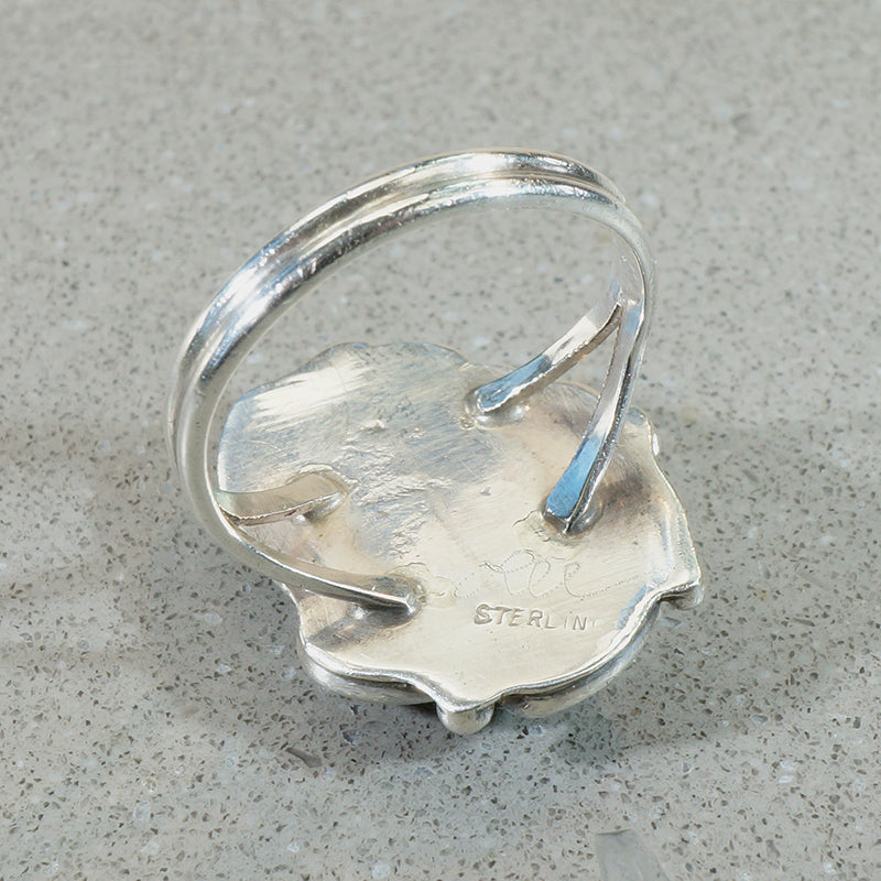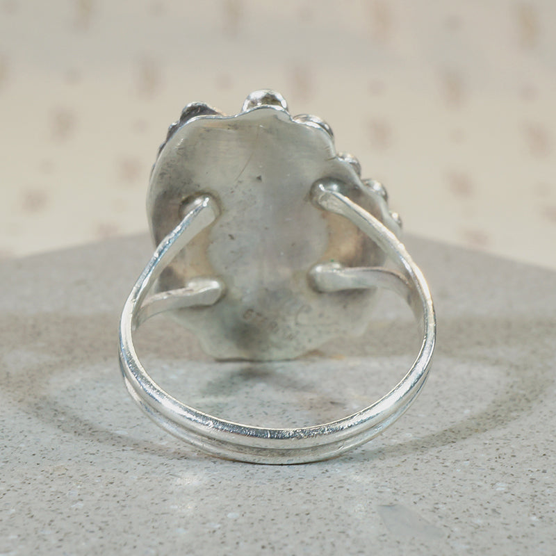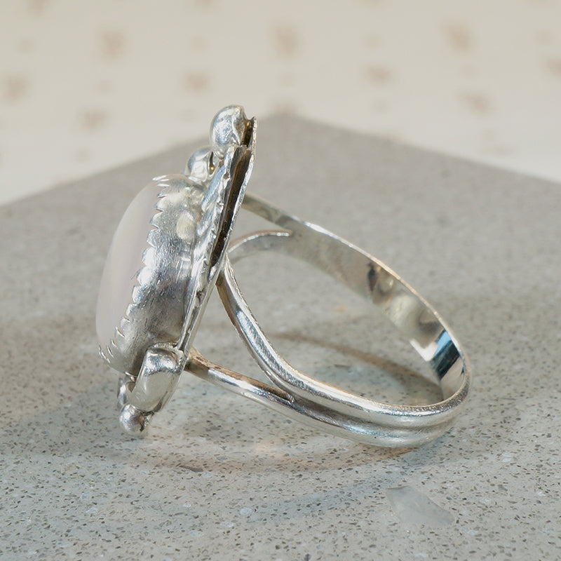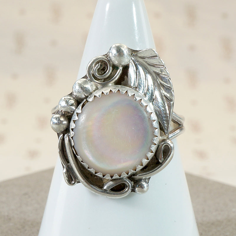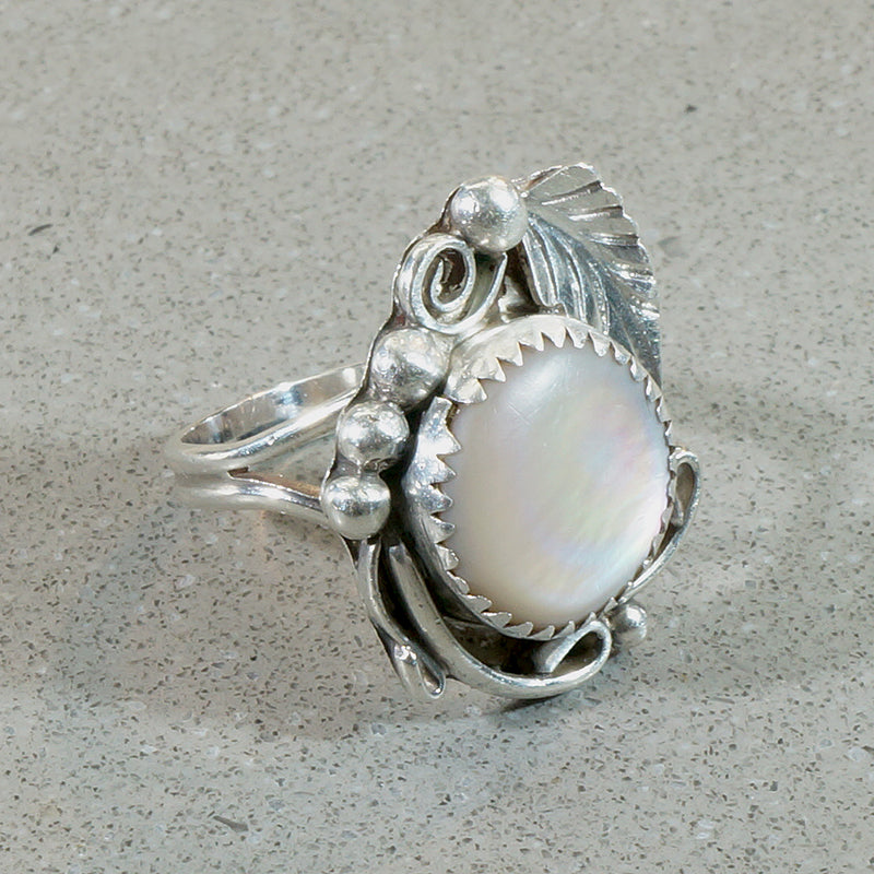 Like a limpid pool hidden deep within a primeval forest, this mother-of-pearl ring emanates a dreamy natural beauty. The round gem's nacre is softly iridescent, glossy, and diffuse. It nestles in a hand-cut sawtooth bezel framed in soft silver tendrils and a curling leaf. Silver beads accent the ring's asymmetric design. The decorative top of the ring sits over split shoulders and a double band. Marked "Sterling" on the underside and signed with the name "Ree" or "Lee." Circa 1980.