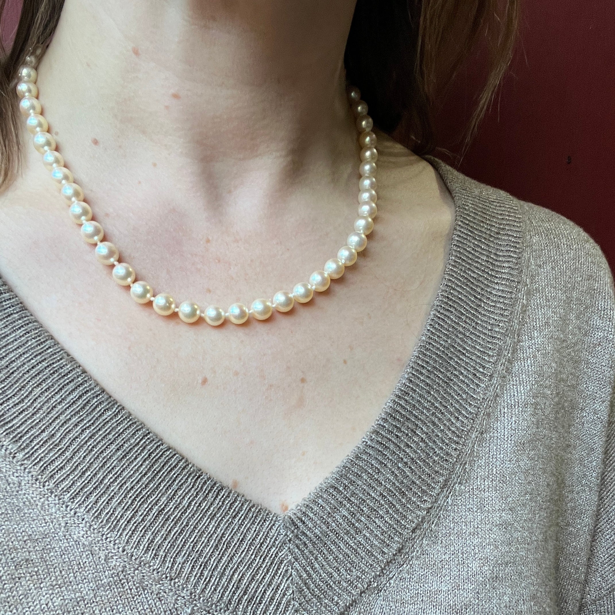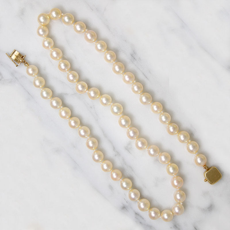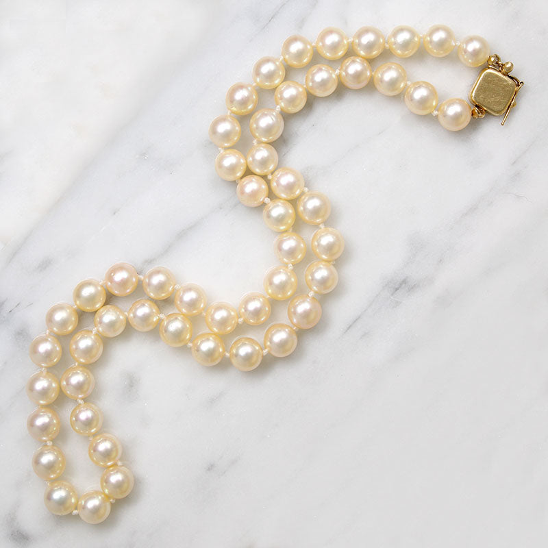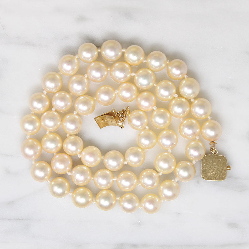 This lucent strand of cultured pearls is irresistible, an especially attractive iteration of the classic fashion staple. Creamy pearls are freshly hand-knotted on white silk, then finished with a chic 14k gold box clasp. A safety latch has been added, just for good measure. Tasteful and perfect for any occasion. Circa 1960.