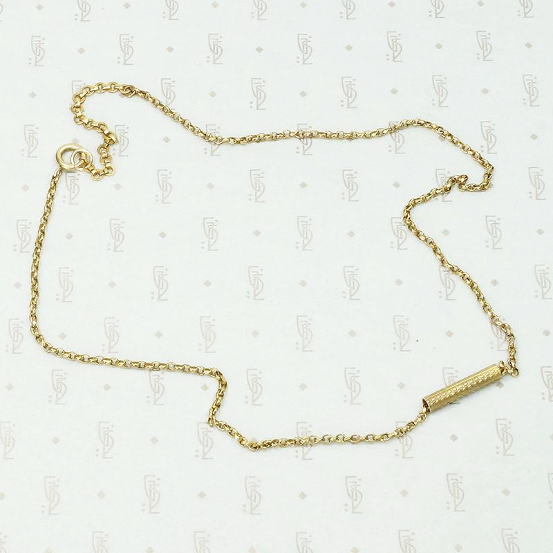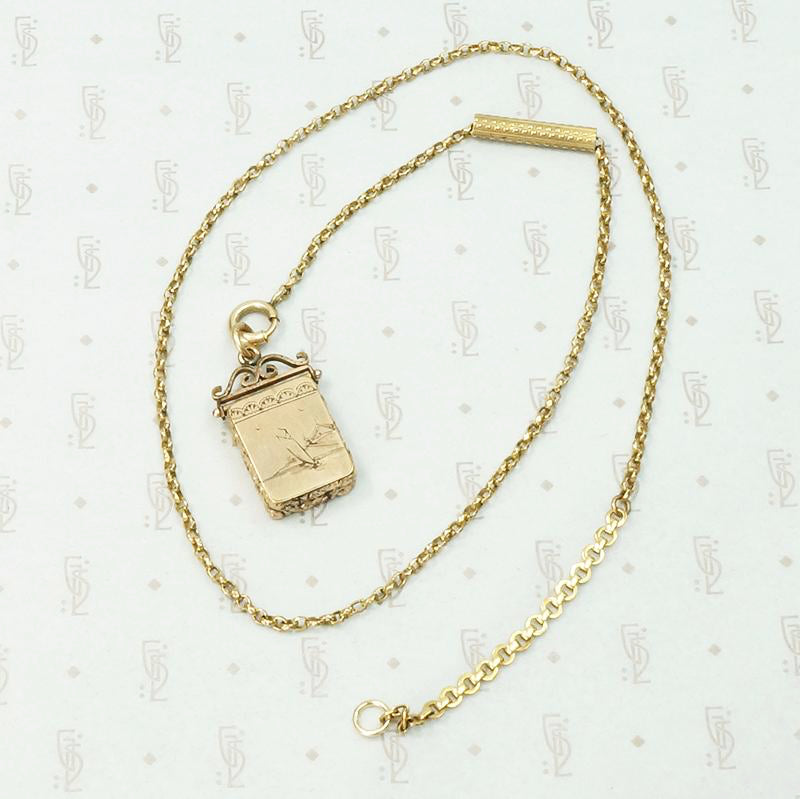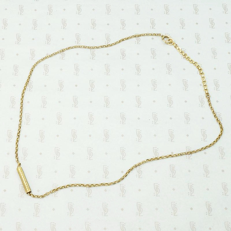 Subtle textures and movement make this elegant necklace irresistible to touch. Faceted link chain is paired with a segment of flat disc chain, both types of antique chain are gold filled. A slim decorative tube moves easily over the chain. The necklace is finished with an antique gold bolt ring. This necklace is wonderfully tactile and is perfect for fidgeting with. The ingredients of this necklace date from circa 1860-1910.