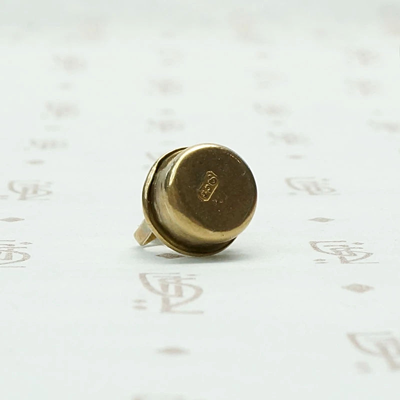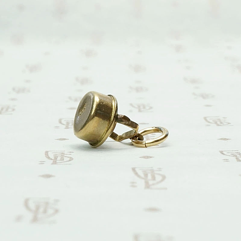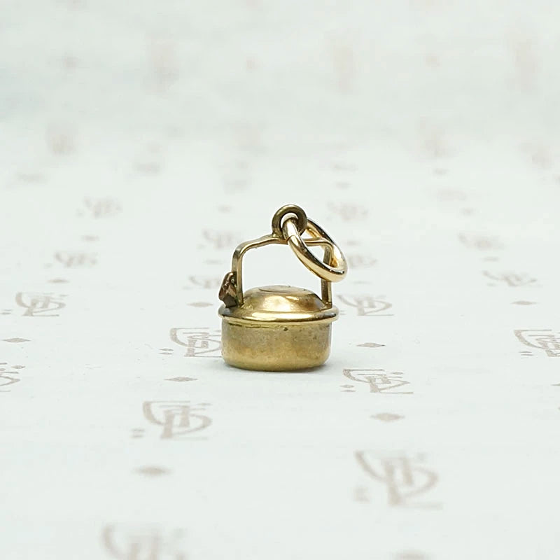 This English charm is a tiny tea kettle, modeled in 9ct gold. This sweet thing is suspended by a gold jump ring, making it easy to hang the charm from anything you like. Is there anything a nice cuppa can't fix? Circa 1940.
