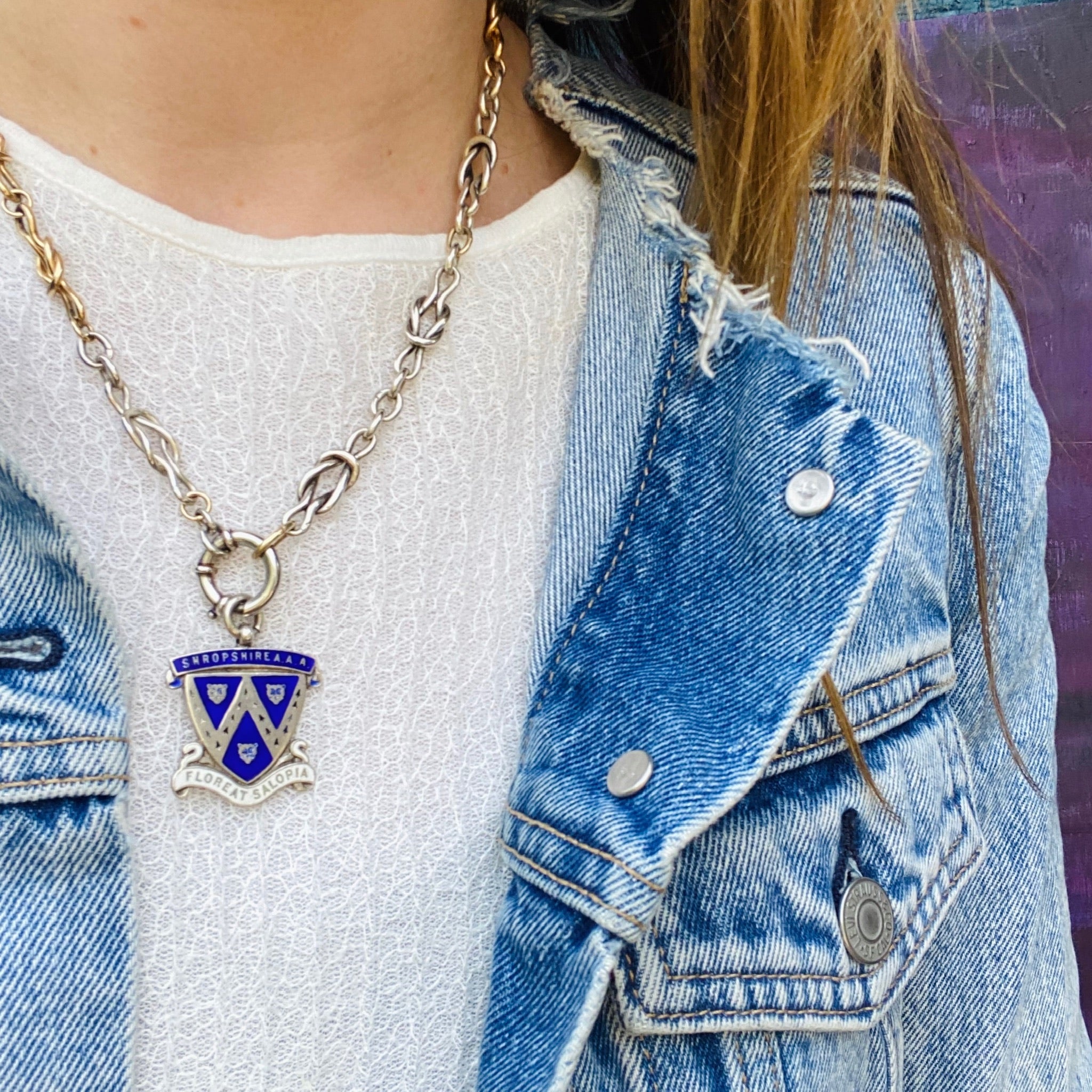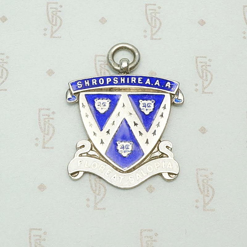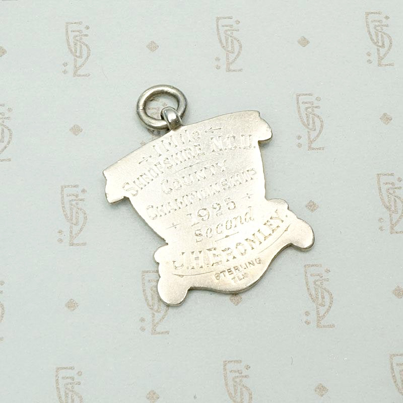 This English fob commemorates the occasion of J. H. Bromley taking 2nd place in the 1925 Shropshire NCU County Championship's one mile race. The front of the sterling silver fob is enameled in blue and white with the phrases "Shropshire A.A.A." and "Floreat Salopia." The back is beautifully engraved with the circumstances of its presentation to Mr. (presumably) Bromley. This fun and interesting fob will make a very handsome pendant.