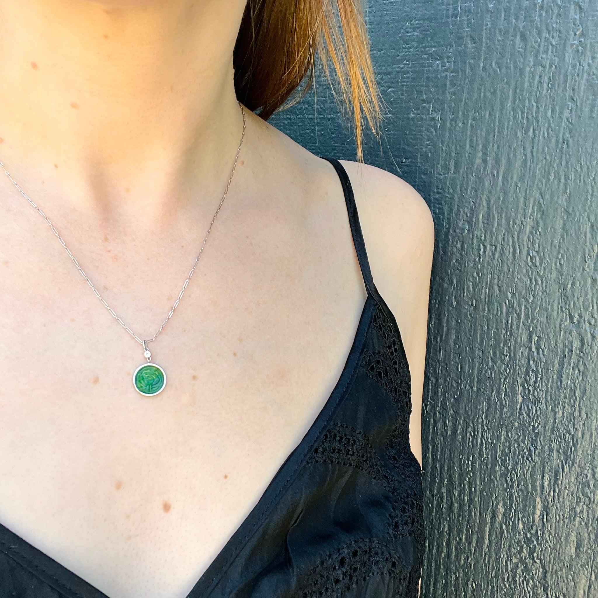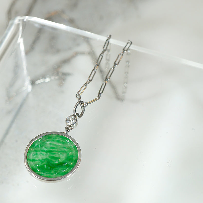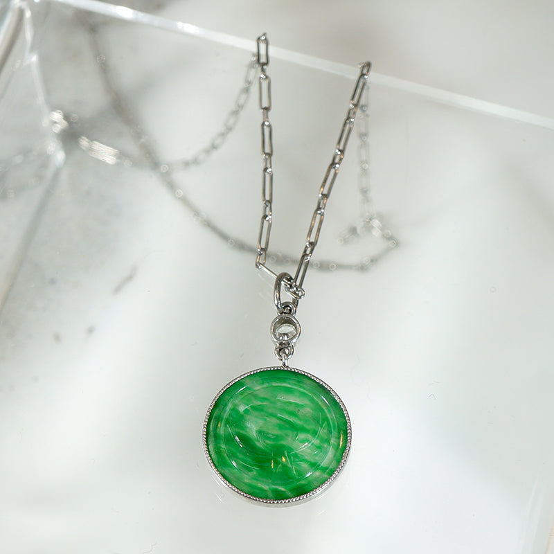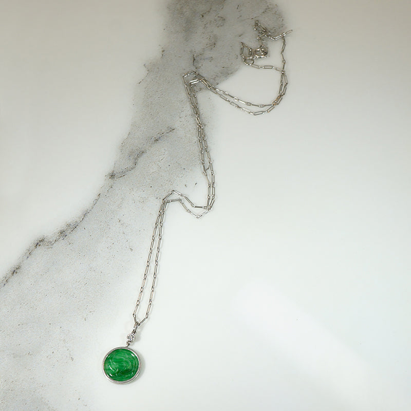 A stylish Art Deco jade necklace, in platinum with a diamond accent. A disc of brilliant green jade is carved with an Egyptian Revival motif. The jade is set in a platinum bezel, and a bezel-set diamond forms the pendant's bale. Fine milgrain engraving frosts the platinum bezels, a subtle detail that adds a delicate glitter. A vintage platinum trombone chain completes the picture. The necklace's clean lines, elegant sparkle and bright green color are the epitome of Deco glamour. Circa 1920.
