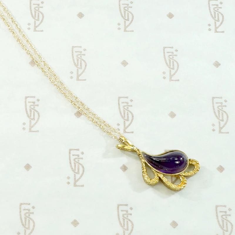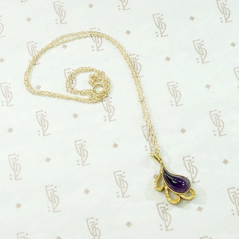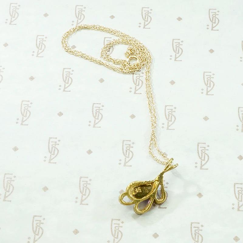 A lush and juicy amethyst is cut en cabochon to resemble a piece of ripe fruit. The amethyst is jauntily set in 14k gold, with engraved, openwork leaves. A split bale is cleverly positioned to resemble the fruit's stem. The back of the pendant is marked "967" and "J.T.C."  It hangs on a modern 14k rope chain. Circa 1960.