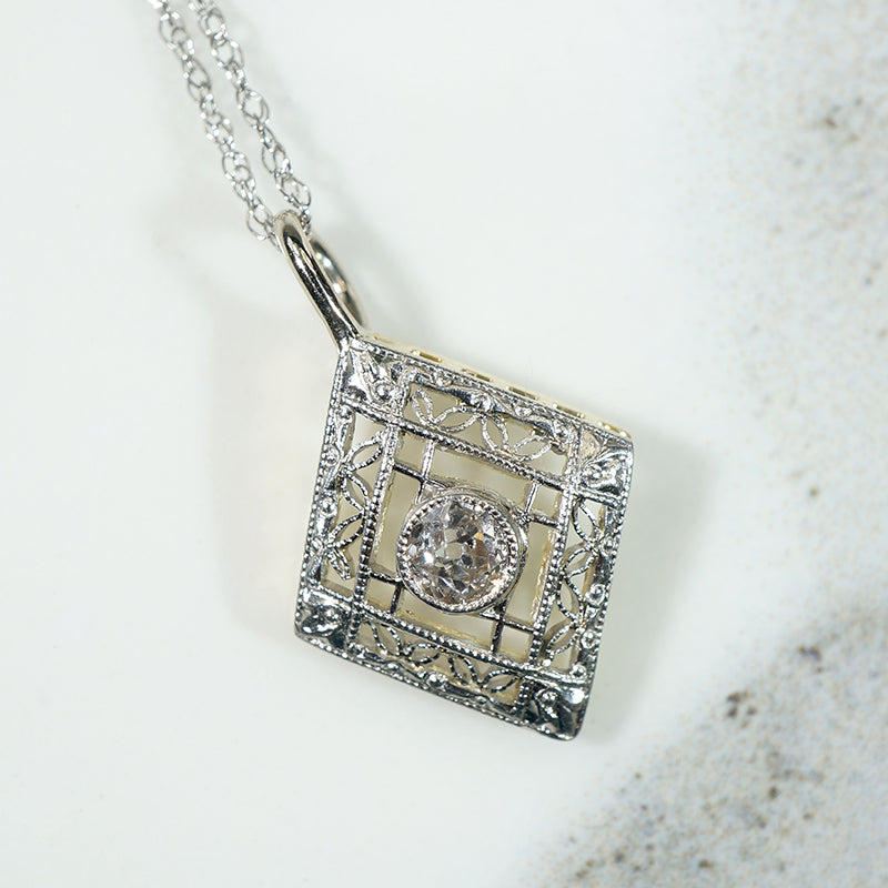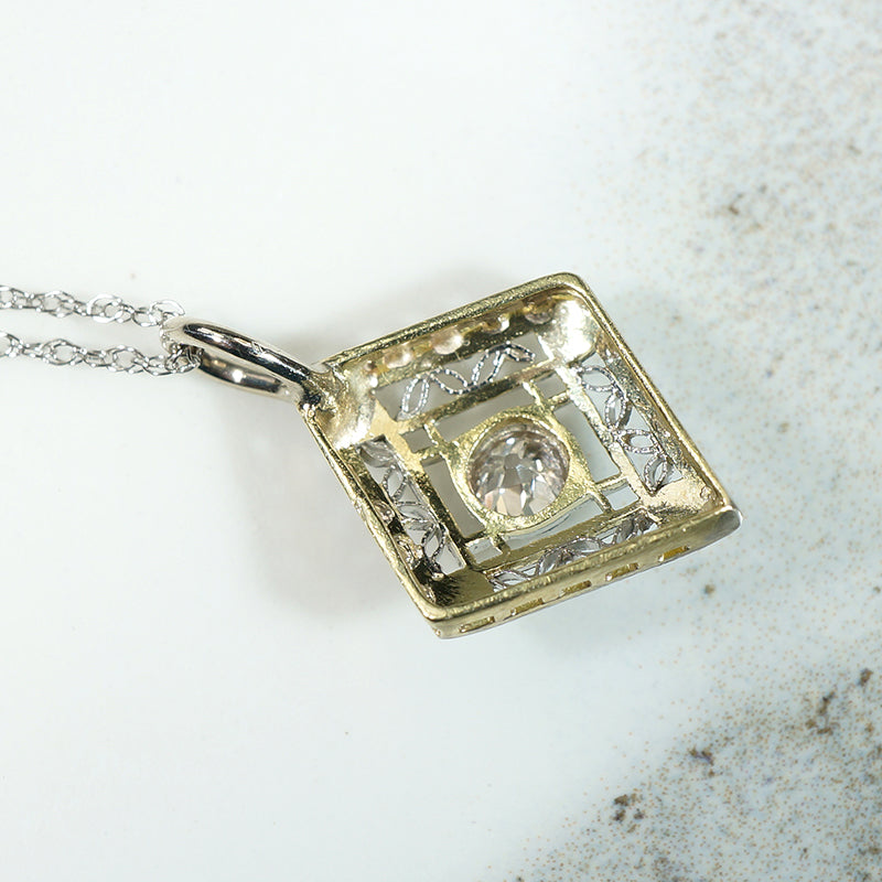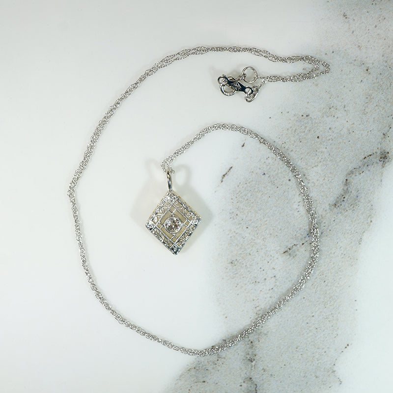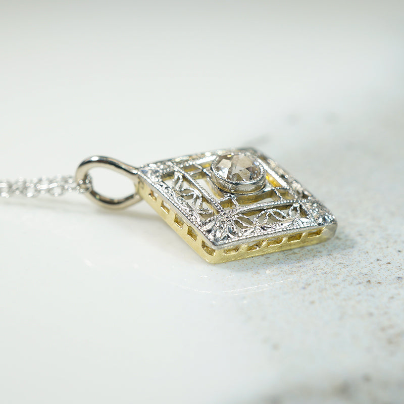 A delicately filigreed 14k two-tone gold pendant is set with a bright little diamond. The pendant is a lacy lozenge of white gold over yellow gold, pierced with a lattice pattern and embellished with tiny leaves. A .10ct old mine cut diamond is center set, framed in a milgrained bezel. Fine engraving gives the piece a frosty glitter. This pendant is a conversion jewel made from an Art Deco stick pin and hangs from a modern 14k white gold rope chain. Circa 1920.