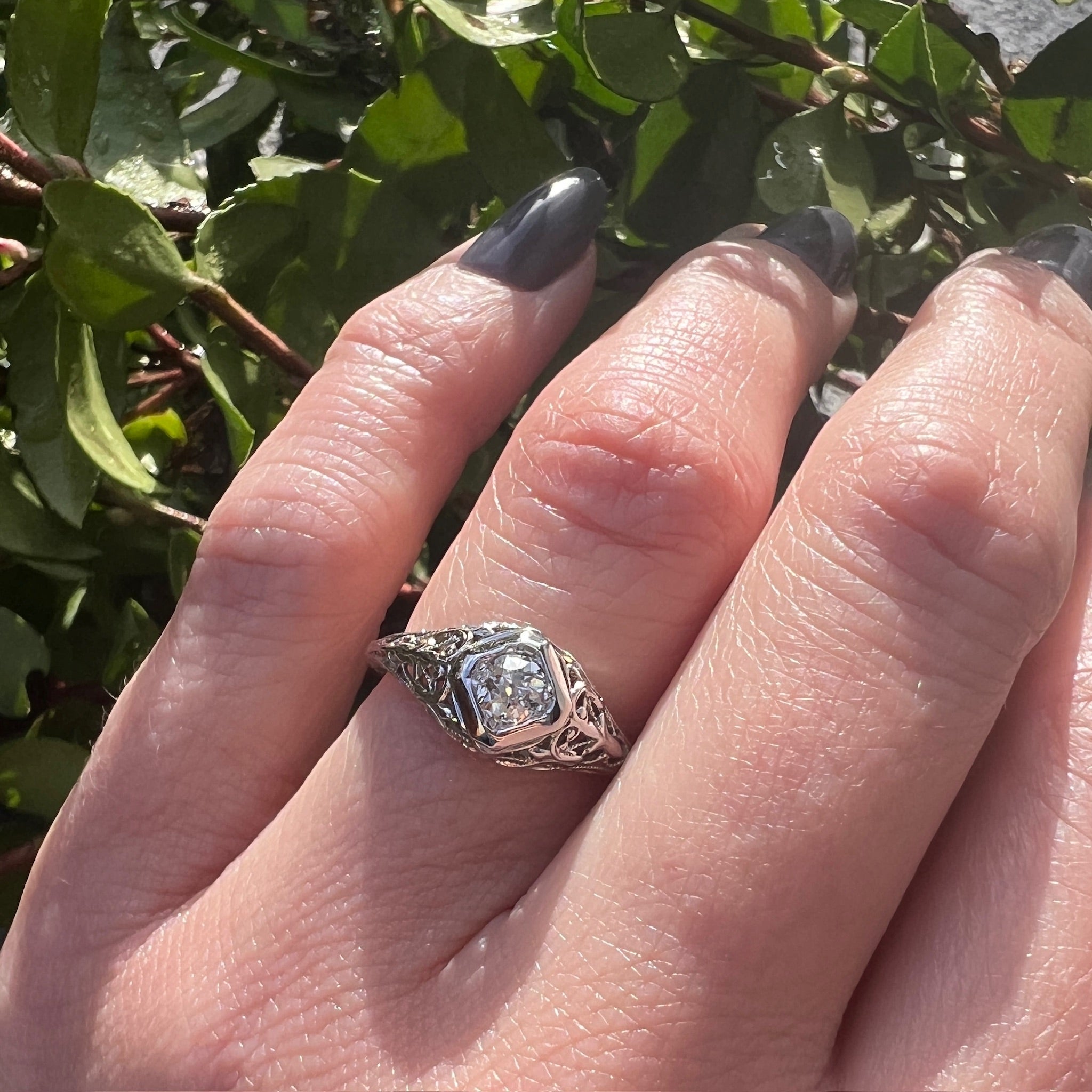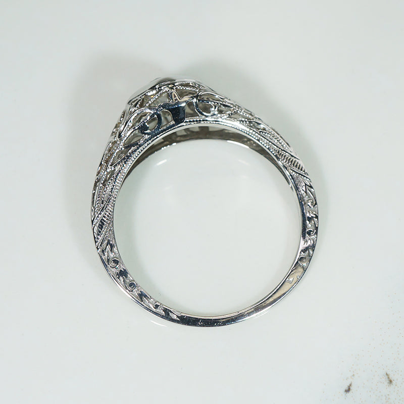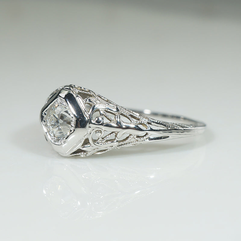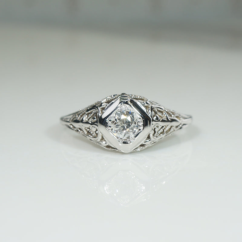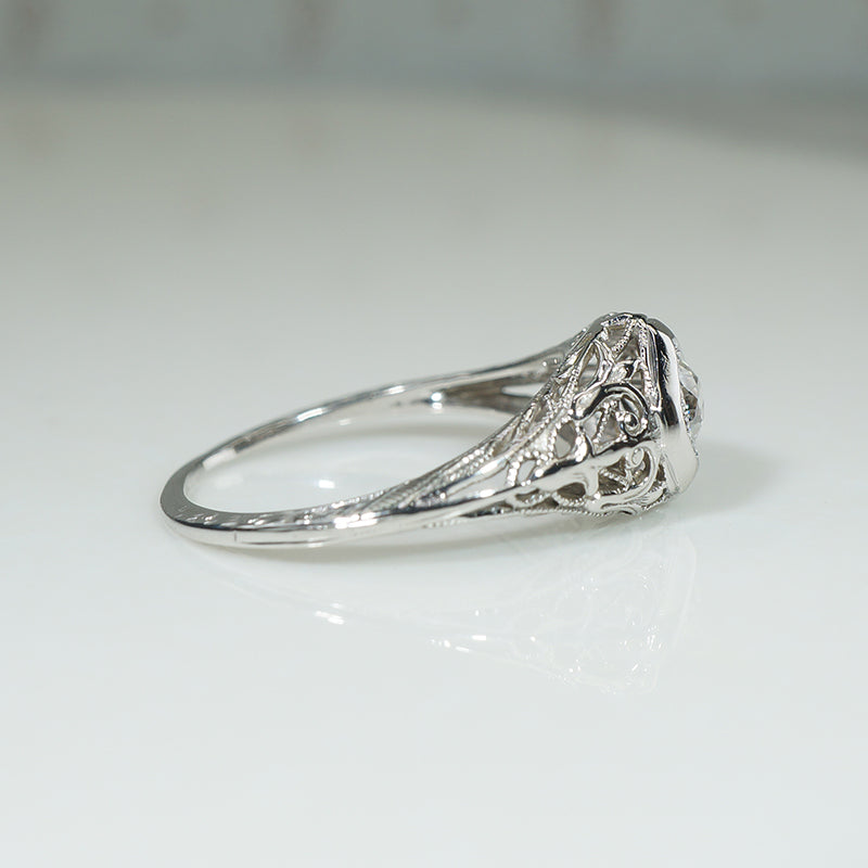 A lovely old diamond, gossamer metalwork, and fine engraving make this Art Deco engagement ring special. The funky .27ct old mine cut diamond sits in a lozenge-shaped head. It is displayed in a domed and contoured 18k white gold setting, with lacy foliate shoulders and a gallery filigreed with lily flowers. Exquisite engraving beautifies the ring's edges and slim band. Puffy filigreed rings like this look a treat paired with our Recycled Revival Floral Curve wedding bands. Circa 1920.
