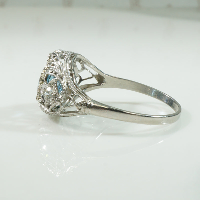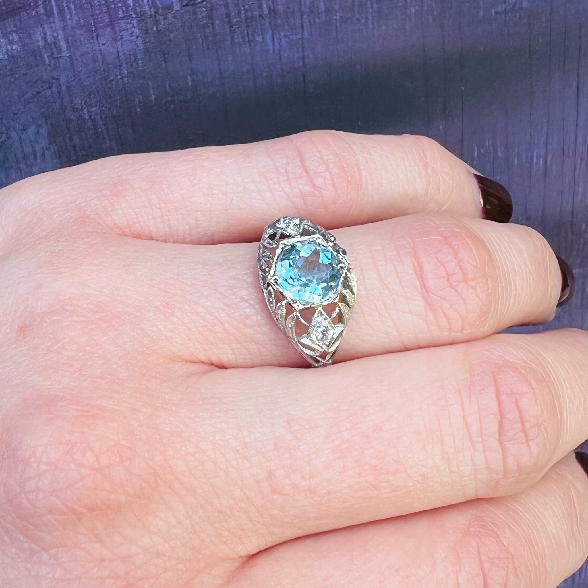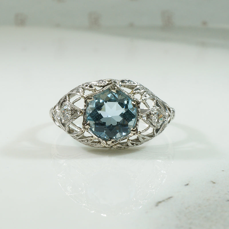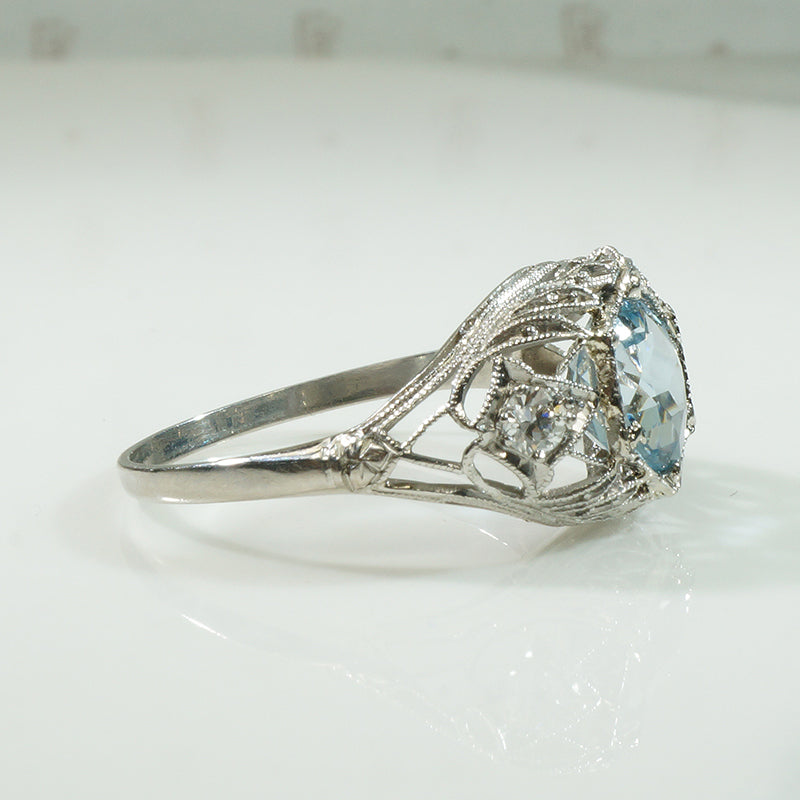 An enchanting blue Aquamarine the color of a summer sky is set amid delicate Platinum Filigree in this incredible Edwardian Ring. To either side, diamond-set flowers are framed by lacy platinum leaves. Such Beauty, Circa 1910.