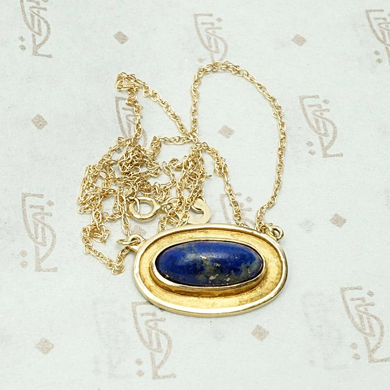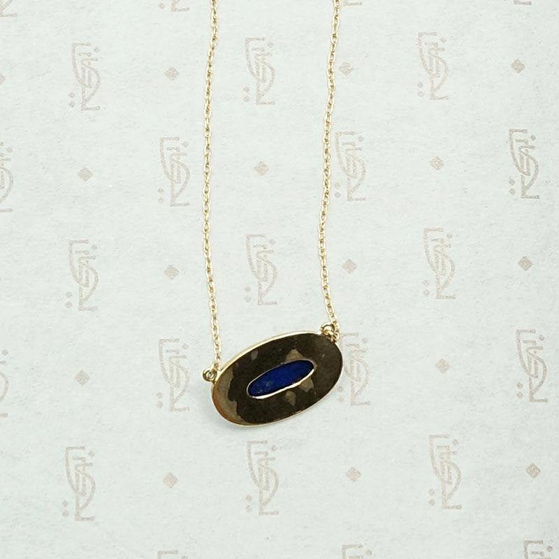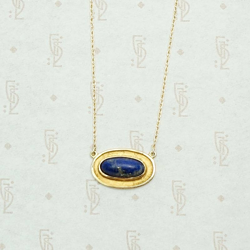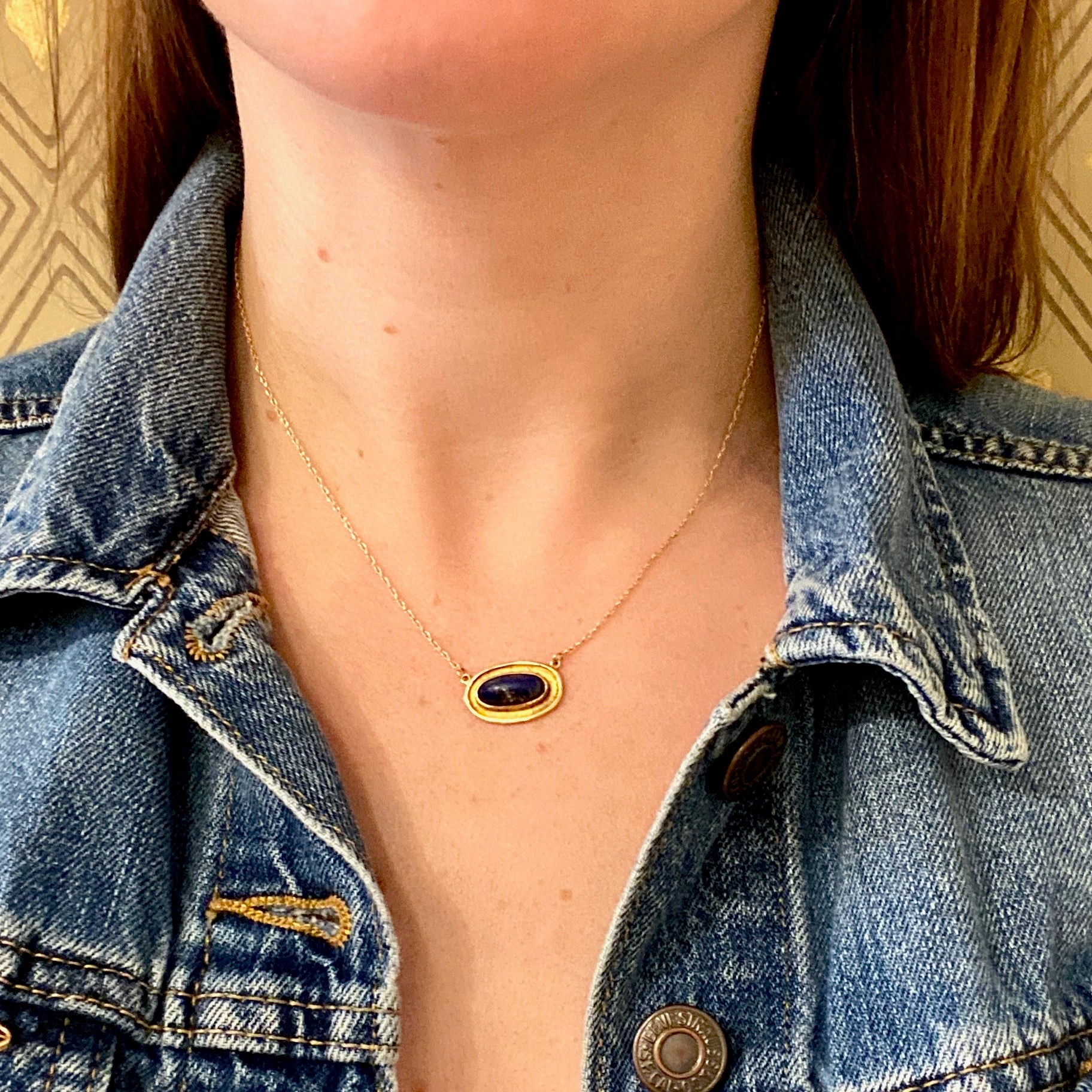 This elegant minimalist necklace features a lapis lazuli cabochon set horizontally in a ridged oval of bright yellow gold. The pendant is suspended from a recycled 14k yellow gold chain. The pairing of saturated blue of lapis and rich yellow gold is sumptuous. The lapis pendant began its life as an Arts & Crafts cufflink circa 1900.