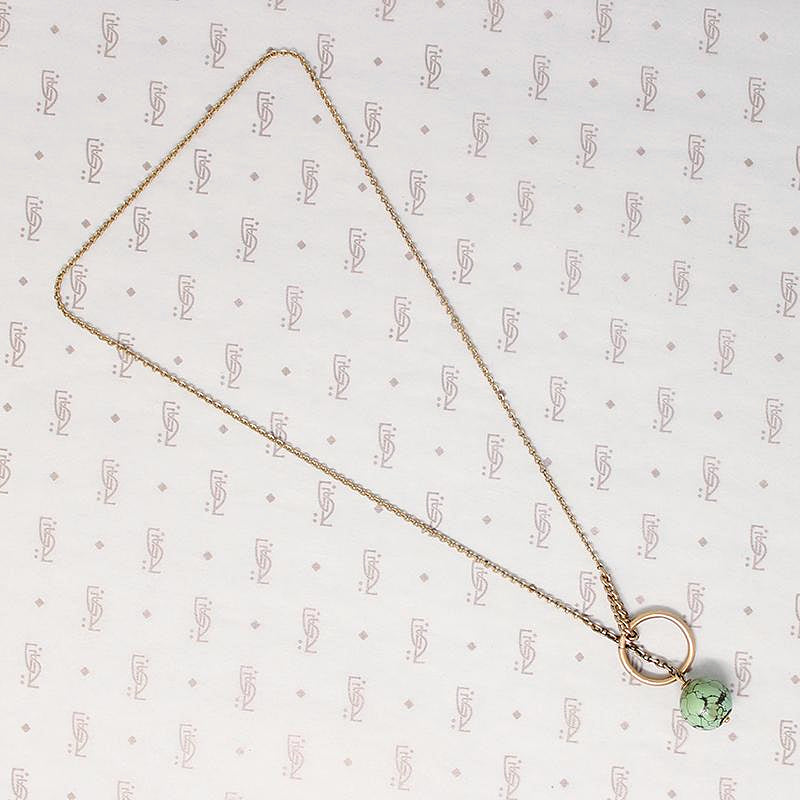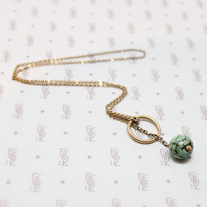 Simple, elegant lariat necklace with subtle detail. A gold filled cable chain is finished at one end with an exquisite turquoise orb, minty green with dramatic matrix. The other end is finished with a gold filled hoop secured with a segment of gold filled curb chain. Pass the orb through the hoop, and gravity will hold the necklace in place. Lovely. The ingredients are all from my personal collection.