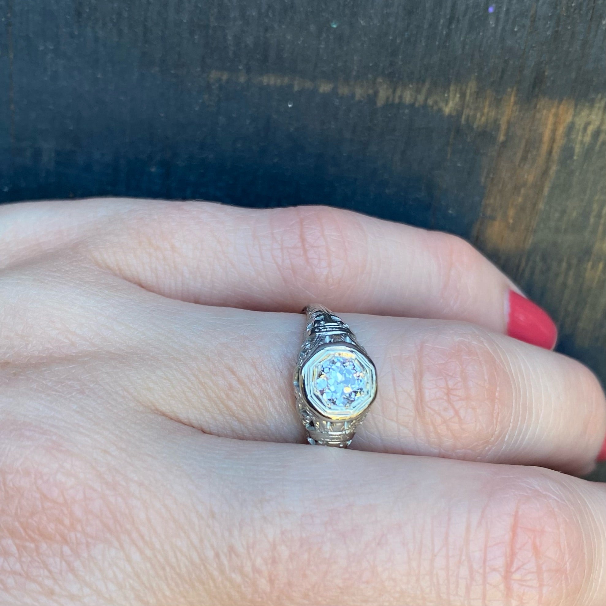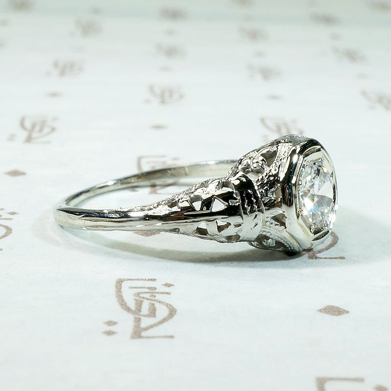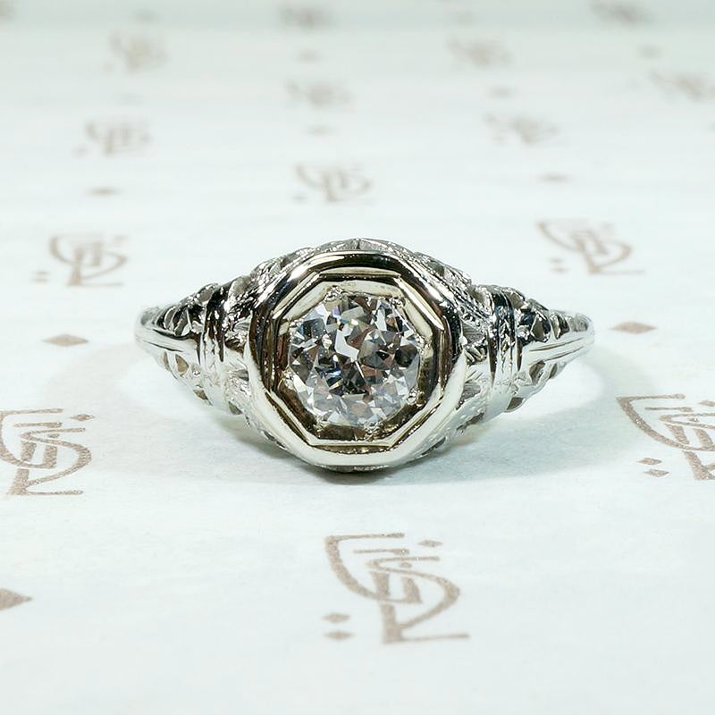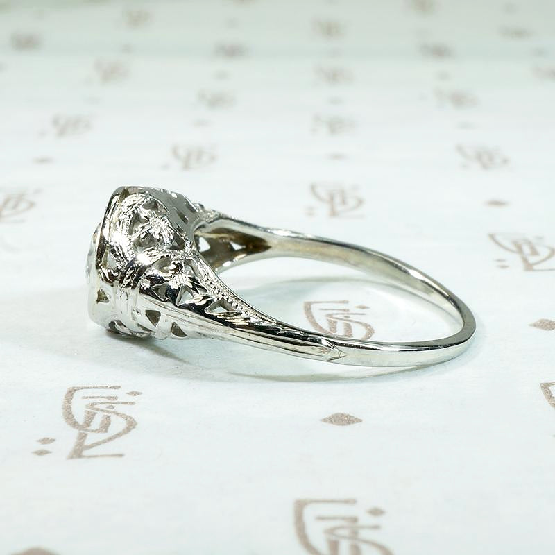 This Art Deco diamond engagement ring is a lovely example of the era. A glittering diamond with of approximately 0.40ct is set in a classically Deco hexagonal head. 18k white gold filigree with a latticework design forms the gallery and shoulders, the shoulders terminate in engraved arrows and taper back to a slim band. Puffy filigreed engagement rings like this one pair beautifully with our Recycled Revival curved wedding bands. Circa 1920.
