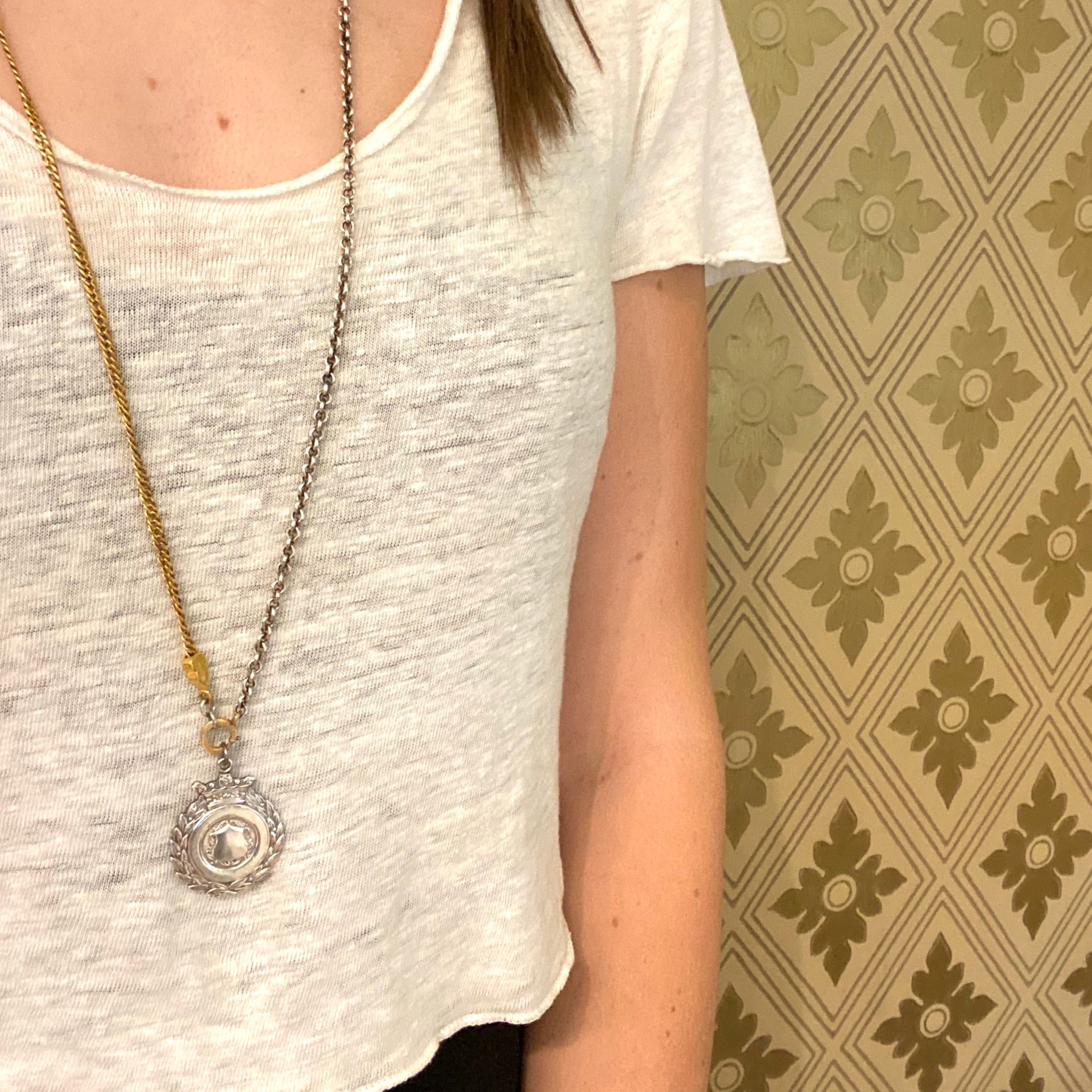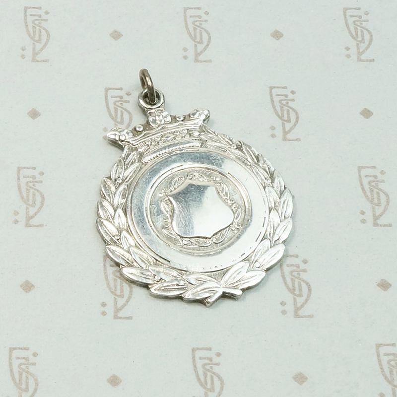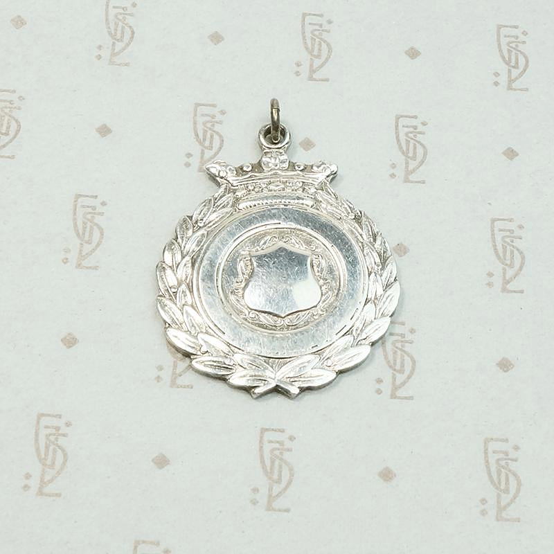 This sterling silver fob medal is beautifully modeled. The front of the fob has a shield with an delicately engraved surround. This is framed with a wreath of laurel leaves and topped with a crown. This fob makes a very handsome pendant, a sterling jump ring is attached. It will look fantastic worn on one of our Ancient Influences married chains. Circa 1930-40.