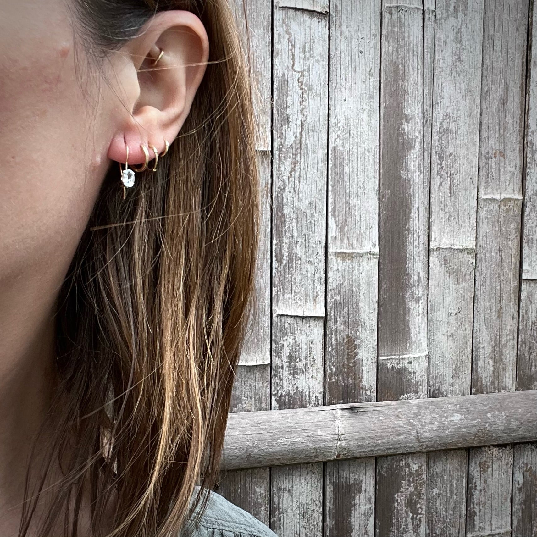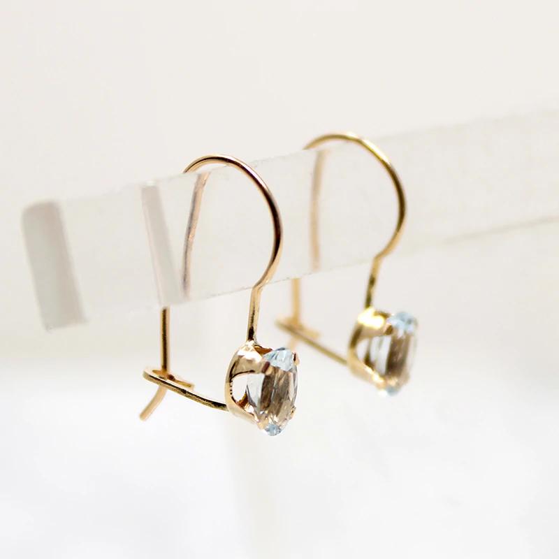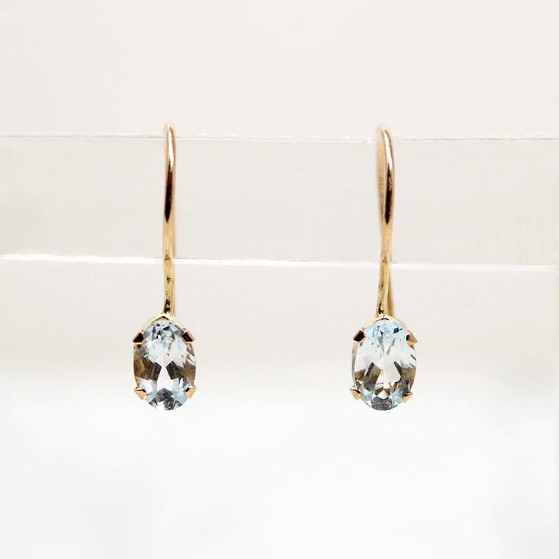 Vintage aquamarine in 10k rosy gold ear bobs, short and sweet. The pale blue oval aquamarines nestle in four-prong crown settings on simple ear wires. The ear wires hook closed in back for security. These light and breezy earrings are perfect for any occasion. Circa 1960.