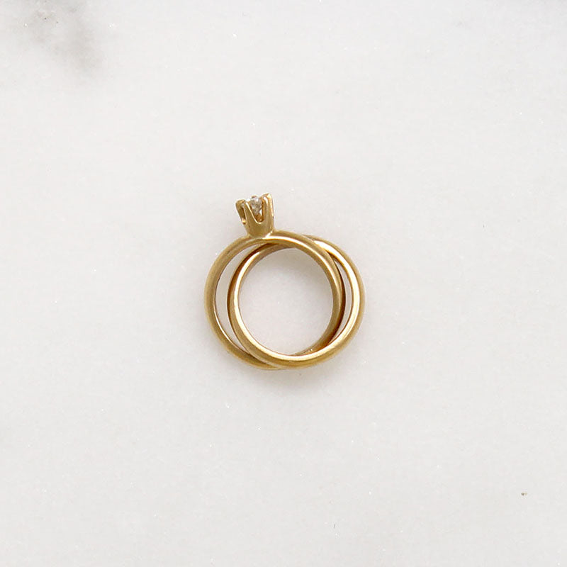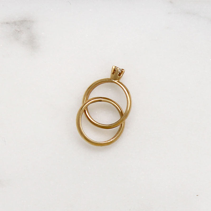 The tiniest wedding set charm. A 14k gold wedding band and diamond-set engagement ring are linked together, forever paired. The wee diamond sits proudly in a four-prong head. A darling love token that will look so sweet worn on a charm bracelet or chain. Circa 1950.