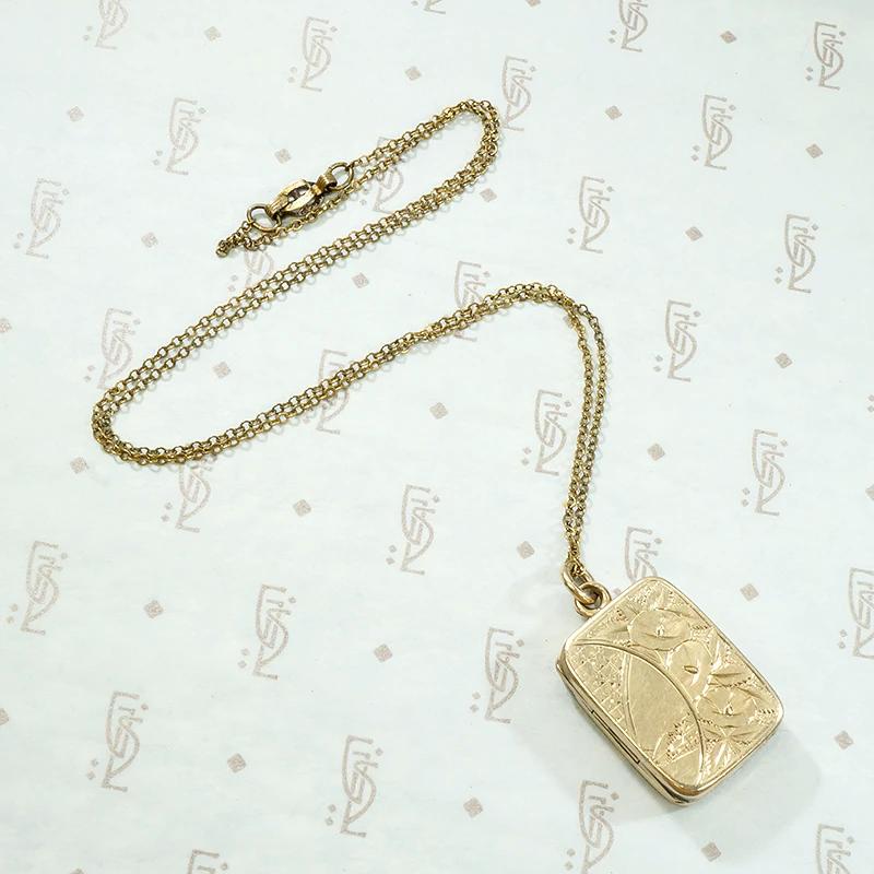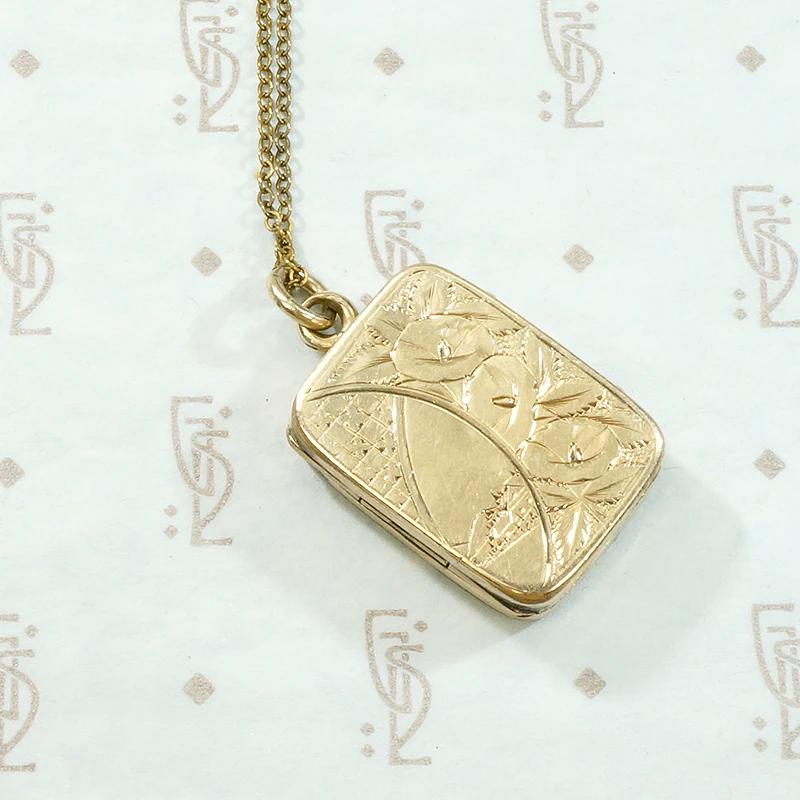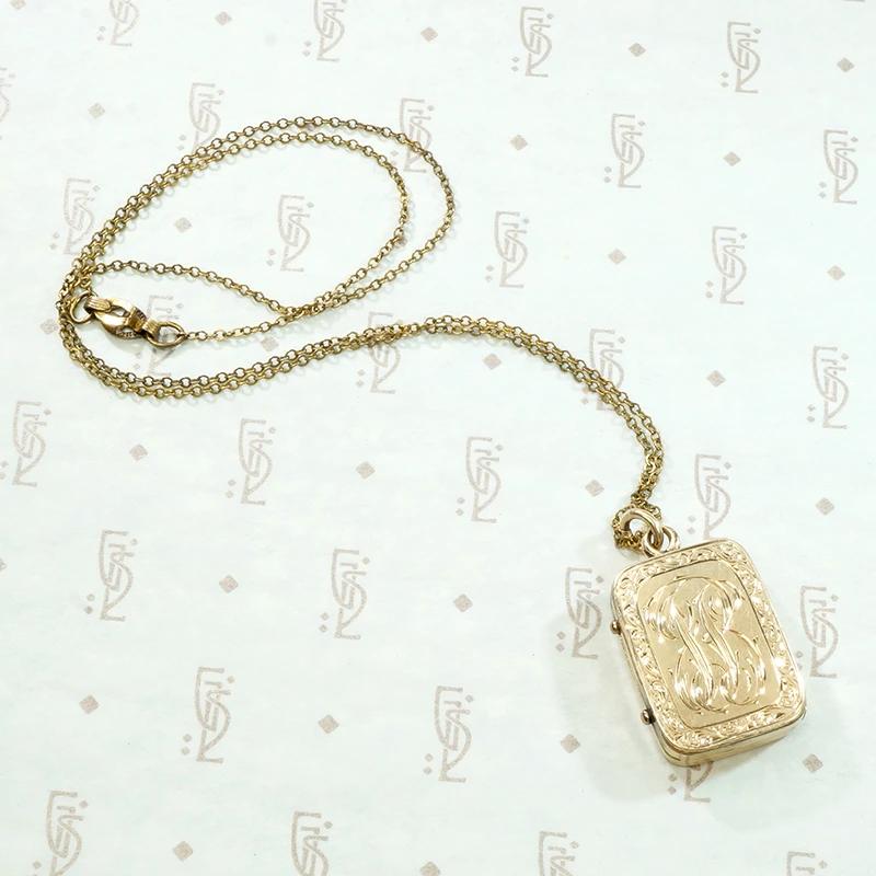 This charming Victorian locket is a rectangle of beautifully engraved gold filled metal. The front of the locket is engraved with flowers and a village scene, the back is engraved with an elaborate monogram. What are the initials? Difficult to say, but there is at least one "B." The locket hangs on a vintage gold filled chain. The interior of the locket is clean and empty, with no glass or frame. Circa 1880.