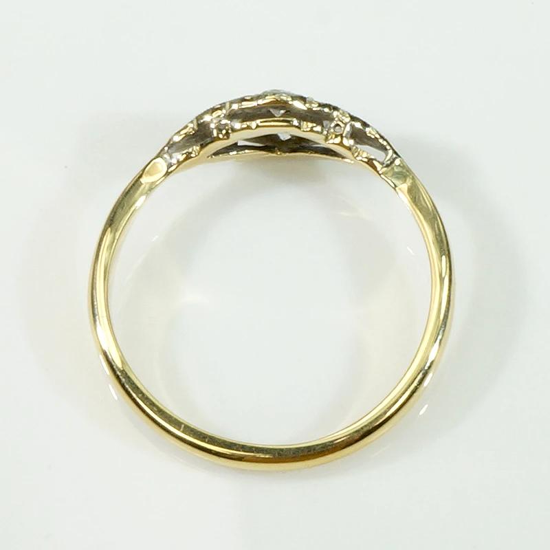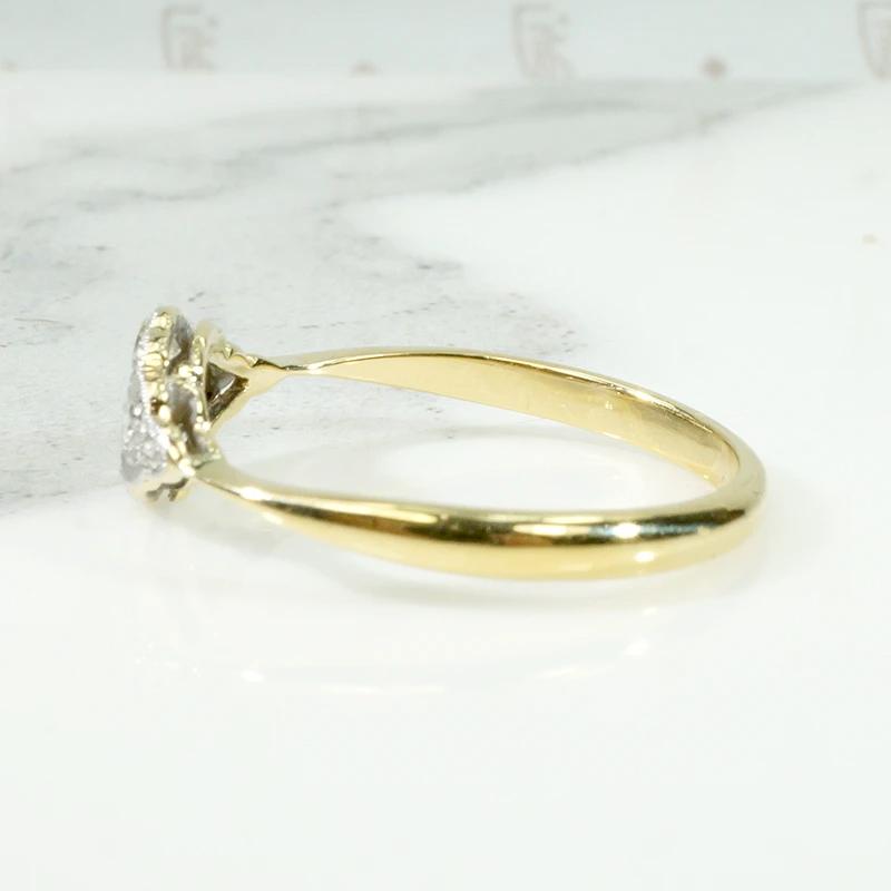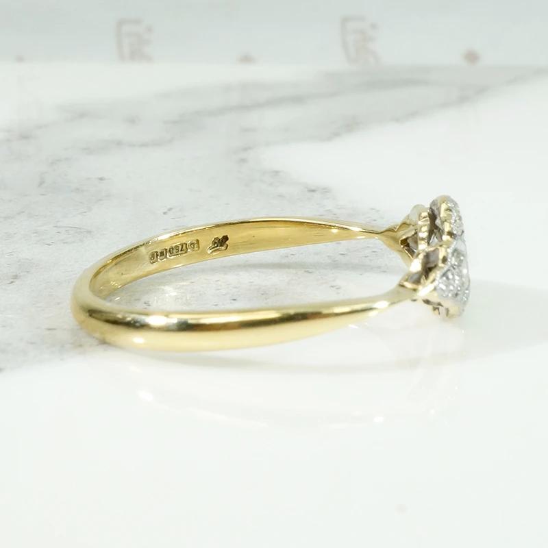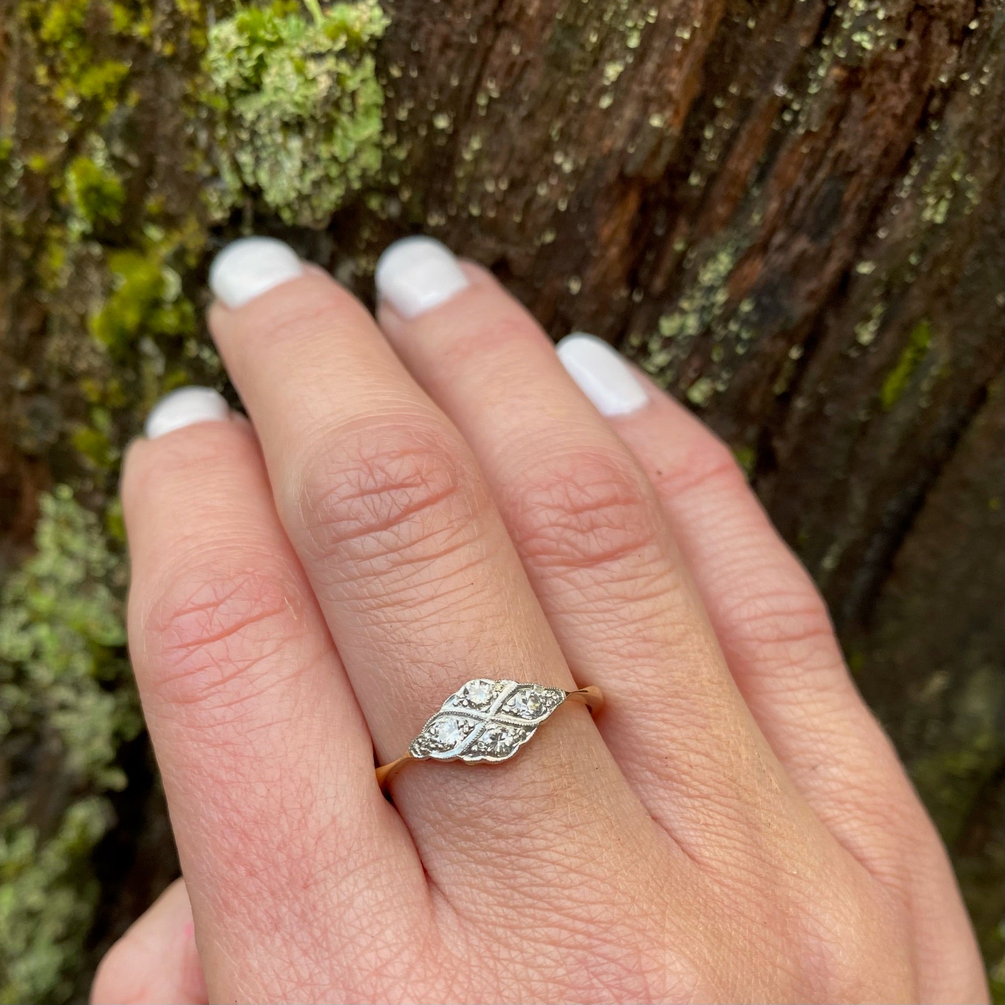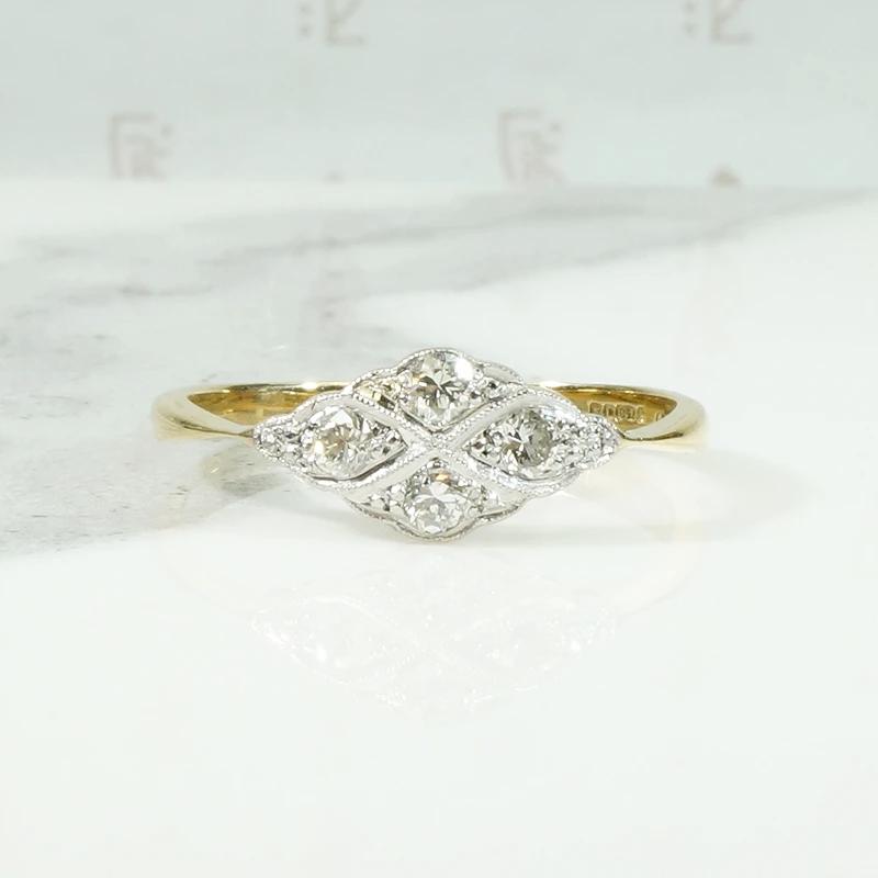 Fresh from London...our latest batch of enchanting jewels from Across the Pond. We love the luxurious Edwardian technique of layering diamond-spangled platinum over rich 18ct yellow gold. A petite diamond-set platinum navette sits atop a rich 18ct yellow gold band. Four diamonds with a 0.20tcw are set in the delicately engraved, scalloped platinum. The platinum sits across the finger with an east/west orientation, and the gold ring has a low profile with slim pinched shoulders and a narrow band. This delicate, feminine ring will make a lovely and very wearable engagement ring. Hallmarked for London, England 1926.