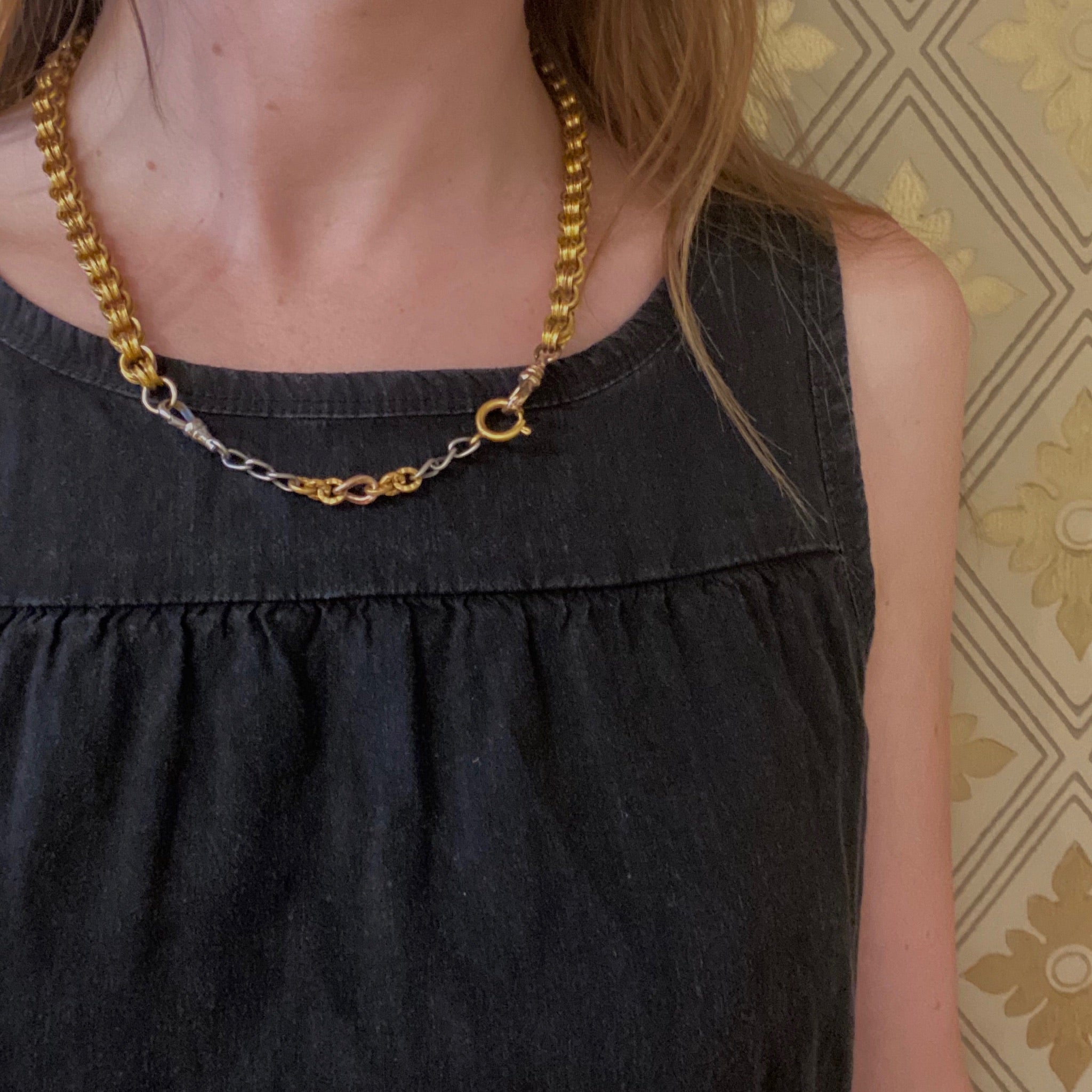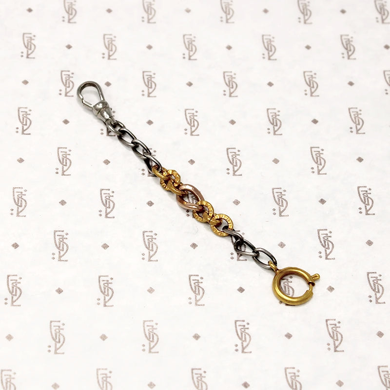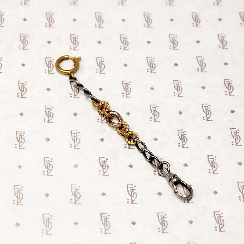 So fun and so versatile, this extra-long, double-clipped charm holder will transform your chain game. Use it to add length, color and texture to your favorite chains. Use it to hang all your charms, fobs and bobs from any necklace. Use it for things we haven't even thought of yet! A gold filled bolt ring and a sterling silver dog clip hook are connected by a variety of silver and gold filled links. Wonderful contrasts in color and texture. All of the bits and pieces are repurposed and recycled.