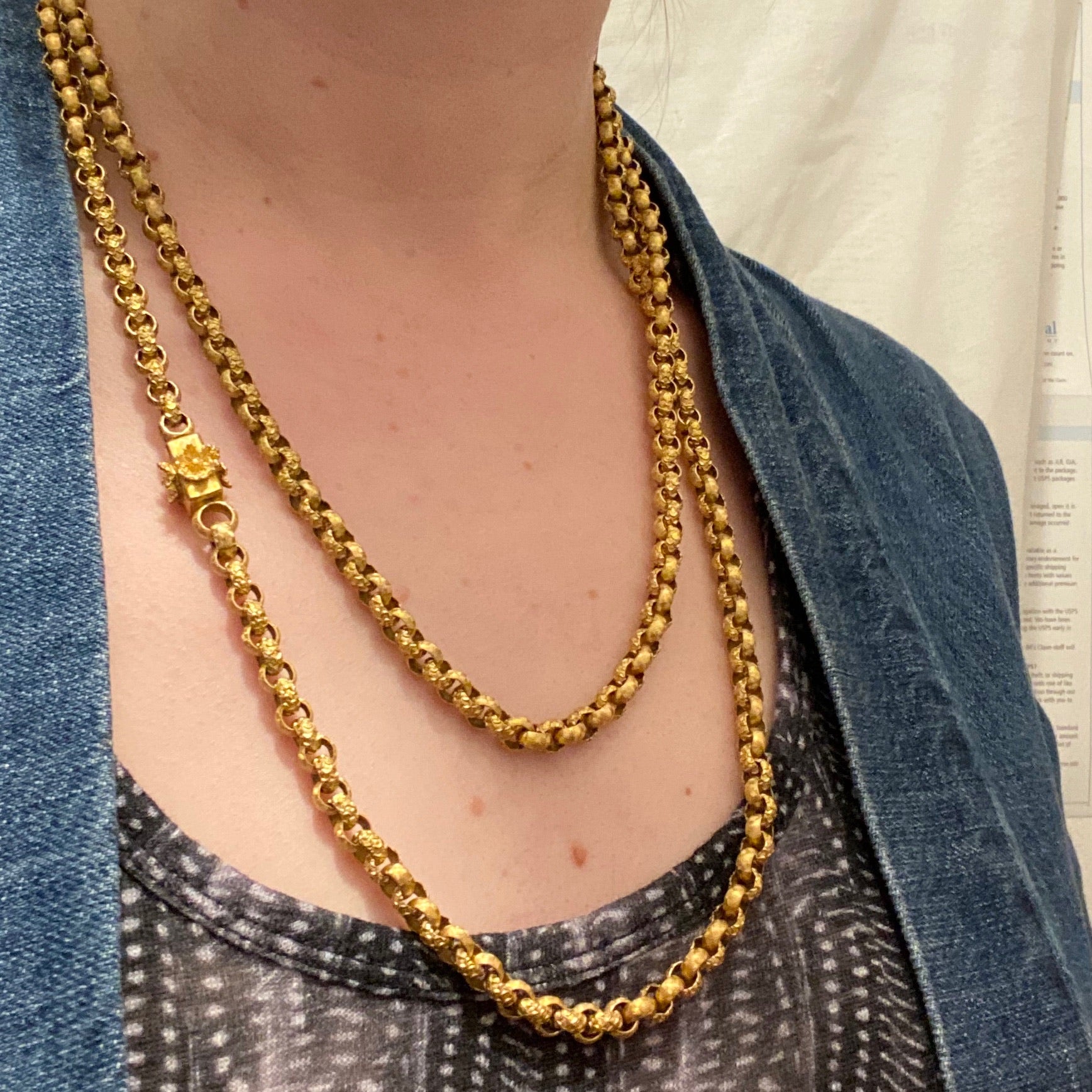 Details.....The chain is 46" long, the chain links measure 6.3mm across, the clasp measures 12.3mm x 10.6mm. In excellent condition. You should always expect some wear on vintage and antique pieces, we consider it part of the charm.