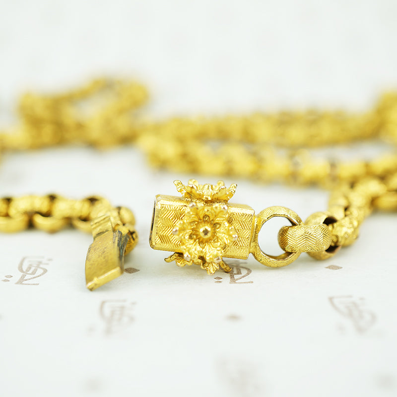 This original Pinchbeck chain dates from the late Georgian period circa 1810. The links alternate between a snake scale design and an engraved geometric pattern, the box clasp is also covered in the geometric design with a golden 3 dimensional flower on each of its four sides.