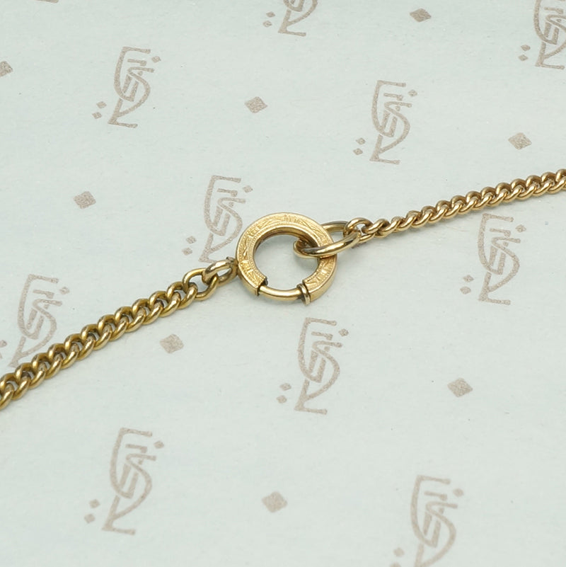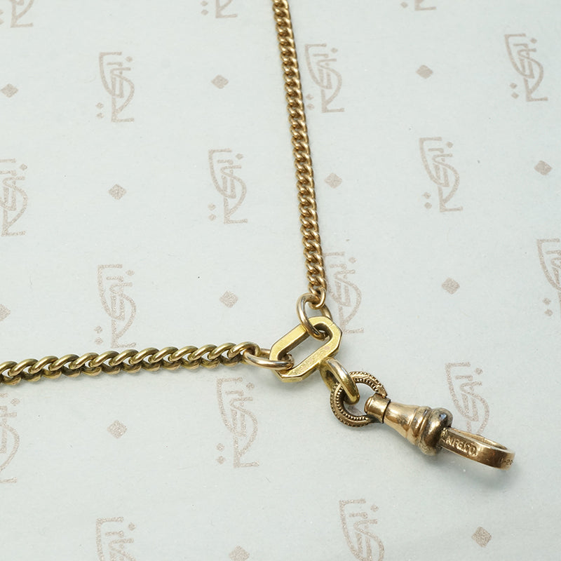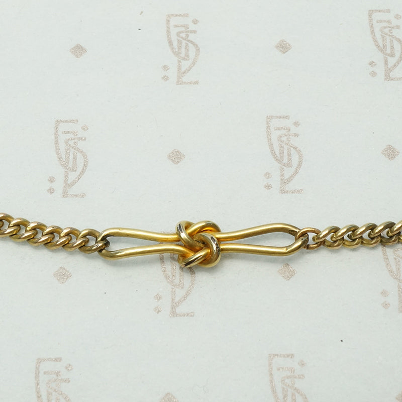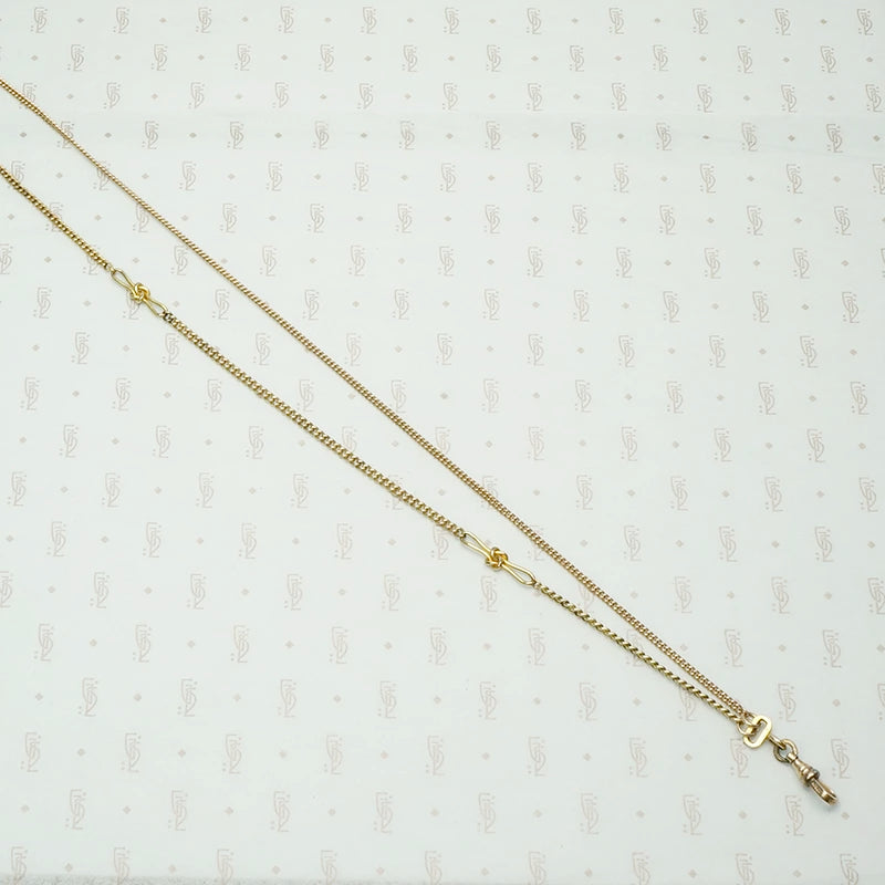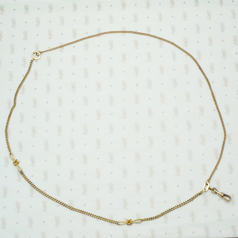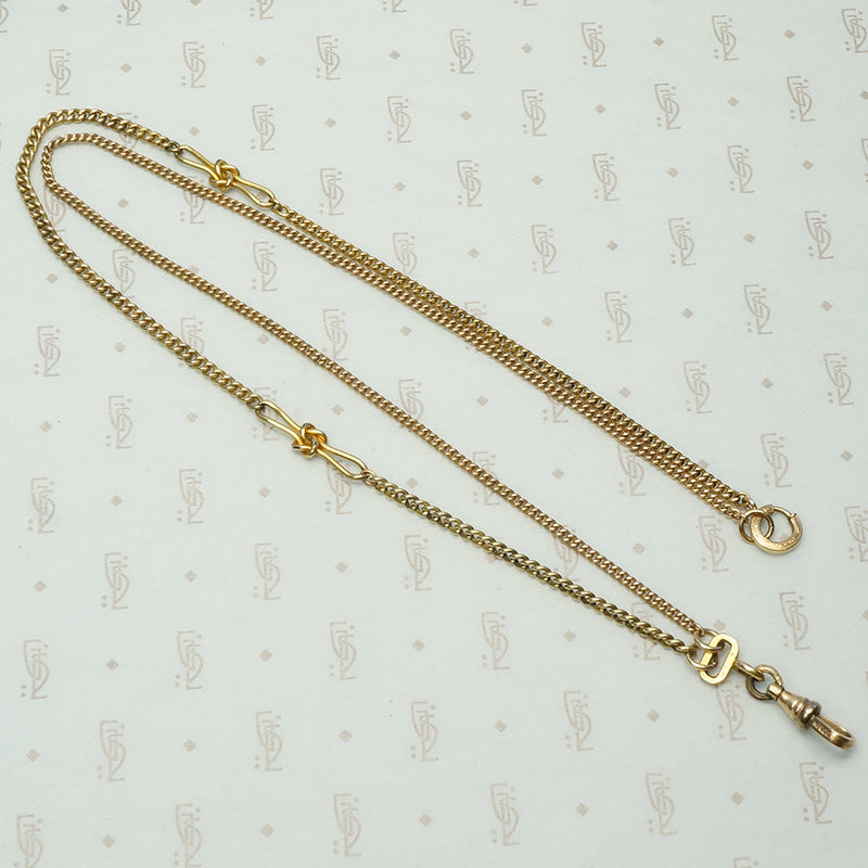 Two pretty flattened curb chains join together in this necklace, one simple and one interspersed with elongated knots. The clasp at the back is a prettily engraved bolt ring and at the front of the necklace is a fancy vintage bit suspending a swivel hook. Perfect for all your fobs and charms. All gold filled, the ingredients date from circa 1900-40.