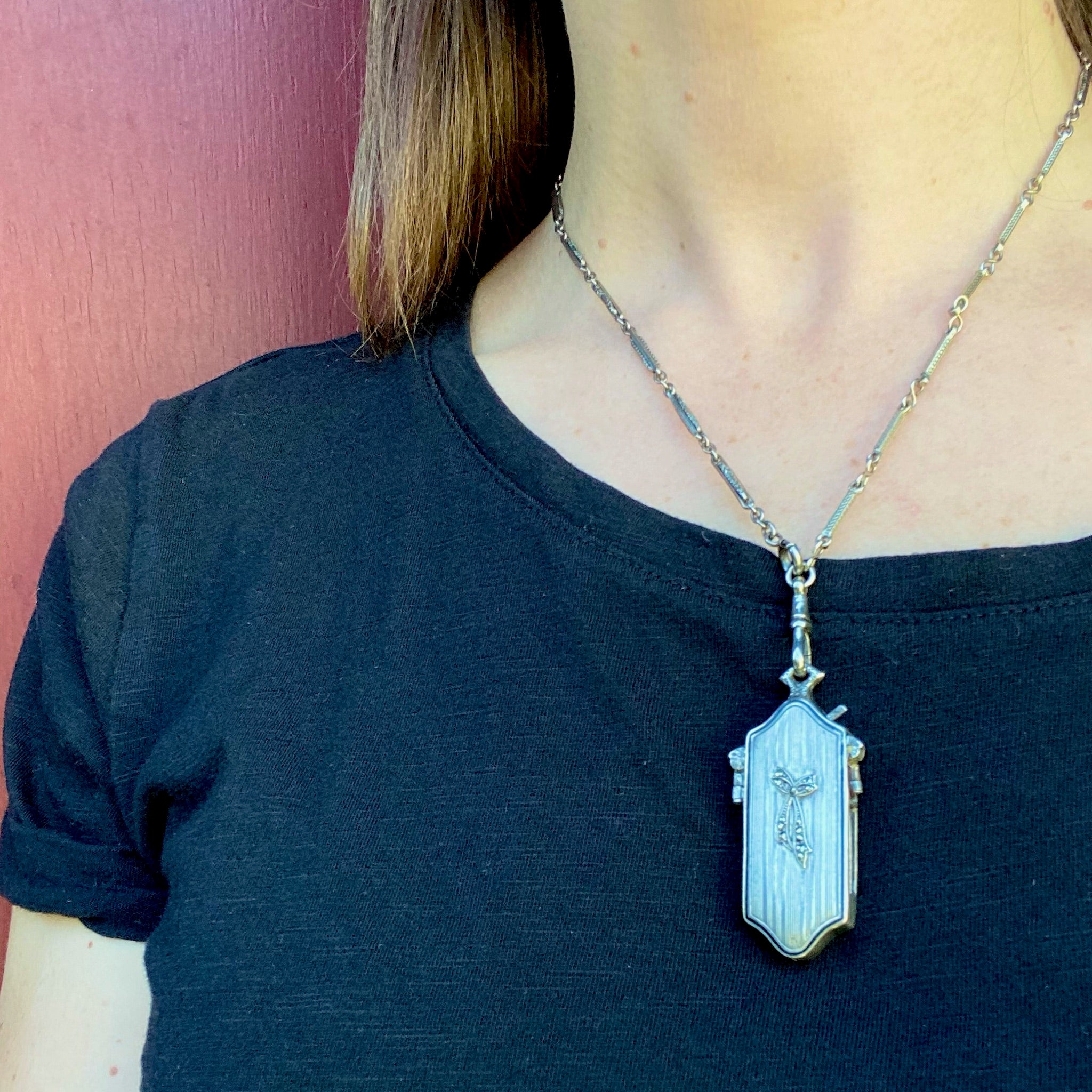 A marvelous folding lorgnette in an engraved sterling silver pendant. The spectacles cleverly unfold from a pinstriped case embellished on the front with a marcasite-set bow. The eye glass lenses sit in exquisitely engraved frames. A decorative integrated bale makes this charming accessory easy to wear on a lorgnette chain or one of our Ancient Influences married chains. You will never lose your readers again. Circa 1920.