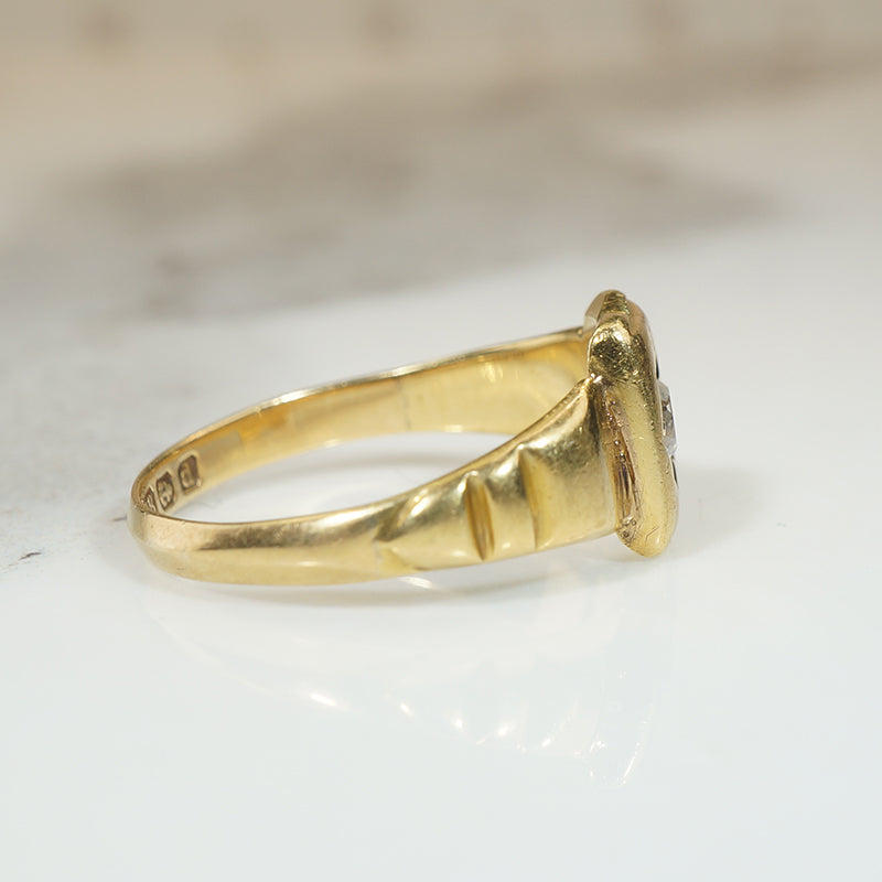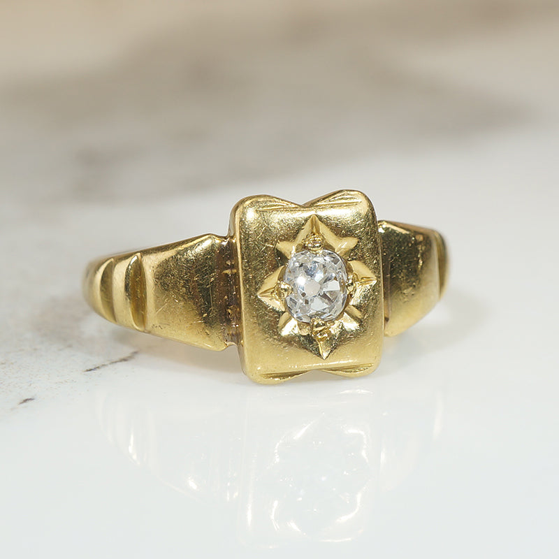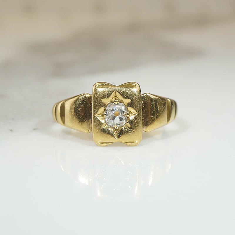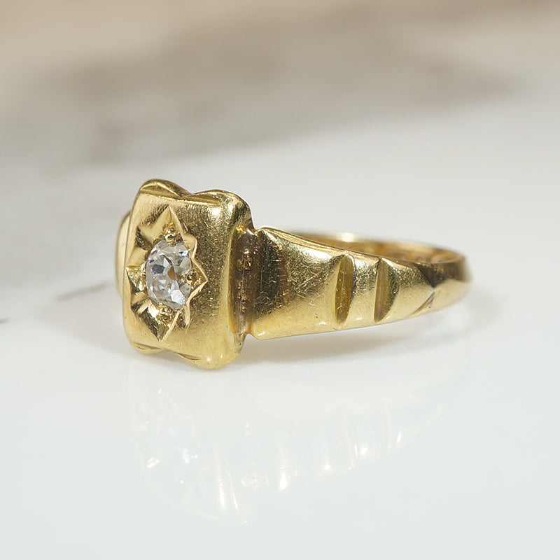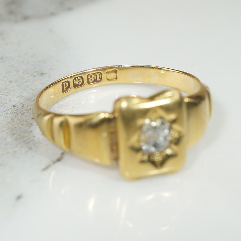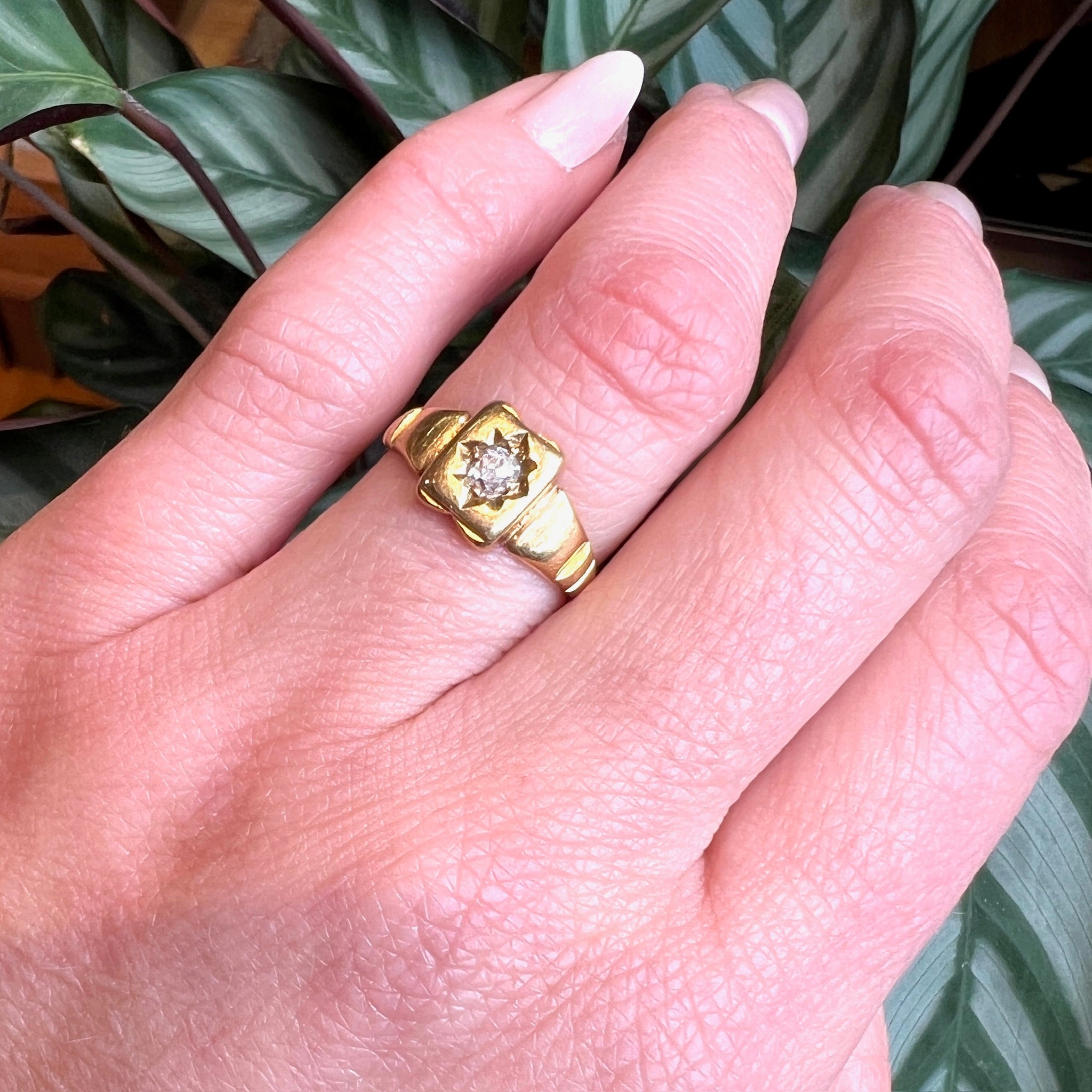 I'm always on the lookout for this ring style and rarely find it. Made in Birmingham England in 1903, the rich 18k yellow gold front panel is set with a .20ct cushion shaped old mine cut diamond. The gold shoulders curve down from the center and flow into a tapered band. Gorgeous and comfortable to wear.