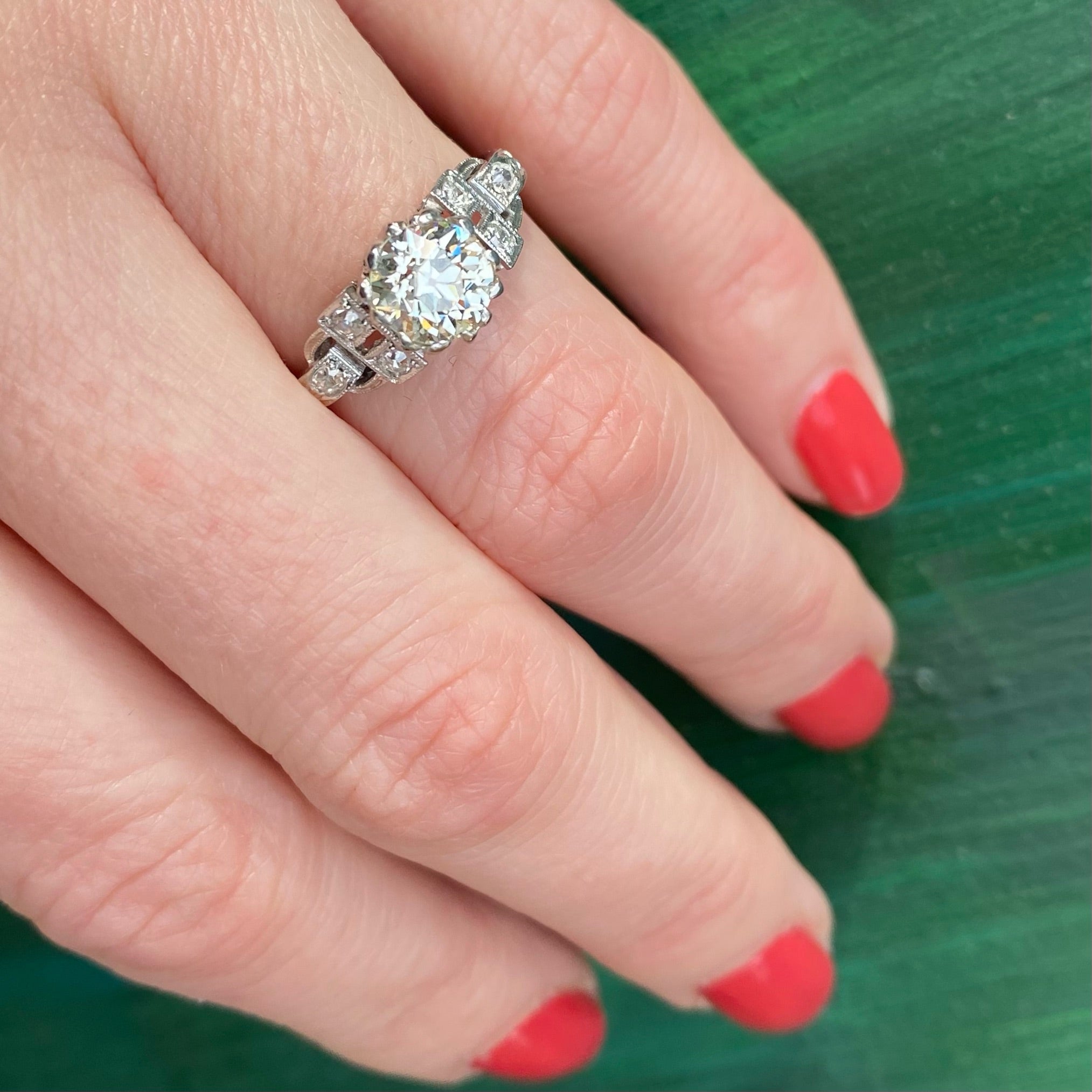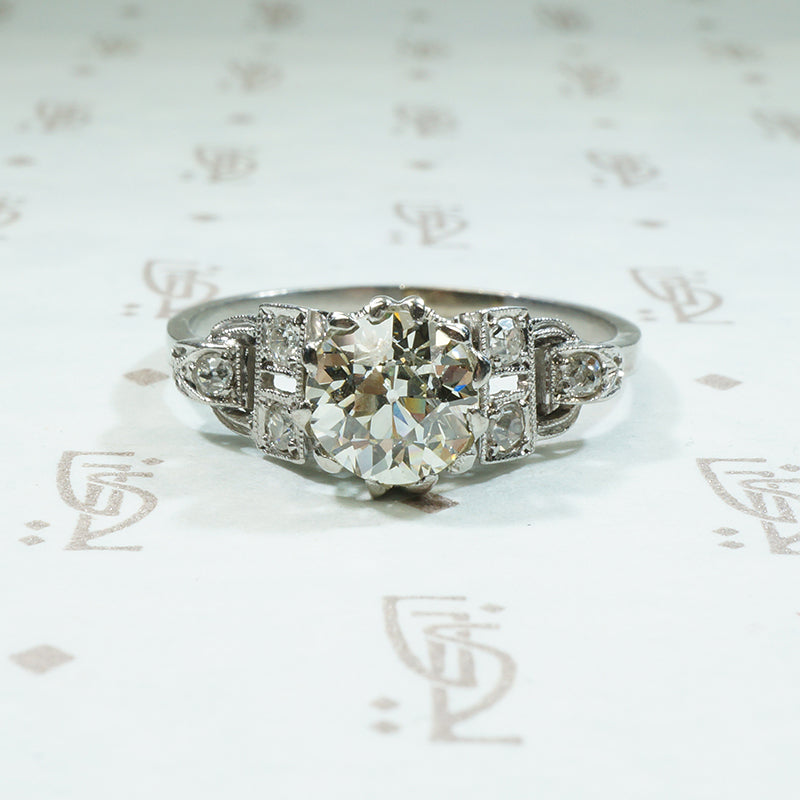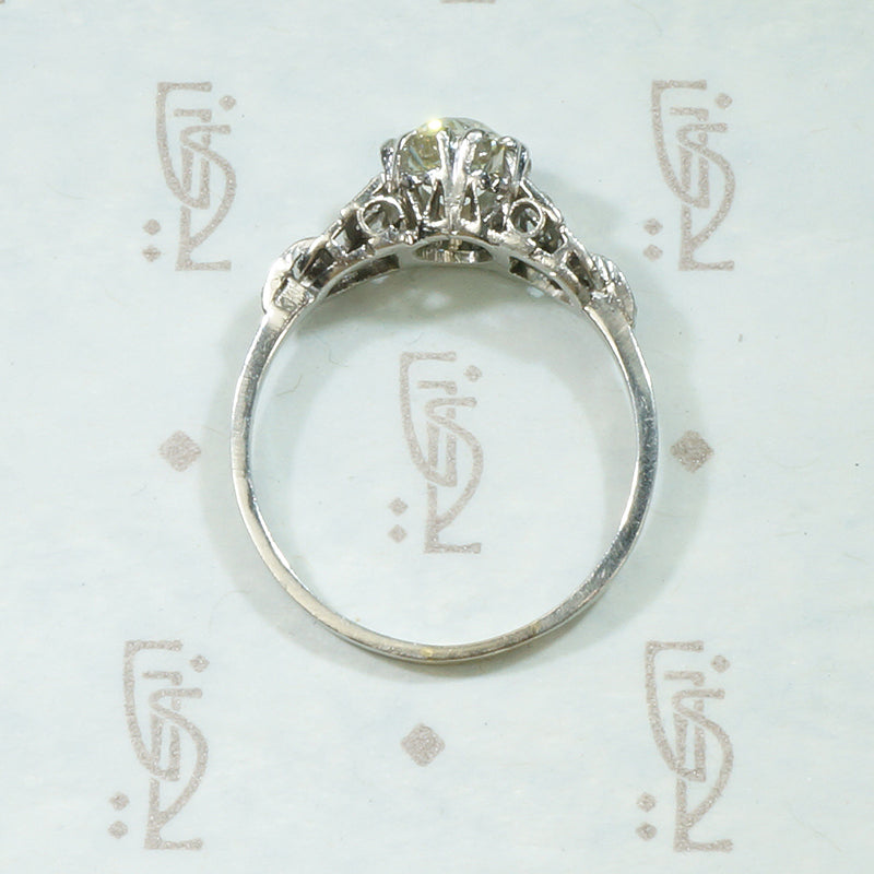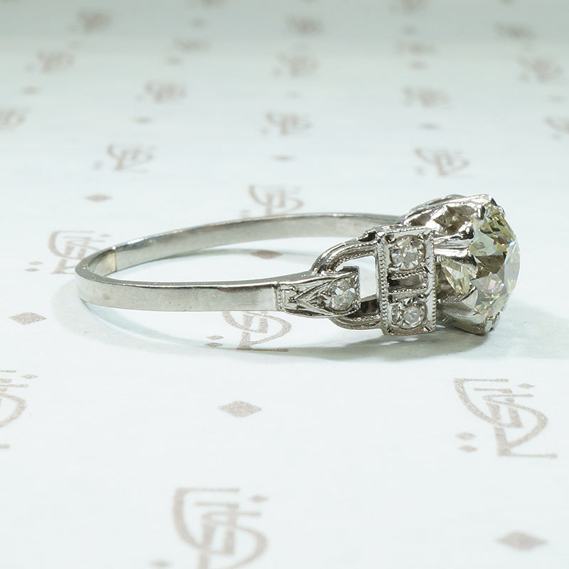 The Old European Cut Diamond in the center of this ring is gorgeous and the setting is perfectly detailed and wonderfully unique. This platinum beauty has open work buckle motif sides with sparkling little diamonds and saw tooth edging. Dating from the 1930's the details make this ring quite unique and utterly charming, add to that the fabulous center diamond and you have the perfect engagement ring.