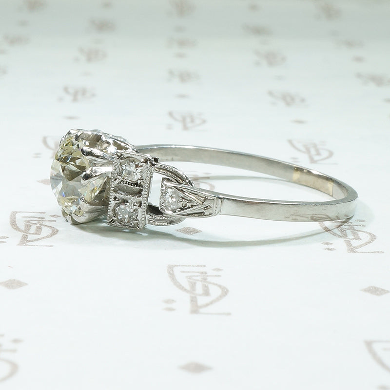 Diamond Details.....The center diamond is 1.25cts, Old European Cut VS2-K/L. There are 6 tiny round diamonds .15tcw.