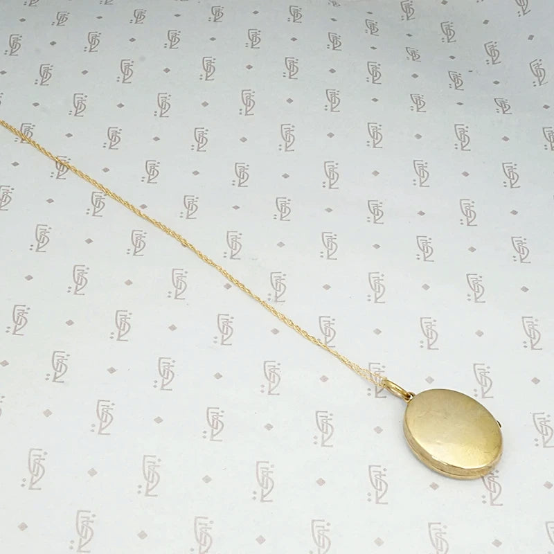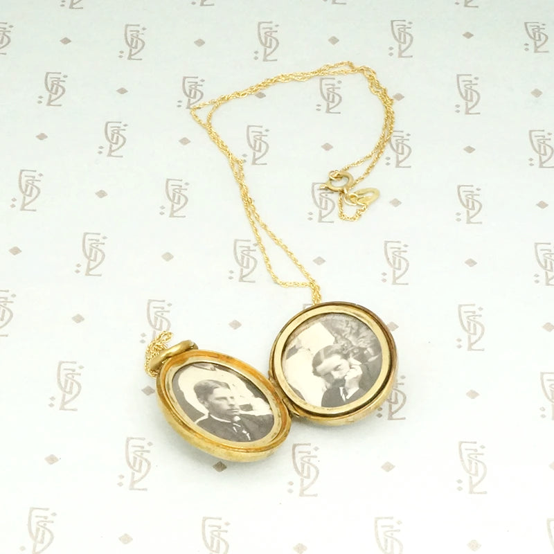 This lovely 9ct gold English locket is a simple and unadorned oval. There is some light wear to the surface of the locket. The generously-sized jump ring that serves as a bale tests as 15ct gold. The frames and the glass are intact, and the wonderful original antique photos depict two handsome Edwardian men. This locket is hallmarked for Birmingham England and the year 1905.