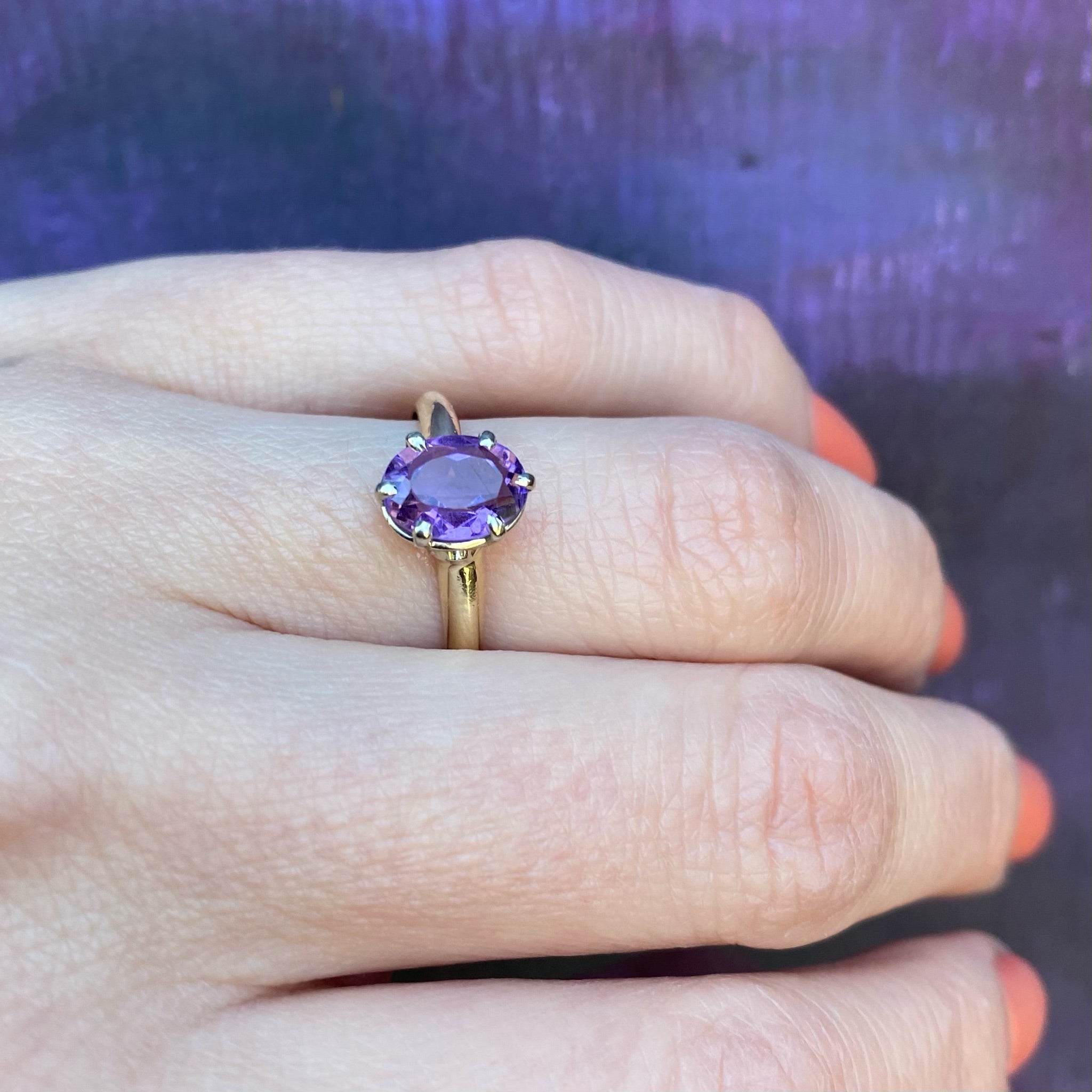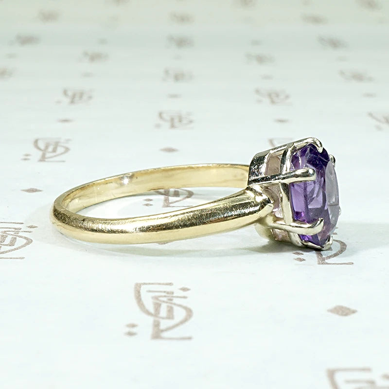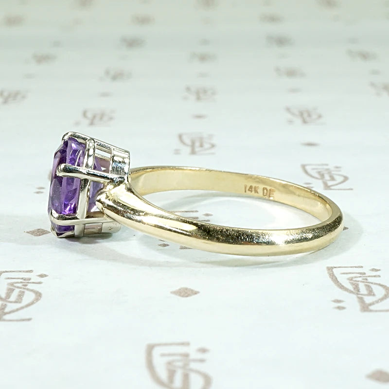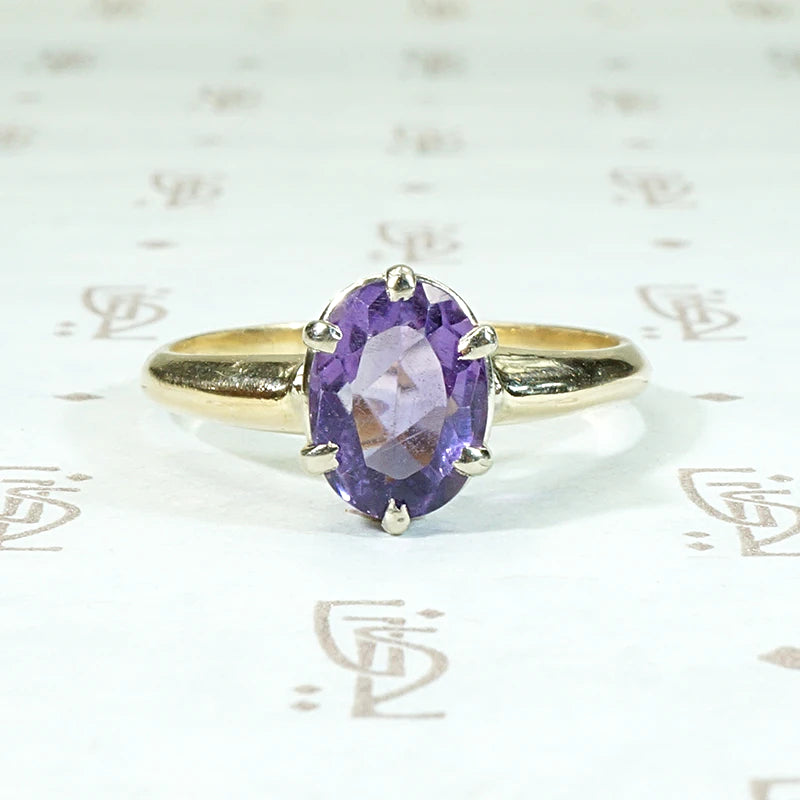 A lovely lavender, oval cut amethyst is set in an elegant 14k gold solitaire setting. The gem sits in a six-prong basket setting over a gently tapered band. This ring would make a delightful alternative engagement ring, or a birthstone ring to honor a February baby. Circa 1950.
