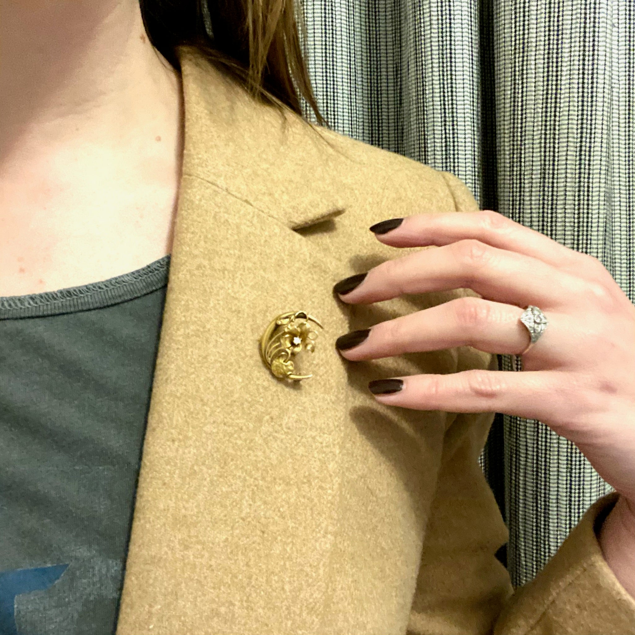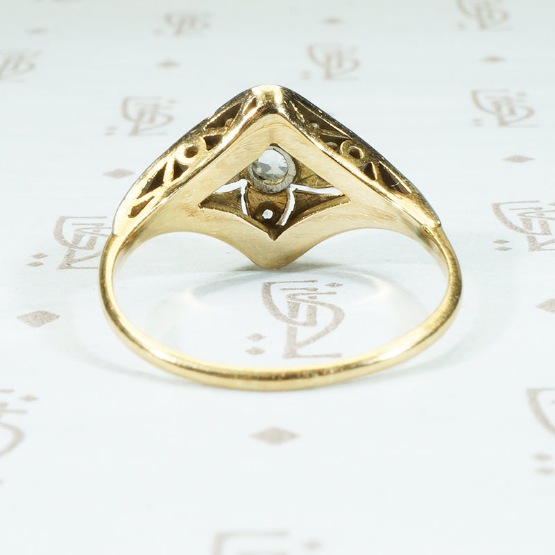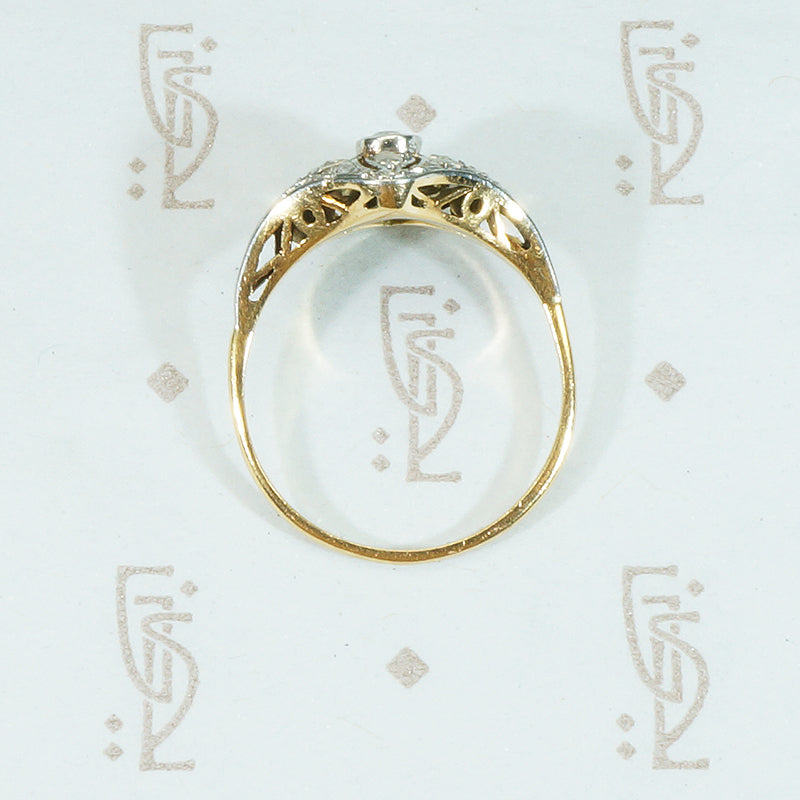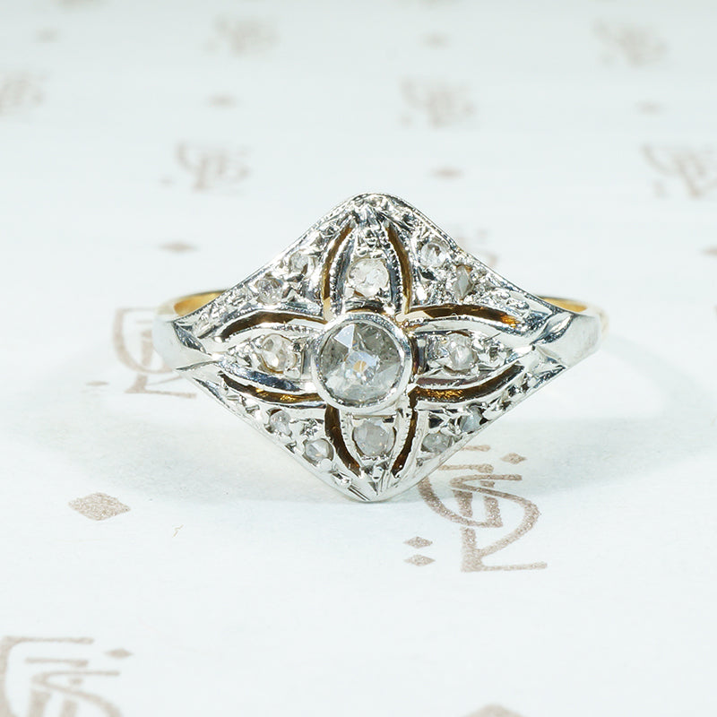 This pretty antique ring is set with an old mine cut diamond and 12 little rose cut diamonds in Platinum on 14k yellow gold. Circa 1910.