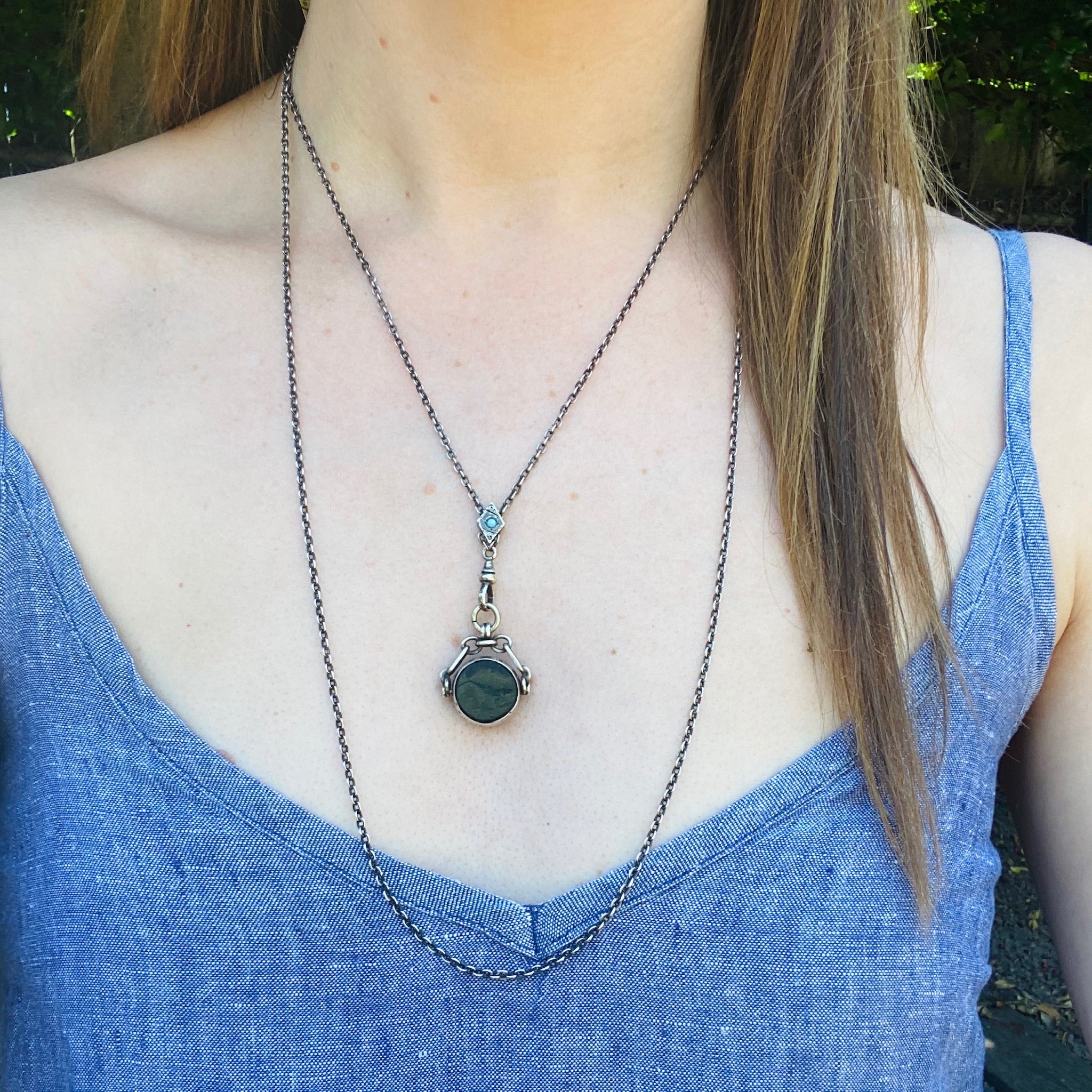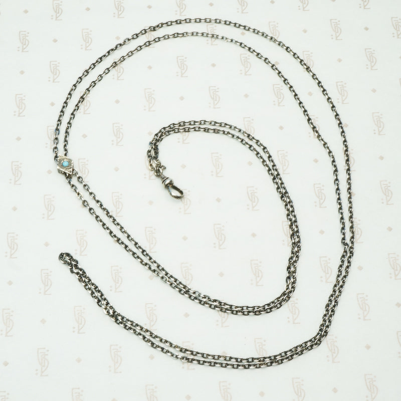 It is unusual to find a Victorian slide chain in sterling silver, this makes this chain all the more special. The diamond shaped slide is set with a tiny round of glass in the color of blue turquoise.