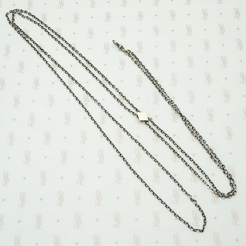 Details.....The chain measures 49" long, the slide measures 10.3mm x 6.9mm and the hook is 16.2mm long. In Very Good antique condition. You should always expect some wear on your vintage and antique jewels, we consider it part of their charm.