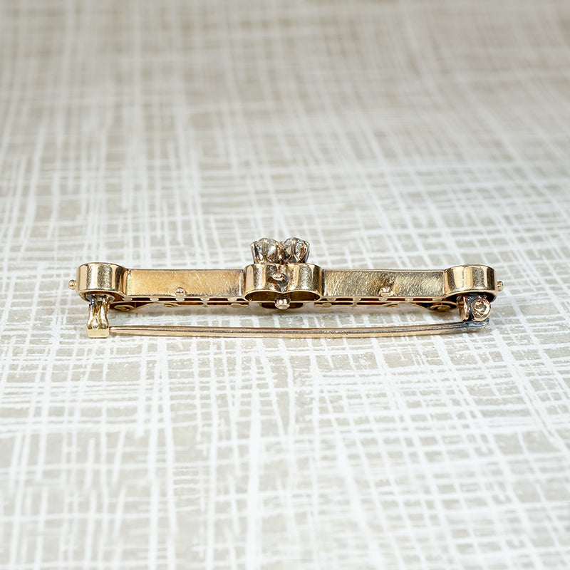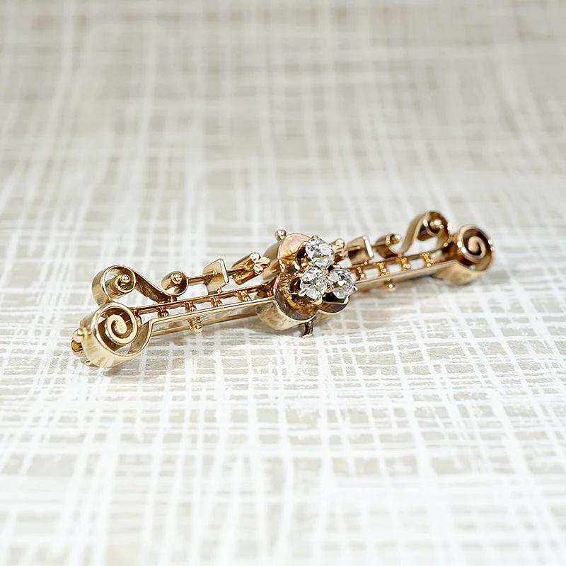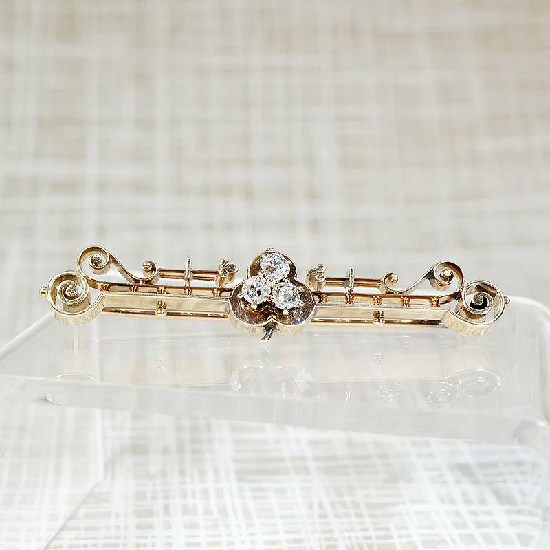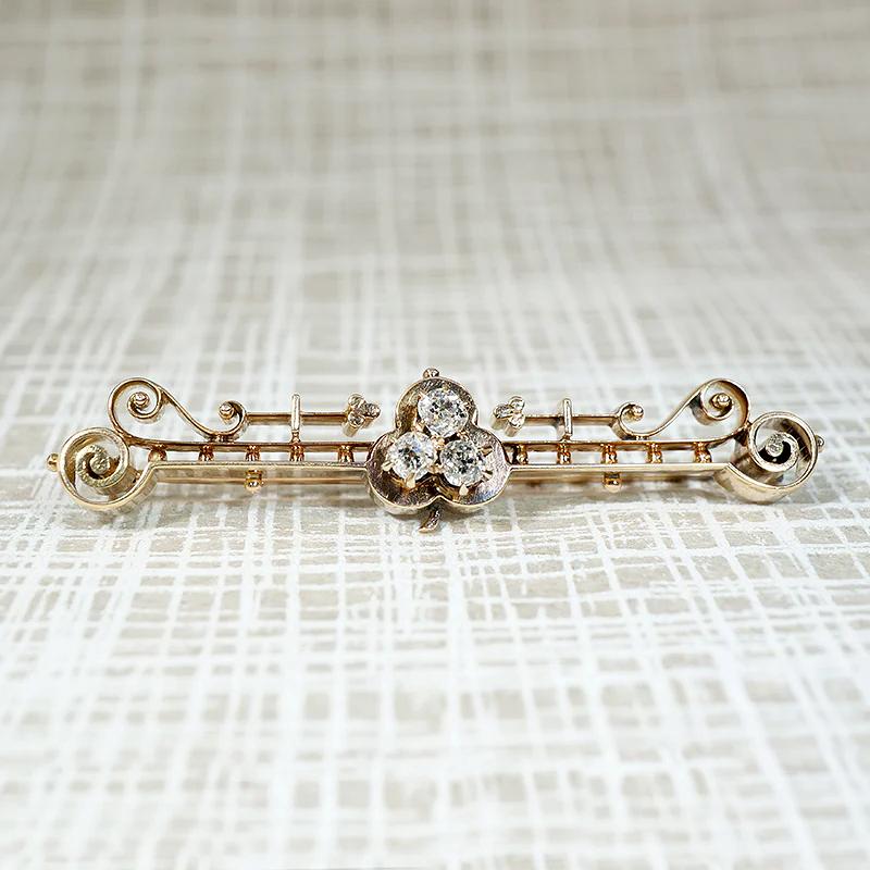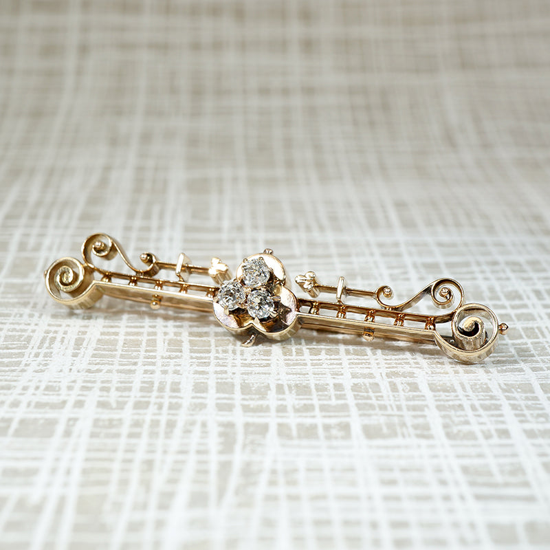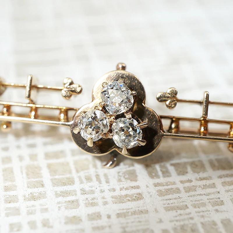 Classically Victorian, this 14k gold brooch is elaborately wrought with a sweet sentimental motif. The light and airy brooch is a variety of bar pin. Parallel vertical and horizontal gold lines form the body of the pin, terminating in fancy scrollwork at each end. A lucky three-leaf clover sits at the center, claw-set with three wonderful old mine cut diamonds. The funky, chunky stones have a 0.45tcw. Wee gold beads and leaves add pretty accent details. The brooch secures with a security clasp, an early 20th Century replacement. Circa 1890.