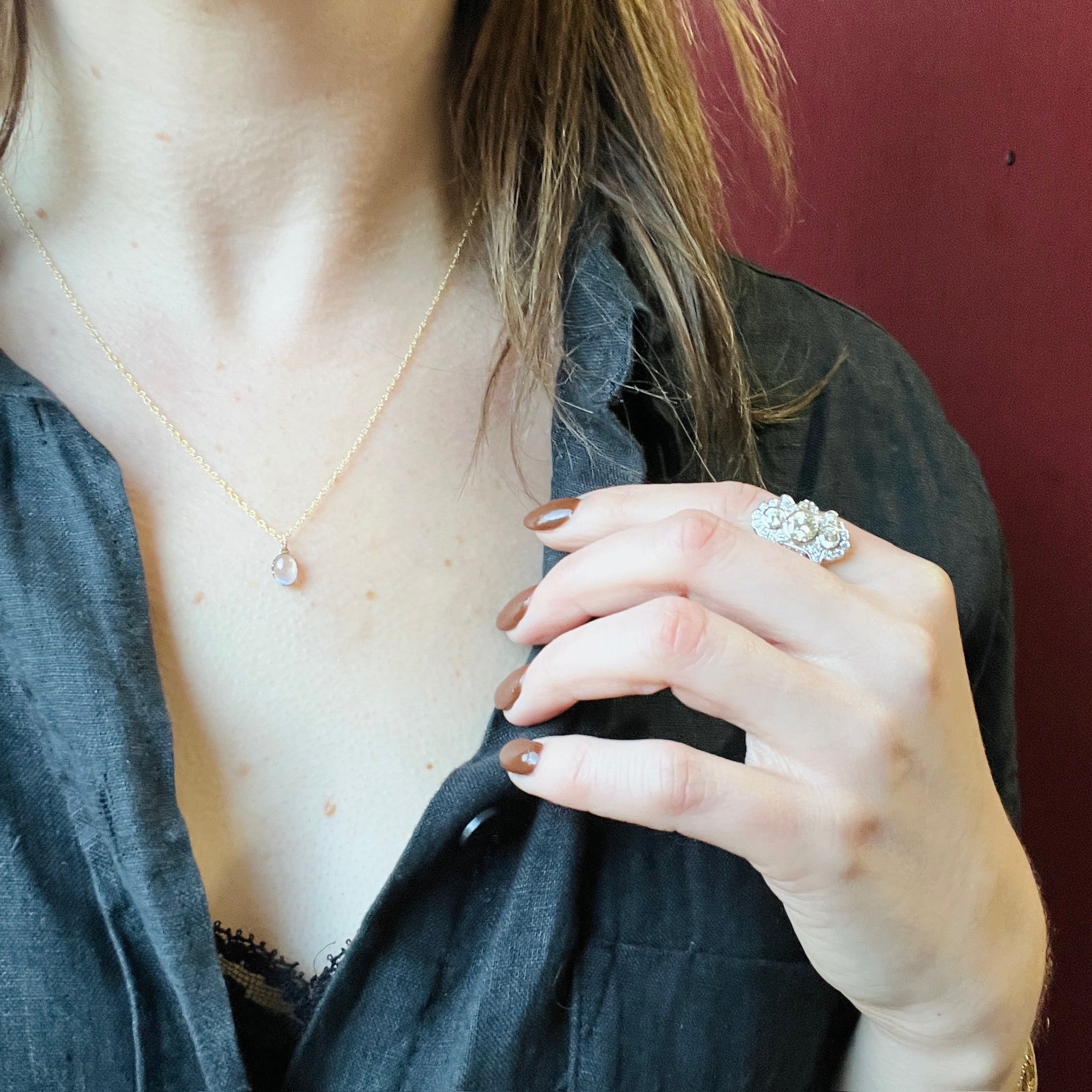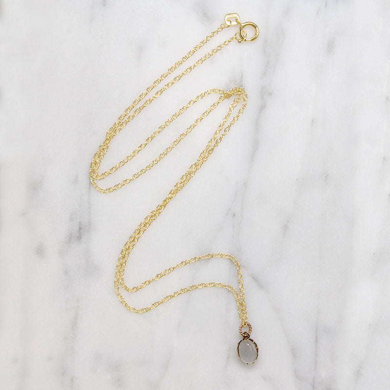Details... The moonstone pendant measures .22" by .27". The chain is 18" long. In Good Antique Condition, with a small loss to the back of the setting that is not visible from the front. You should always expect some wear on your vintage and antique jewels; we consider it part of their charm.