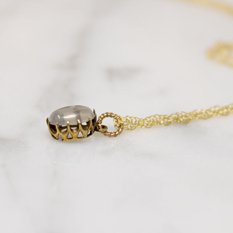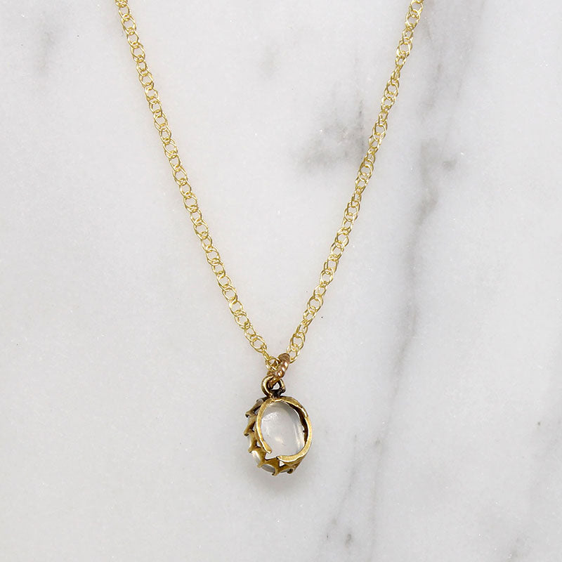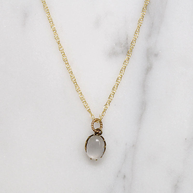 Otherworldly moonstones have a magical adularescence, an effect caused by light scattering between their microscopic layers. This romantic antique pendant features a glowing moonstone in a delicately scalloped 11k yellow gold claw setting. There is a small loss to the back of the setting; it is not visible from the front and does not detract from the pendant's beauty. The white cabochon moonstone is reminiscent of a dewdrop or a soap bubble. The pendant hangs from a decorative twisted jump ring bale on a modern 14k gold rope chain. Circa 1900.
