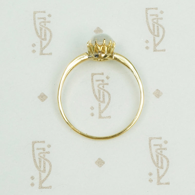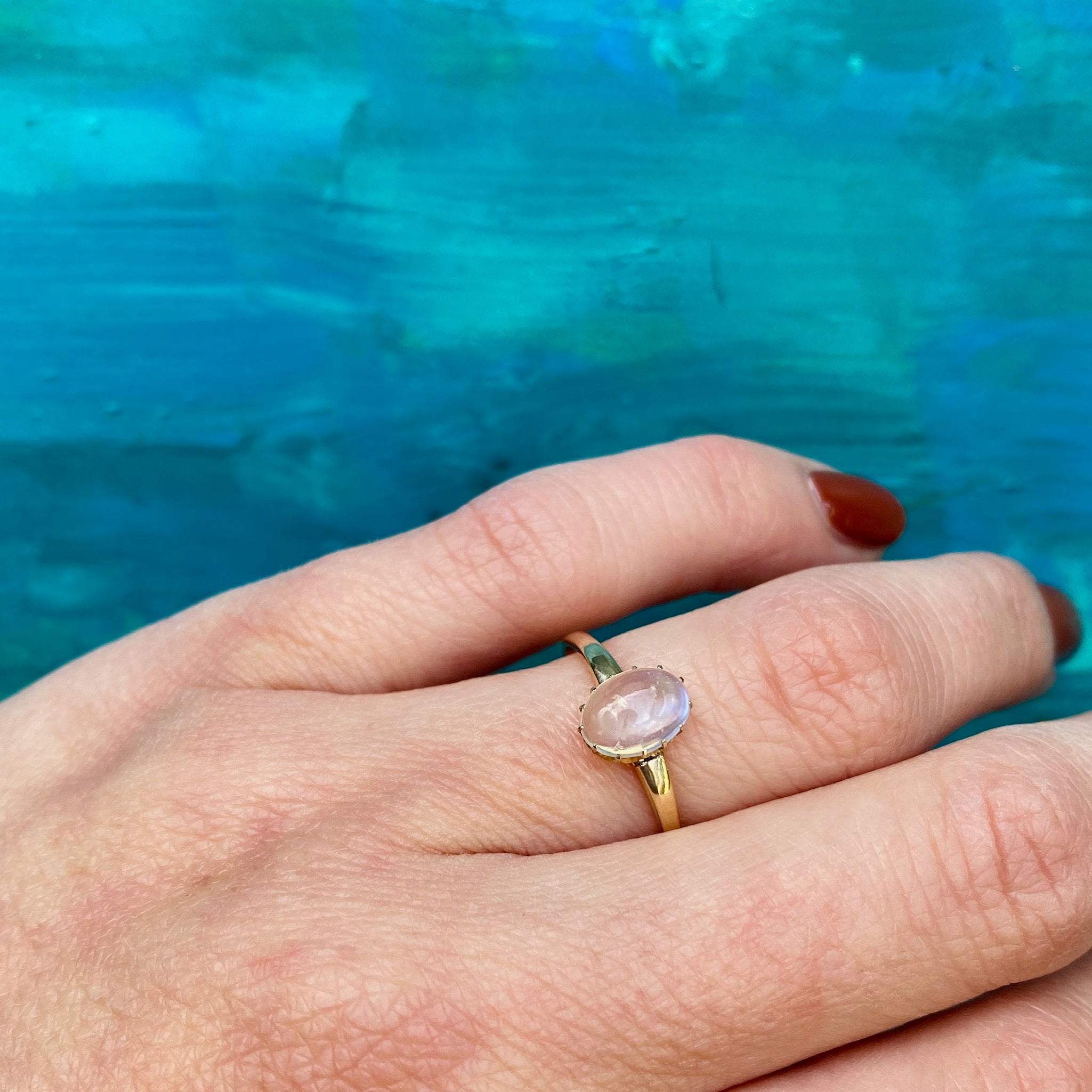 A lovely chubby oval Moonstone in its original 11k Gold claw mount is set in a handcrafted 14k gold setting creating a simple yet beautiful ring. The newly hand crafted gold is recycled.