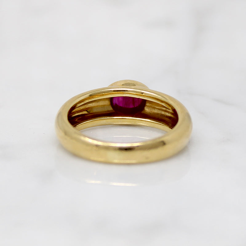 Rich, red ruby and lush, high carat yellow gold is such a luxurious combination. This buttery ring is curvy and sensual, with nary an angle to be found. The heavy, tapered 18k gold band is set with a cabochon ruby; the oval ruby nestles horizontally in a chubby raised bezel. The interior of the band is stamped "750", indicating 18k gold. This is one of those fascinating jewels that feels both ancient and modern. What an interesting engagement ring it would make. Circa 1980.