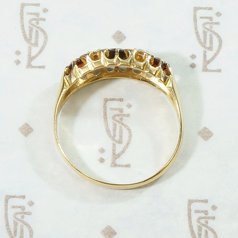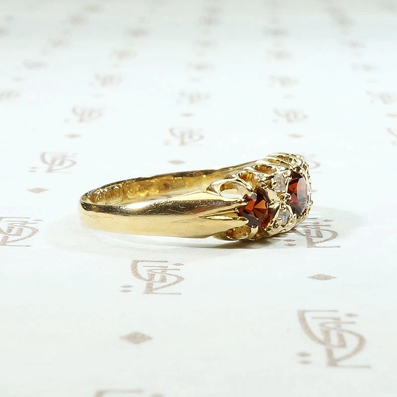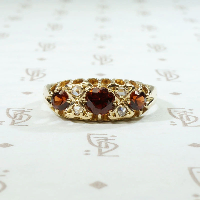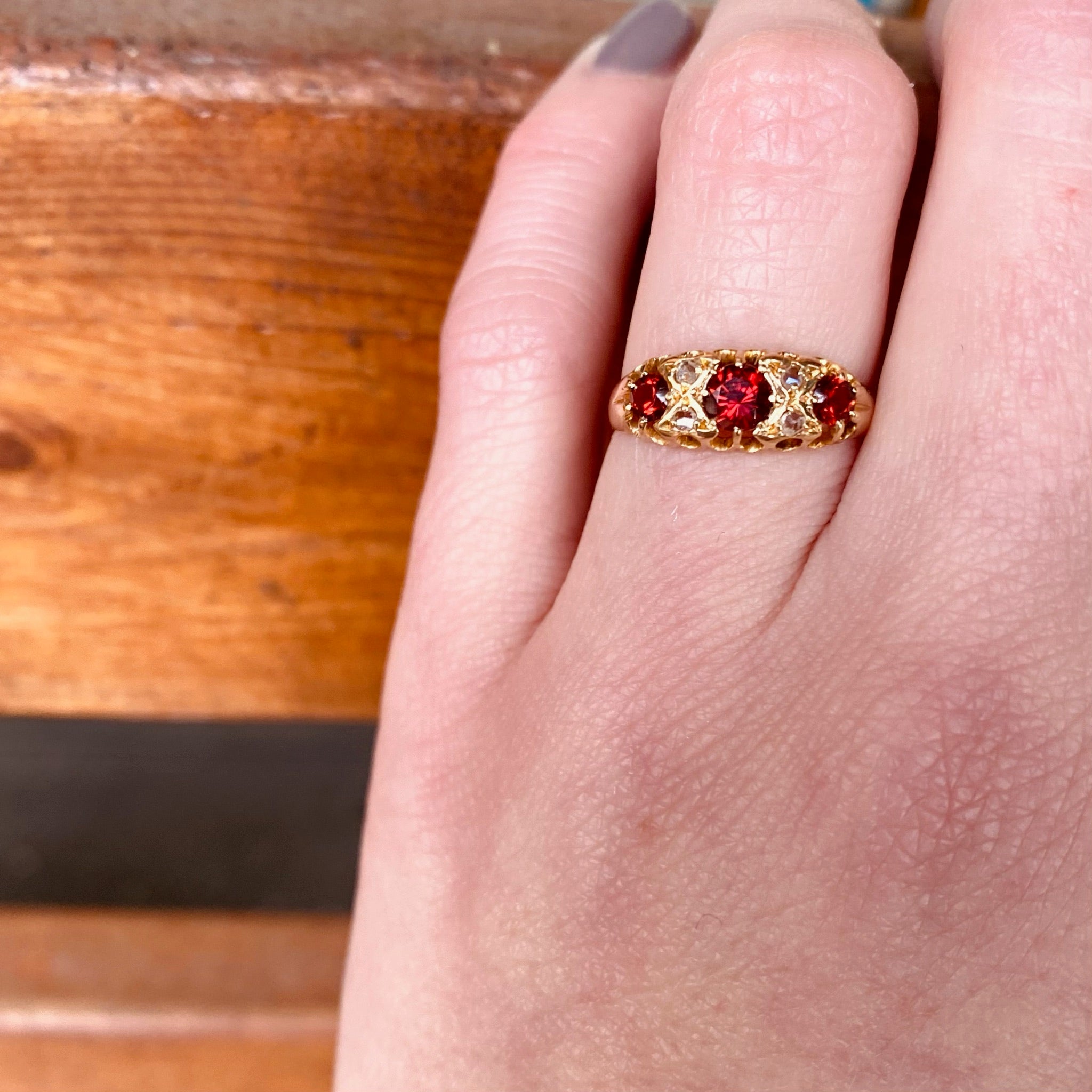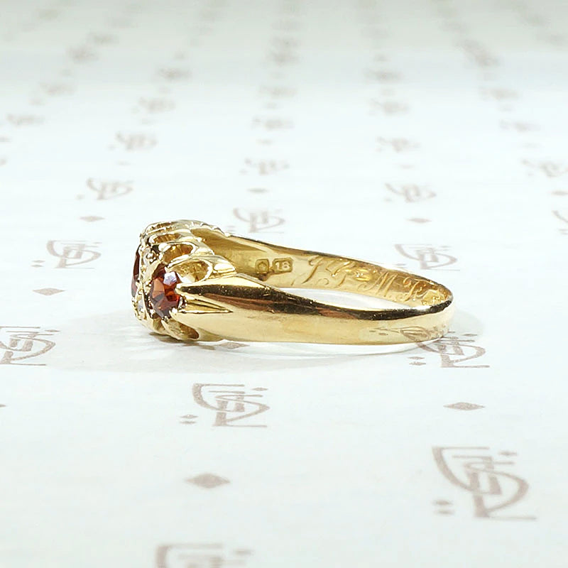 Rich, warm wine-colored garnets and buttery 18k gold are such a lush combination in this Victorian ring, with rose cut diamond accents for sparkle. Three garnets are claw set across the top of this gorgeous antique band. Two little rose cut diamonds are set in an "X" between them. The personal inscription "IG *MJ" is hand engraved inside the band. Hallmarked for Birmingham, England and 18ct gold. Circa 1890.