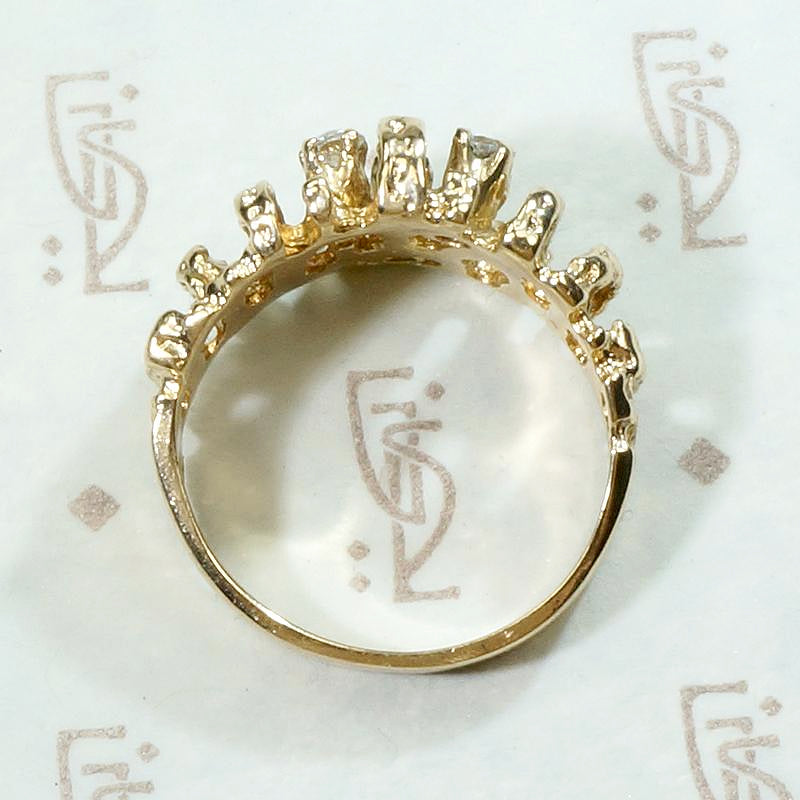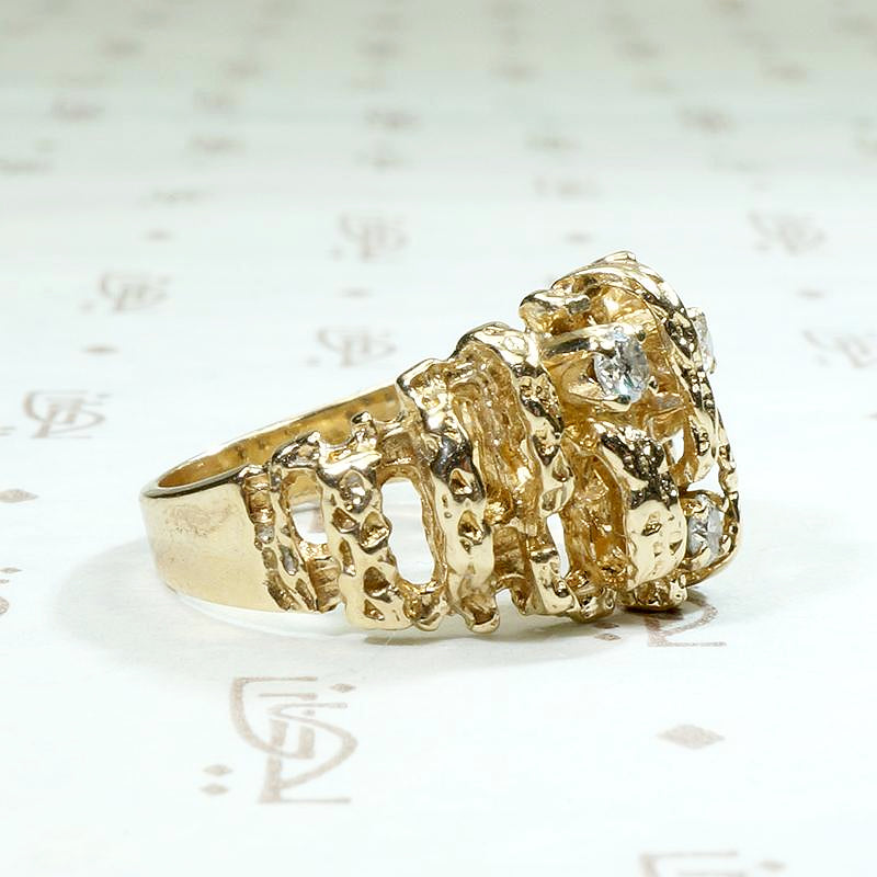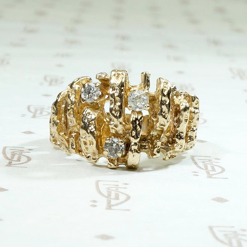 This fascinating Brutalist ring has the organic feel of a coral reef. The body of the ring is 14k yellow, with a texture reminiscent of undersea coral or stone. Three little diamonds nestle among the crags. A harsh yet luxurious landscape that draws the eye and sparks the imagination. The interior of the band is marked "14KP," "MW3" and "20." Circa 1970.
