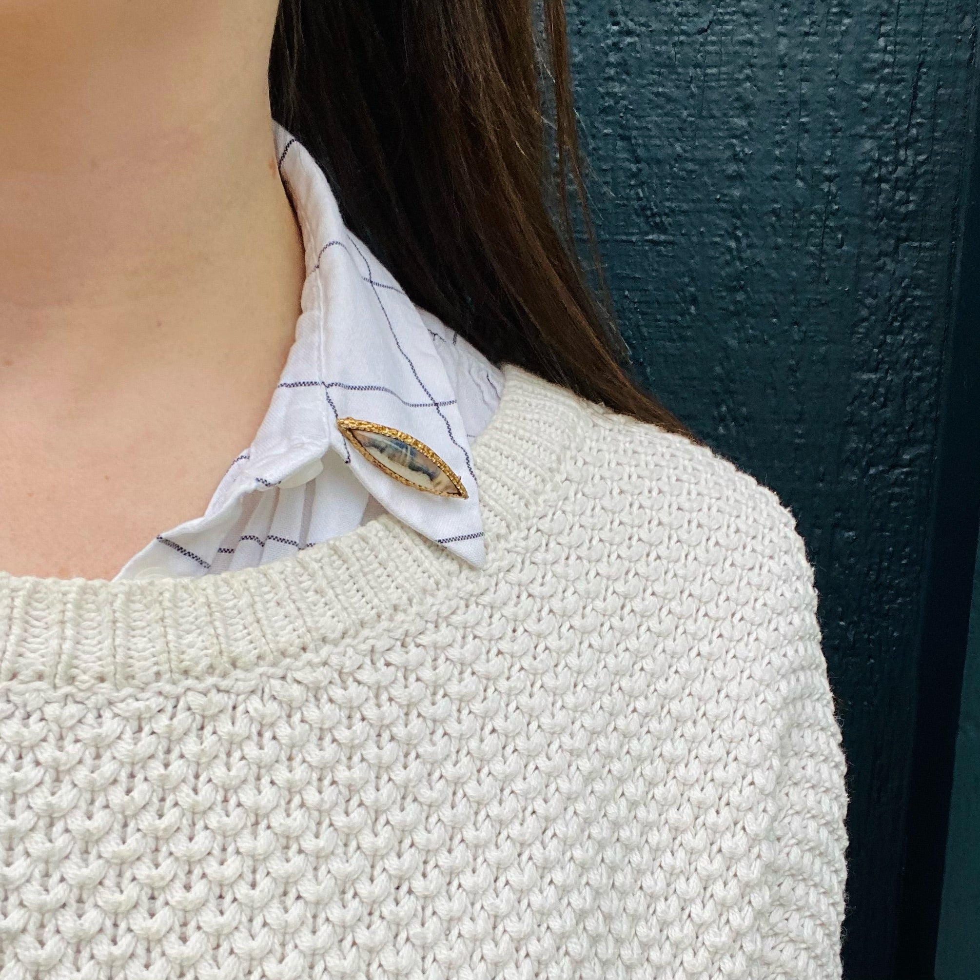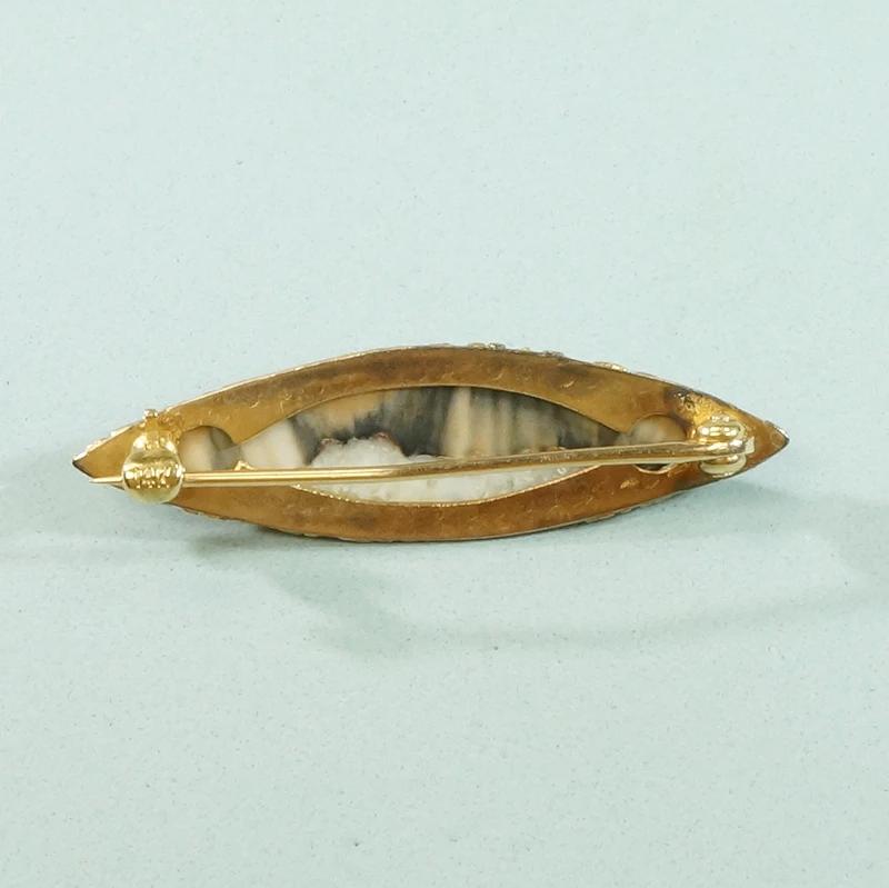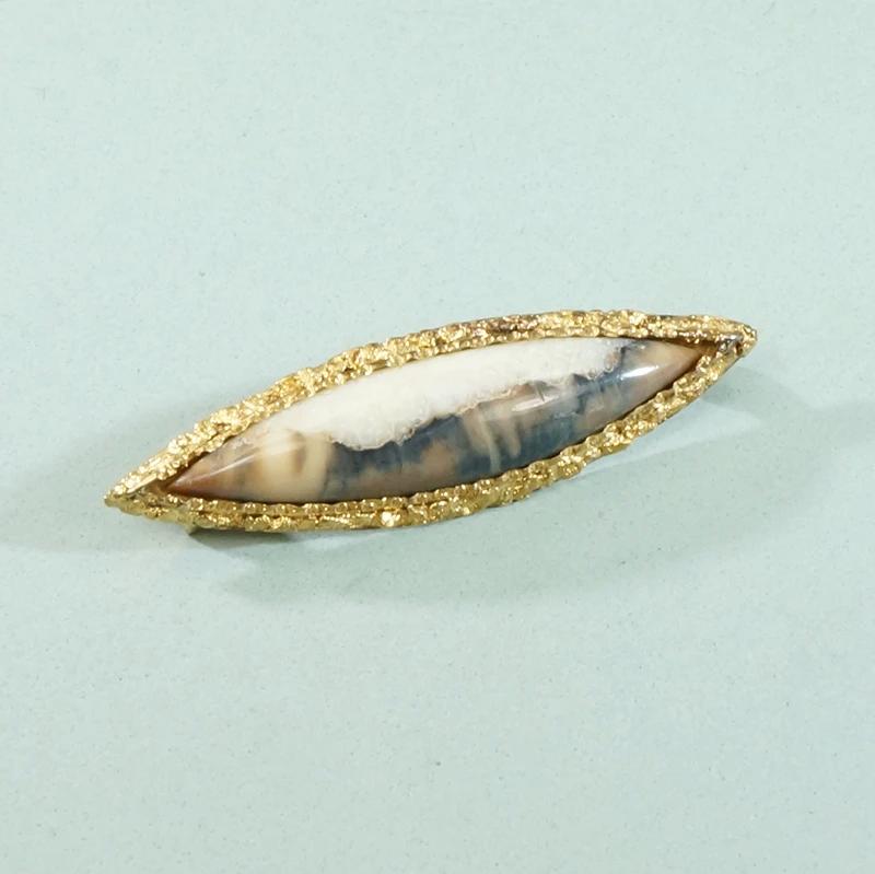 The Alaska gold rushes inspired a unique jewelry style. Nugget and gold quartz jewels were abundant, as in the California gold rush. While the Alaskan rush also unearthed exotic materials like petrified mastodon and walrus tusks and brought them into usage in fine jewelry. This late Victorian brooch is a perfect example of an Alaskan gold rush jewel, with a navette of petrified mastodon tusk framed in 24k gold nuggets. The back of the brooch and its pin are 14k yellow gold. Circa 1900.