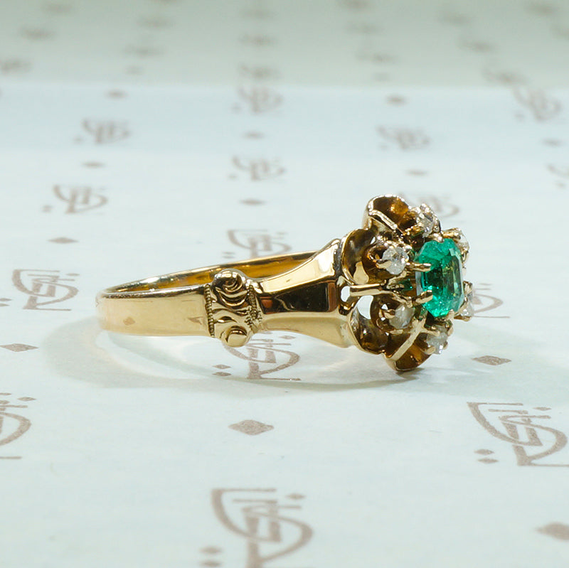 Dating from the late 1800's this charming ring holds a 1/4ct squarish emerald in the center of six rose cut diamonds. The curved spaces under the diamonds have that wonderful bloom, a rainbow like effect that can occur on very old gold. The band has a sculptural design with rose like detail. The gold is 10 to 12k.