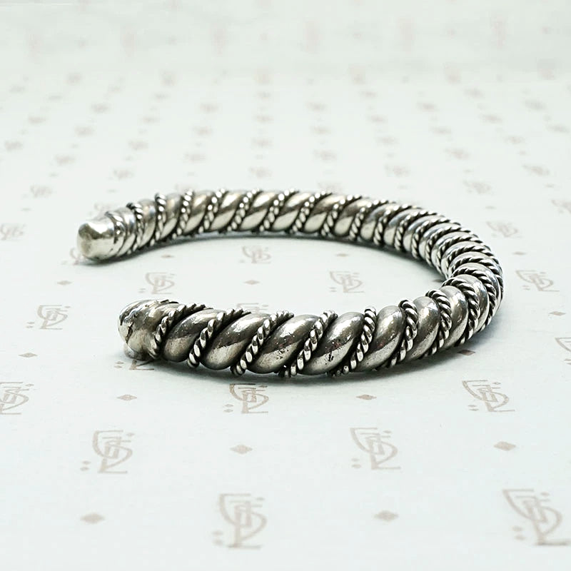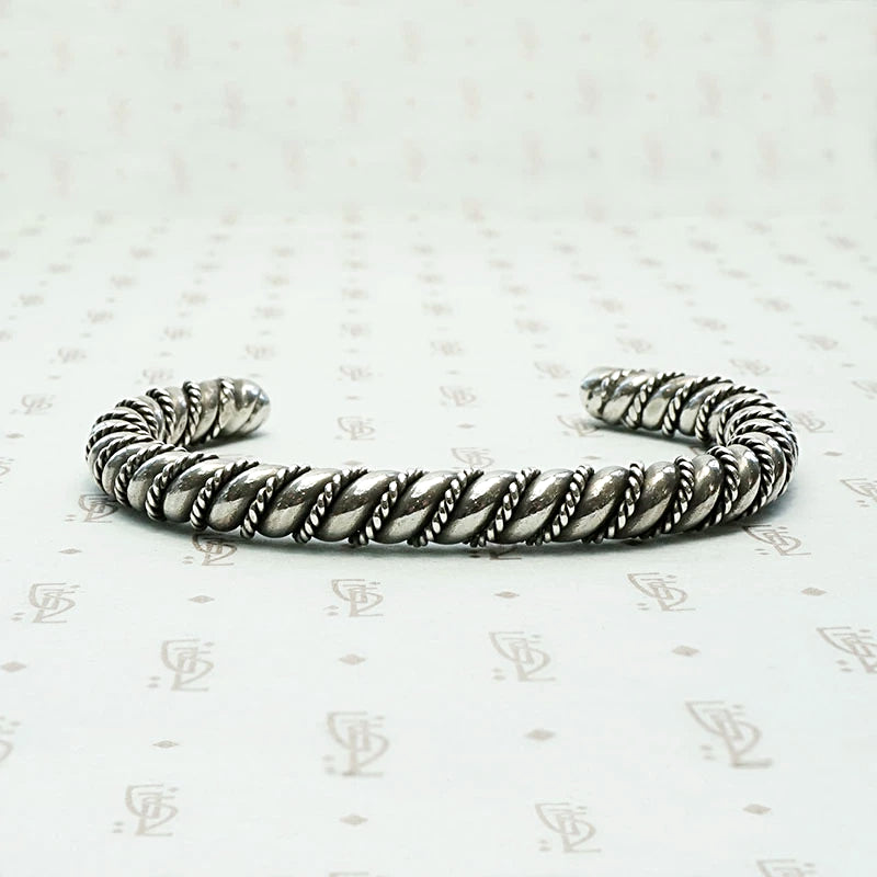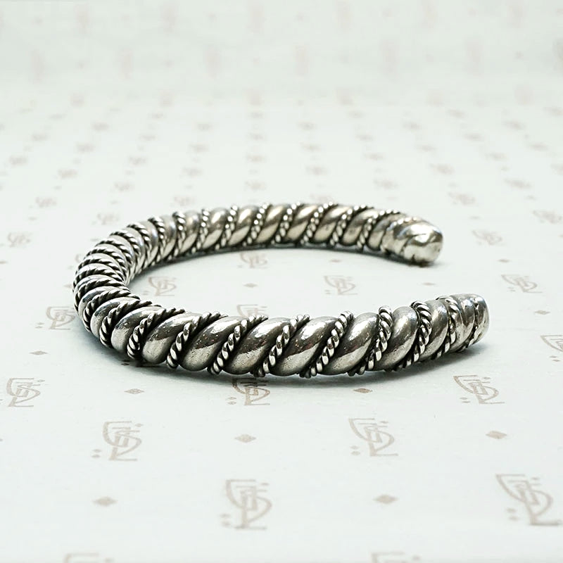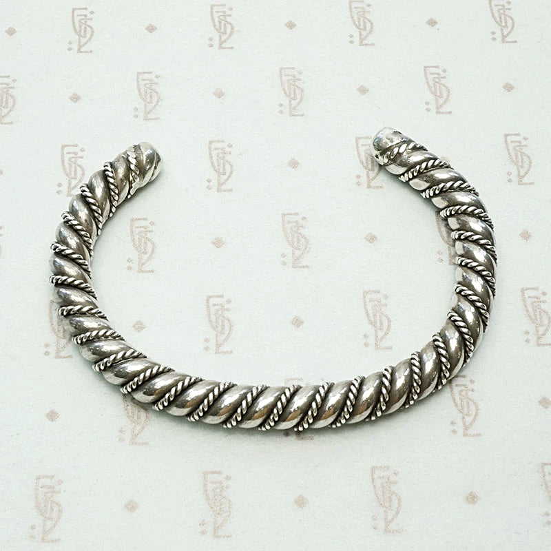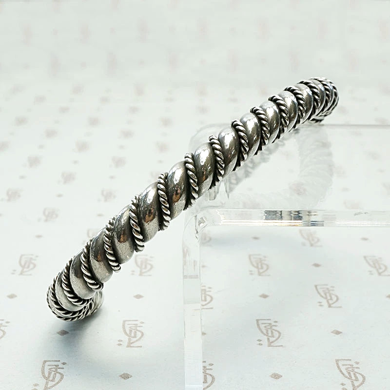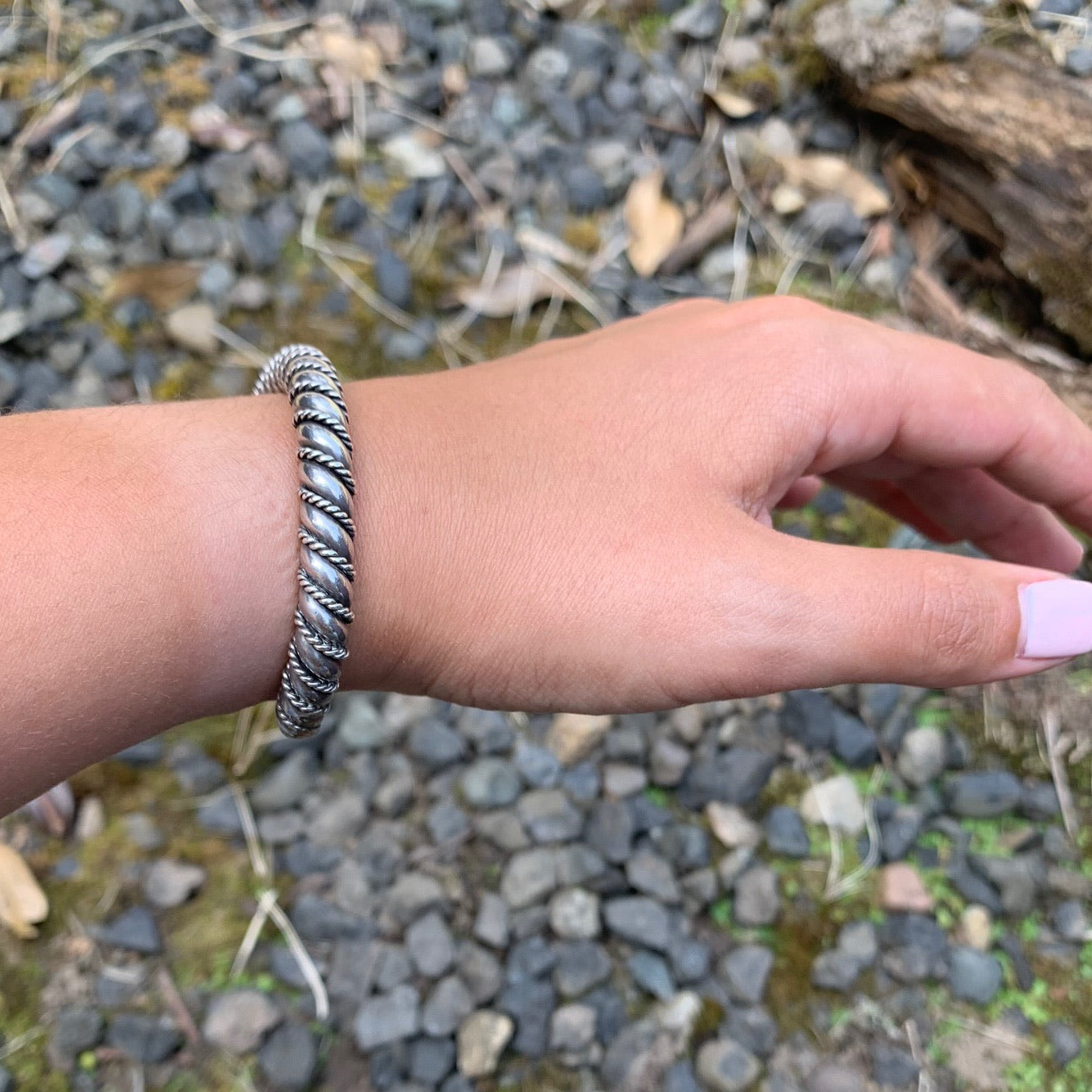 Twisted sterling silver cuff bracelet. A little silver twist is twisted into a larger silver twist...it's so meta. This cuff is handsome. Great on its own or layered with bracelets with colors or other textures. Circa 1970.