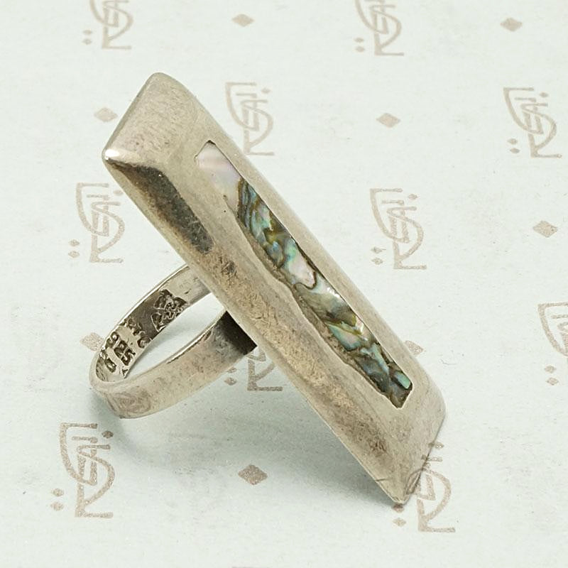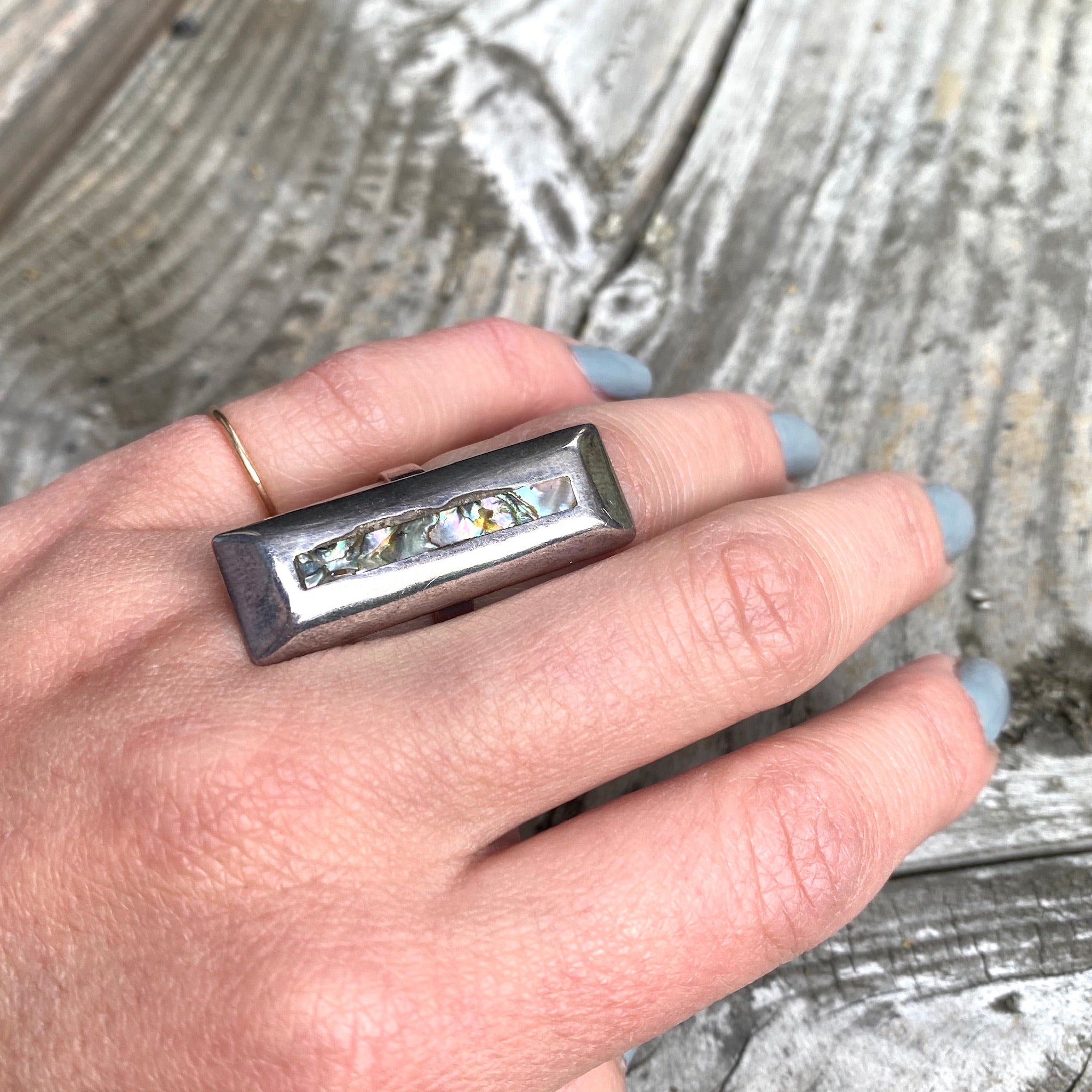 A beautiful abalone panel ring made in Mexico in the 1950s. This elegant piece exhibits a slab of iridescent abalone set in sleek sterling silver. Subtle in color and texture, its size makes the statement. The ring is stamped with Mexico's eagle 22 assay mark.