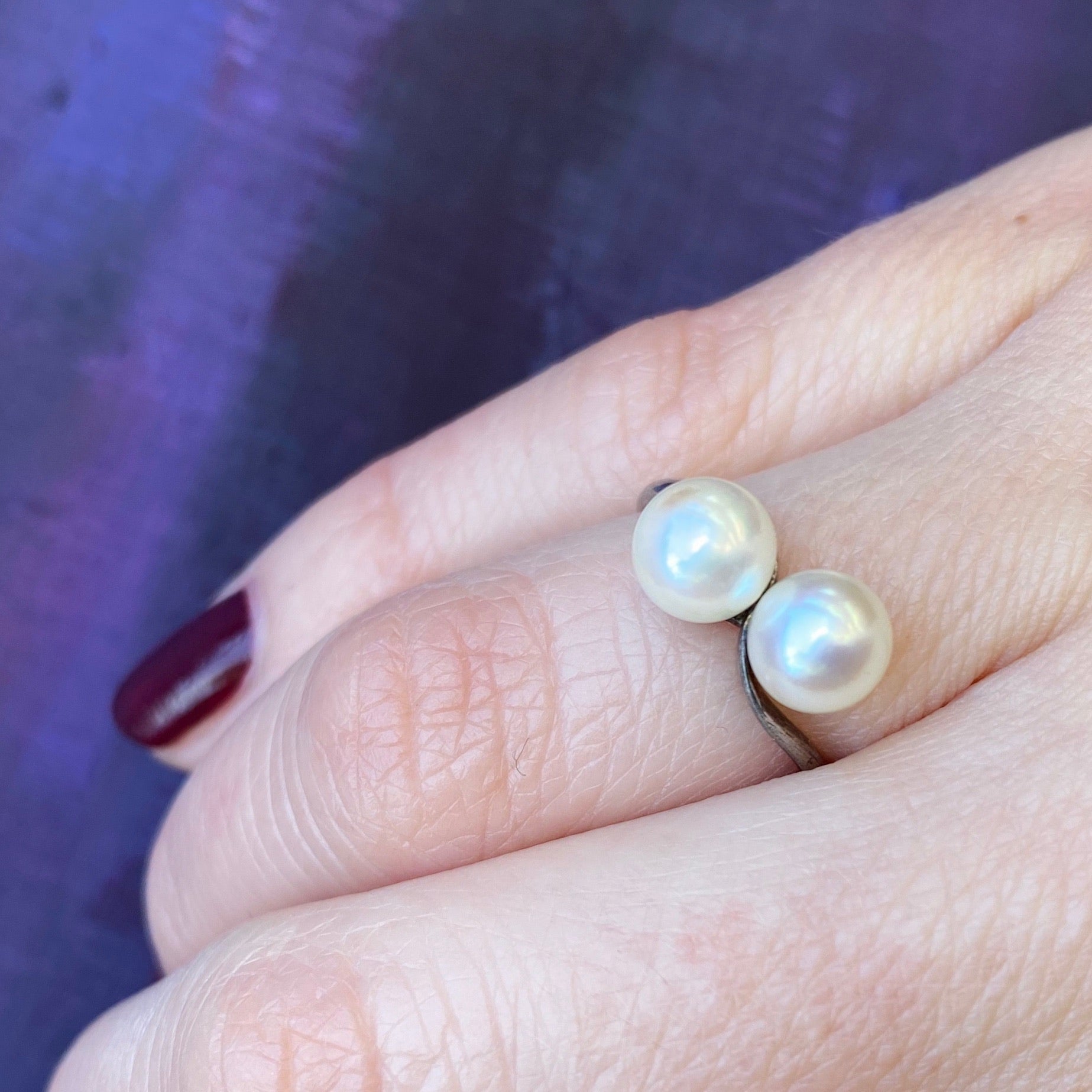 Details.....Currently a size 6.75, it can be sized for a fee. The band measures 1.9mm wide and the pearls are 6.6mm. In Very Good vintage condition. You should expect all vintage and antique jewels to show some wear, we consider it part of their charm.