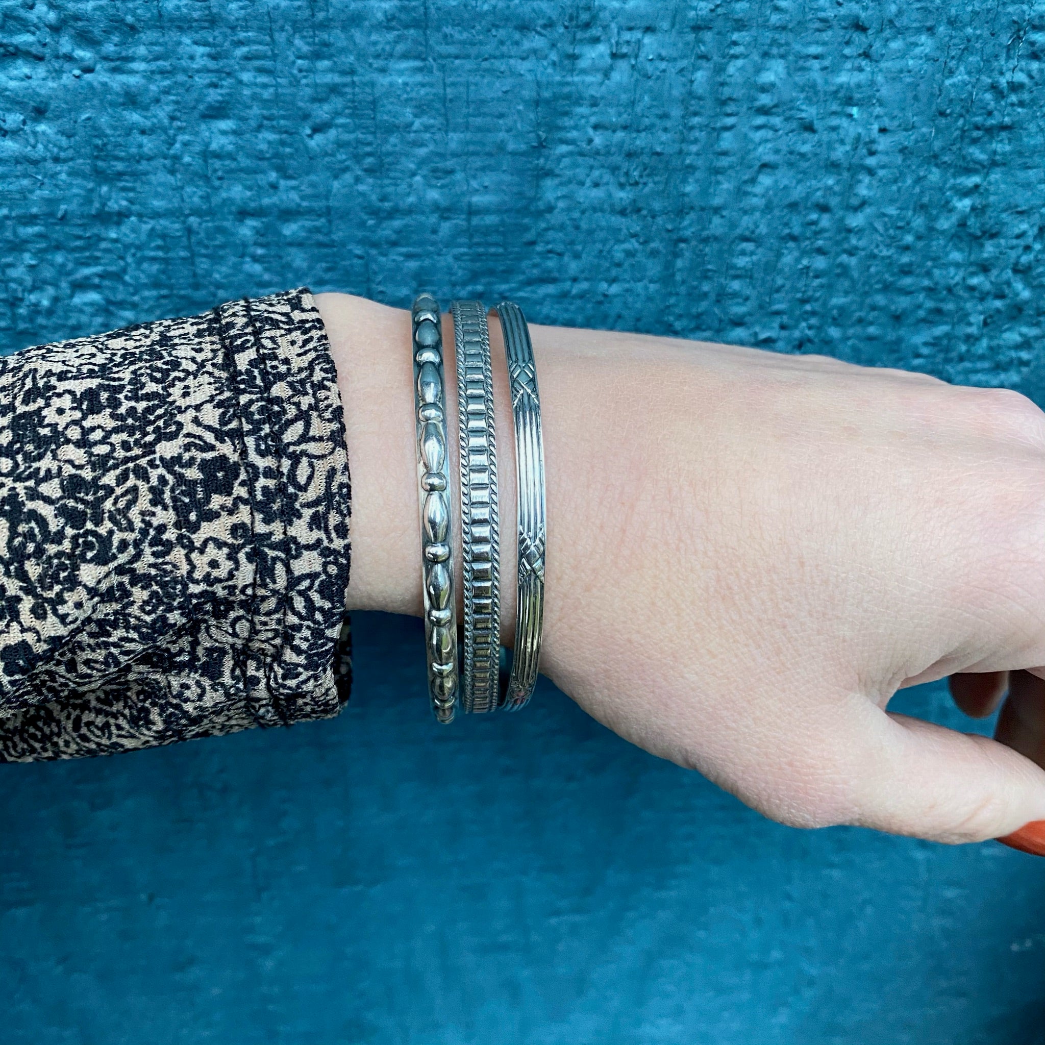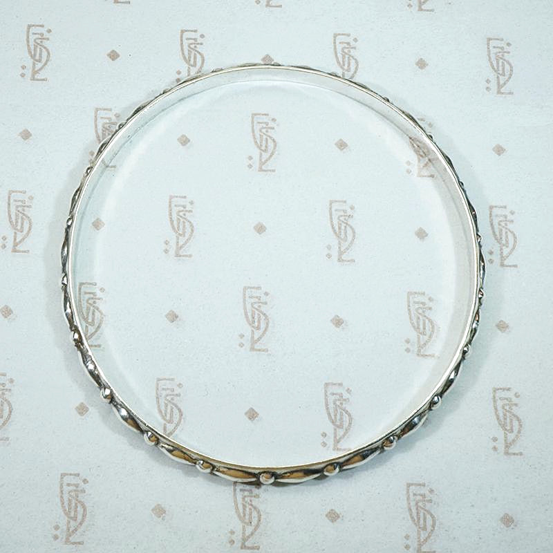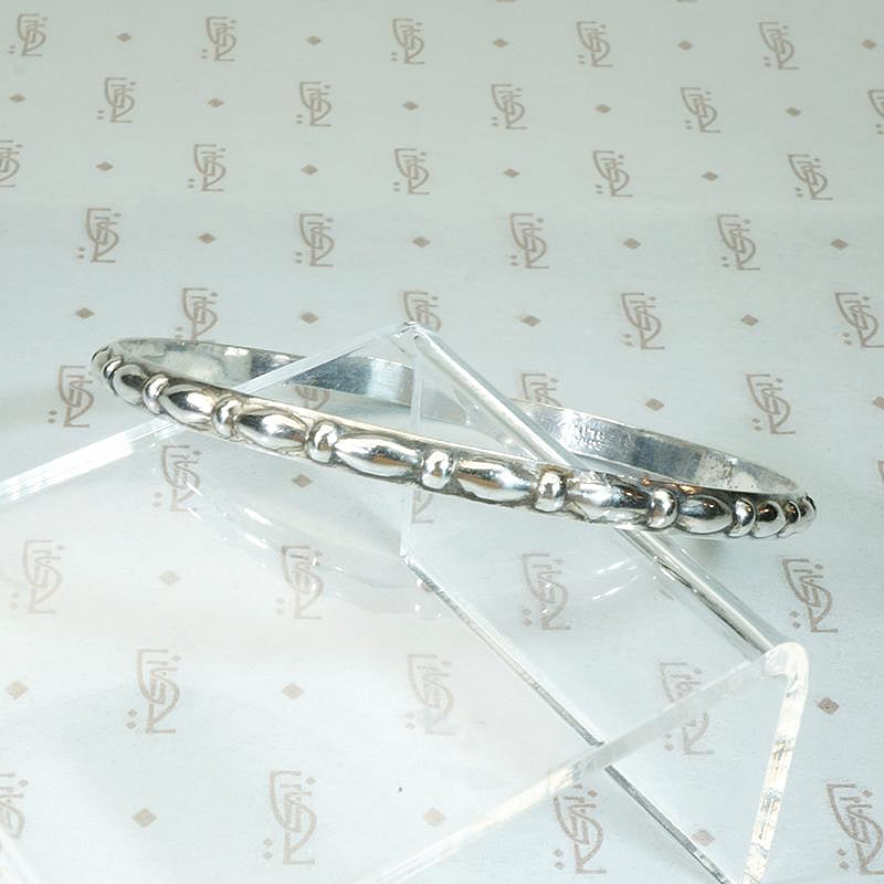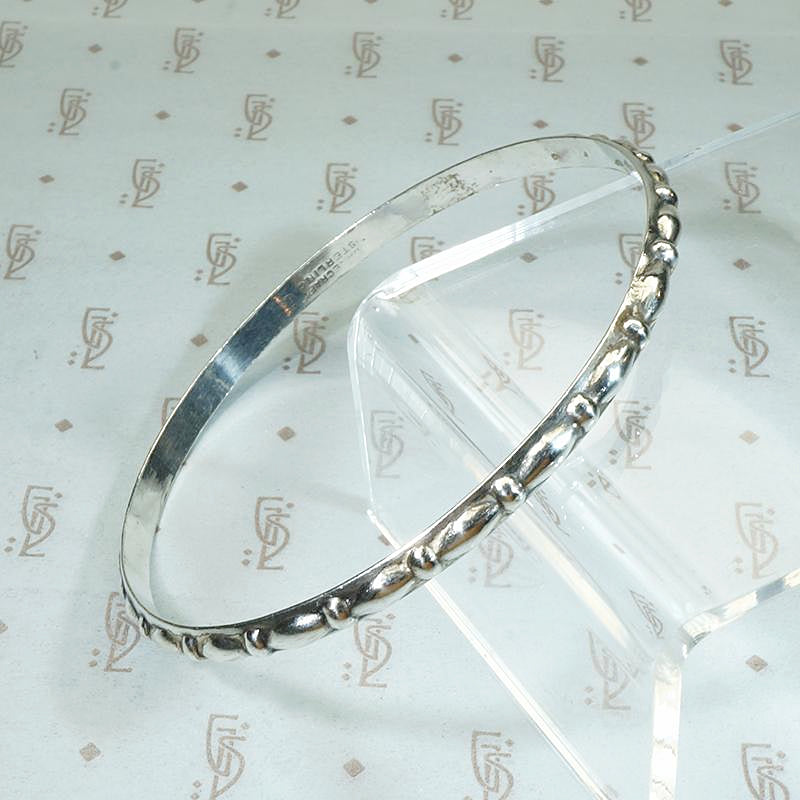 This Mid Century Danecraft sterling silver bangle has a pattern of raised diamonds and circles encircling the bracelet. This interesting bracelet will add texture and style to your bangle stack. The interior of the bracelet is stamped "Danecraft" and "Sterling." Circa 1950.